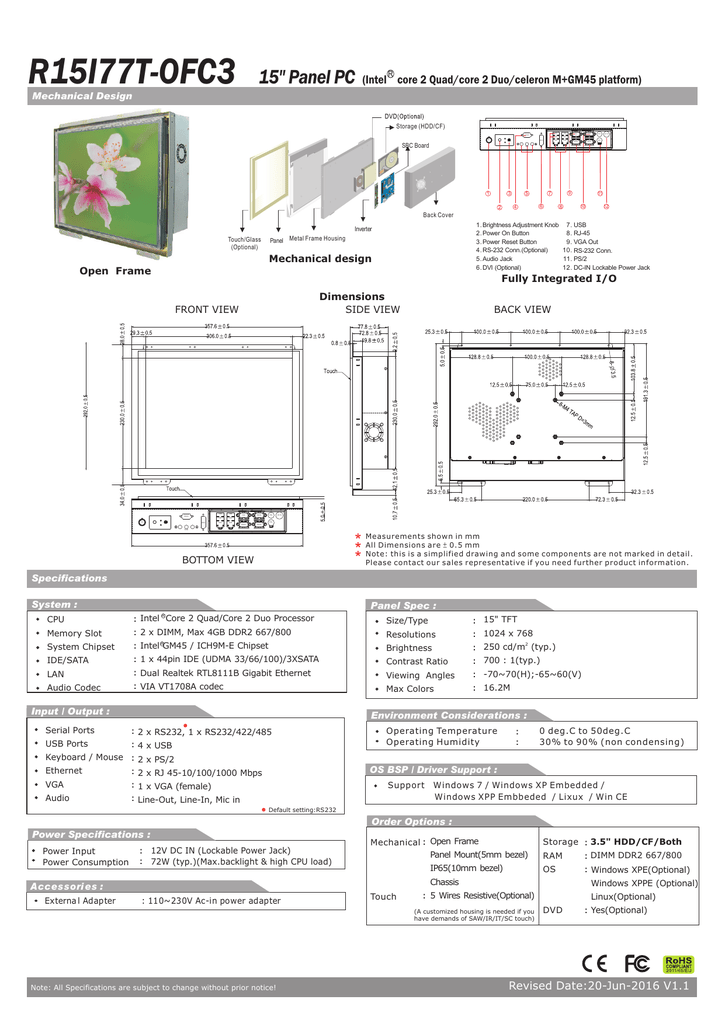 R15I77T-OFC3 15" Panel PC R (Intel core 2 Quad/core 2 Duo/celeron M+GM45 platform) Mechanical Design Storage (HDD/CF) USB USB USB USB RJ45 RJ45 RS232 VR SDVO SBC Board VGA RS232 RS232 RS232 PS2 DC IN PS2 Audio 1 6 4 9 7 5 3 2 8 11 10 12 Back Cover 1. Brightness Adjustment Knob 7. USB 2. Power On Button 8. RJ-45 3. Power Reset Button 9. VGA Out 4. RS-232 Conn.(Optional) 10. RS-232 Conn. 5. Audio Jack 11. PS/2 6. DVI (Optional) 12. DC-IN Lockable Power Jack Inverter Touch/Glass (Optional) Panel Metal Frame Housing Mechanical design Open Frame Fully Integrated I/O Dimensions SIDE VIEW FRONT VIEW USB USB USB USB RJ45 RJ45 RS232 VR SDVO VGA RS232 RS232 RS232 PS2 BACK VIEW DC IN PS2 Audio Measurements shown in mm * All Dimensions are ± 0.5 mm * Note: is a simplified drawing and some components are not marked in detail. * Pleasethis contact our sales representative if you need further product information. BOTTOM VIEW Specifications System : Panel Spec : CPU R : Intel Core 2 Quad/Core 2 Duo Processor Size/Type : 15" TFT Memory Slot : 2 x DIMM, Max 4GB DDR2 667/800 Resolutions : 1024 x 768 System Chipset : Intel RGM45 / ICH9M-E Chipset Brightness : 250 cd/m (typ.) 2 IDE/SATA : 1 x 44pin IDE (UDMA 33/66/100)/3XSATA Contrast Ratio : 700 : 1(typ.) LAN : Dual Realtek RTL8111B Gigabit Ethernet Viewing Angles : -70~70(H);-65~60(V) Audio Codec : VIA VT1708A codec Max Colors : 16.2M Input / Output : Environment Considerations : Serial Ports : 2 x RS232, 1 x RS232/422/485 USB Ports : 4 x USB Keyboard / Mouse : 2 x PS/2 Ethernet VGA Audio Operating Temperature Operating Humidity : : 0 deg.C to 50deg.C 30% to 90% (non condensing) OS BSP / Driver Support : : 2 x RJ 45-10/100/1000 Mbps : 1 x VGA (female) : Line-Out, Line-In, Mic in Support Windows 7 / Windows XP Embedded / Windows XPP Embbeded / Lixux / Win CE Default setting:RS232 Order Options : Power Specifications : Power Input Power Consumption : 12V DC IN (Lockable Power Jack) : 72W (typ.)(Max.backlight & high CPU load) Mechanical : Open Frame Panel Mount(5mm bezel) IP65(10mm bezel) OS Chassis Accessori es : Externa l Adapter Storage : 3.5" HDD/CF/Both RAM : DIMM DDR2 667/800 : 110~230V Ac-in power adapter Touch Windows XPPE (Optional) : 5 Wires Resistive(Optional) (A customized housing is needed if you have demands of SAW/IR/IT/SC touch) Note: All Specifications are subject to change without prior notice! : Windows XPE(Optional) Linux(Optional) DVD : Yes(Optional) Revised Date:20-Jun-2016 V1.1