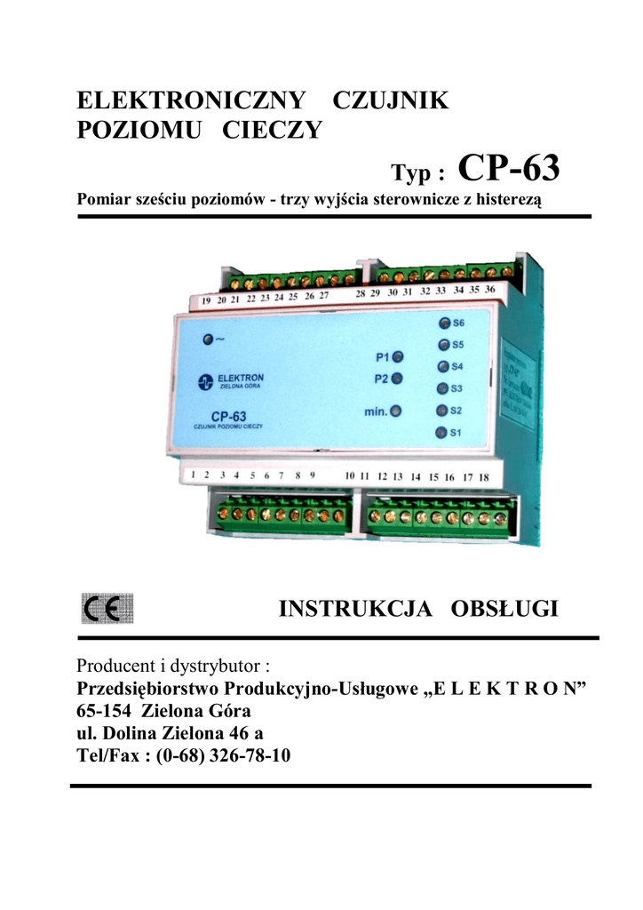 ELEKTRONICZNY CZUJNIK POZIOMU CIECZY Typ : CP-63 Pomiar sześciu poziomów - trzy wyjścia sterownicze z histerezą INSTRUKCJA OBSŁUGI Producent i dystrybutor : Przedsiębiorstwo Produkcyjno-Usługowe „E L E K T R O N” 65-154 Zielona Góra ul. Dolina Zielona 46 a Tel/Fax : (0-68) 326-78-10 1. ZASTOSOWANIE 2 Elektroniczny czujnik poziomu cieczy przeznaczony do sygnalizacji i regulacji poziomu cieczy dobrze i słabo przewodzących ( głównie do wody) w zbiornikach otwartych i zamkniętych. Czujnik może realizować następujące funkcje : pomiar sześciu poziomów cieczy – wizualizacja aktualnego poziomu -diody świecące na płycie czołowej i wyjścia do zewnętrznej wizualizacji ( np. na elewacji szafy sterowniczej) wyjścia przekaźnikowe dla każdego mierzonego poziomu (styk zwierny) dwa wyjścia przekaźnikowe ( z histerezą) do sekwencyjnego sterownia dwóch pomp napełniających zbiornik ( praca P1 między poziomami nr. 4 i 5 ,praca P2 między poziomami nr. 3 i 5) wyjście przekaźnikowe do zabezpieczenia przed suchobiegiem pompy opróżniającej zbiornik ( histereza między poziomami nr. 1 i 2) wizualizacja na płycie czołowej stanu pracy sterowanych pomp ( P1,P2, min.) W układzie sterowania pompowni dwustopniowej czujnik może sterować pracą dwóch pomp (głębinowych) napełniających zbiornik i zabezpieczać przed suchobiegiem pompy II. Czujnik przystosowany jest do współpracy z sześcioma sondami roboczymi (S1...S6) i sondą odniesienia (So). W przypadku zbiorników stalowych sondę odniesienia może stanowić obudowa zbiornika. 2. DANE TECHNICZNE napięcie zasilania : 230V - 50Hz, pobór mocy : < 7 VA, wyjścia sterownicze : trzy wyjścia przekaźnikowe -dopuszczalna obciążalność 250VAC, 1A, cos = 0,8...1 ( dwa zwierne do sterowania styczników pomp napełniających zbiornik i jedno przełączne dla zabezpieczenia przed suchobiegiem pompy opróżniającej zbiornik), : sześć wyjść przekaźnikowych – oddzielne dla każdego mierzonego poziomu –styki zwierne. Dopuszczalna obciążalność 250VAC, 1A, cos = 0,8...1, wyjścia sygnalizacyjne : sześć wyjść tranzystorowych do sygnalizacji optycznej aktualnego poziomu zbiornika np. na elewacji szafy sterowniczej. Dopuszczalna obciążalność 12V ; 0,1A ( zalecane diody świecące). wejścia sterownicze : siedem sond konduktometrycznych (dla cieczy przewodzących prąd ) – np. sondy wiszące na przewodzie typ „SW-1”, wkręcane typ „G1...4” itd. Do wejść tych można także podłączyć sondy pływakowe np. MAC-3 ( także dla cieczy nieprzewodzących ) wymiary : 106 x 90 x 58 ( sześć modułów do montażu na szynie DIN) temperatura otoczenia : 0...50C , masa : 0,40 kg . wymagania bezpieczeństwa : według PN-EN 61010-1 : 2002U. kompatybilność elektromagnetyczna : odporność na zakłócenia według PN-EN 61000-6-2 : 2003. emisja zakłóceń według PN-EN 61000-6-4 : 2002U. 3. OPIS KONSTRUKCJI Konstrukcja urządzenia umożliwia montaż na szynie 35mm. Obudowę z widokiem płyty czołowej pokazano na rys.1. Stan każdego wejścia i wyjścia sterowniczego sygnalizowany jest diodami świecącymi na płycie czołowej czujnika. Aktualny stan zbiornika pokazują diody S1...S6 : - żółte dla dolnych poziomów S1- S2 -histereza suchobiegu dioda „min.”, - zielone dla poziomów S3-S4-S5 –poziomy sterowania pomp P1 i P2, - czerwona dla poziomu S6 –przelew. Dioda „min.” (dwukolorowa) – świeci się kolorem czerwonym dla stanu suchobiegu ( blokada pompy) i zielonym dla stanu zezwolenia pracy ( deblokada pompy) 3 Rys. 1 Obudowa czujnika CP-63 z widokiem płyty czołowej. 1. obudowa z tworzywa sztucznego (ABS) 2. cztery rozłączne listwy zaciskowe 9-stykowe 3 dziesięć lampek sygnalizacyjnych (LED) 4. PODŁĄCZENIE ELEKTRYCZNE Na rys. 2 przedstawiono sposób podłączenia czujnika. Do poszczególnych zacisków należy podłączyć : 1-6 - sondy robocze S1...S6, 7 - sondę odniesienia So ( sonda zainstalowana poniżej sond roboczych), 17-18; 15-16; 13-14; 11-12; 9-10; 35-36 -wyjścia przekaźnikowe (zwierne)- kolejno dla poziomów S1...S6 ( styki zwarte i dioda świeci dla sondy zanurzonej w cieczy), 28-29 - wyjście przekaźnikowe –sterownicze pompy „P1” (pracuje między poziomami S4-S5) dioda „P1” świeci i styki wyjściowe zwarte dla stanu pracy pomp Rys.2. Schemat podłączenia czujnika CP-63. 4 30-31 – wyjście przekaźnikowe –sterownicze pompy „P2” (pracuje między poziomami S3-S5) dioda „P2” świeci i styki wyjściowe zwarte dla stanu pracy pompy, 32-33-34 – wyjście przekaźnikowe (przełączne) –zabezpieczenie przed suchobiegiem pompy opróżniającej zbiornik (styki 32-34 do obwodu pompy, styki 32-33 do obwodu alarmu- suchobieg), 21-22-23-24-25-26- wyjścia tranzystorowe –kolejno dla poziomów S6S1 -do podłączenia zewnętrznej sygnalizacji optycznej aktualnego poziomu zbiornika, 27 - zacisk wspólny dla wyjść tranzystorowych 2126, 19-20 - napięcie zasilania 230V;50Hz. 5. ZALECANE WYPOSAŻENIE DODATKOWE 5.1. Sondy konduktometryczne Do zbiorników otwartych mogą być stosowane sondy typu SW-1 ( wiszące na przewodzie) lub z wykorzystaniem głowic (G3 lub G4) z tarnamidu montowanych pionowo na górze zbiornika. Do głowic tych są dokręcane sondy prętowe ze stali kwasoodpornej (SK1 ) w odcinkach po 500mm. ( do przedłużania kolejnych prętów tulejki TK-1 z gwintem M3) Do zbiorników ciśnieniowych ( max. 10 bar) mogą być stosowane głowice ( G1; G-3A; G-3B lub G2) wykonane ze stali kwasoodpornej ( wkręcane w króciec z gwintem wewn. ½” lub 1” dla G2). Szczegółowe dane techniczne w oddzielnej karcie katalogowej. Na rys.3 i 4 pokazano przykładowo głowicę „G1” i sondę zwieszakową „SW-1”. Rys. 3 Głowica typ „G1” Rys. 4 Sonda typ SW-1” 5.2. Lampki diodowe do zewnętrznej wizualizacji poziomu. Do zewnętrznego pulpitu sterowniczego przedsiębiorstwo nasze dostarcza diody świecące o średnicy 14mm w obudowie do montażu ta