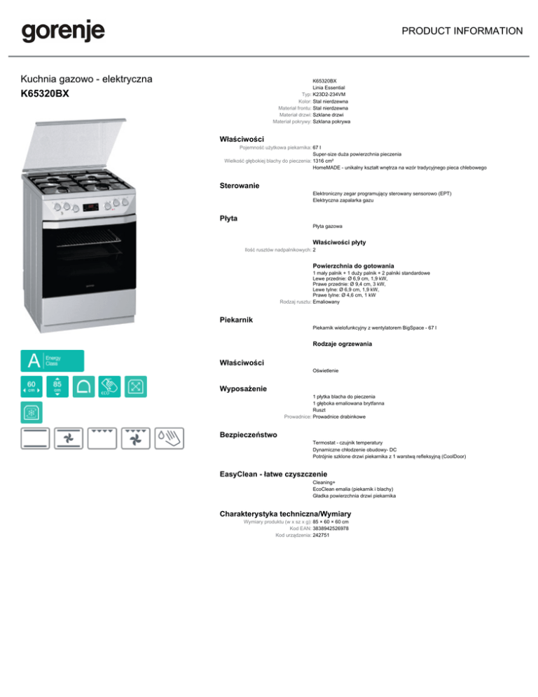 PRODUCT INFORMATION Kuchnia gazowo - elektryczna K65320BX K65320BX Linia Essential Typ: K23D2-234VM Kolor: Stal nierdzewna Materiał frontu: Stal nierdzewna Materiał drzwi: Szklane drzwi Materiał pokrywy: Szklana pokrywa Właściwości Pojemność użytkowa piekarnika: 67 l Super-size duża powierzchnia pieczenia Wielkość głębokiej blachy do pieczenia: 1316 cm² HomeMADE - unikalny kształt wnętrza na wzór tradycyjnego pieca chlebowego Sterowanie Elektroniczny zegar programujący sterowany sensorowo (EPT) Elektryczna zapalarka gazu Płyta Płyta gazowa Właściwości płyty Ilość rusztów nadpalnikowych: 2 Powierzchnia do gotowania 1 mały palnik + 1 duży palnik + 2 palniki standardowe Lewe przednie: Ø 6,9 cm, 1,9 kW, Prawe przednie: Ø 9,4 cm, 3 kW, Lewe tylne: Ø 6,9 cm, 1,9 kW, Prawe tylne: Ø 4,6 cm, 1 kW Rodzaj rusztu: Emaliowany Piekarnik Piekarnik wielofunkcyjny z wentylatorem BigSpace - 67 l Rodzaje ogrzewania Właściwości Oświetlenie Wyposażenie 1 płytka blacha do pieczenia 1 głęboka emaliowana brytfanna Ruszt Prowadnice: Prowadnice drabinkowe Bezpieczeństwo Termostat - czujnik temperatury Dynamiczne chłodzenie obudowy- DC Potrójnie szklone drzwi piekarnika z 1 warstwą refleksyjną (CoolDoor) EasyClean - łatwe czyszczenie Cleaning+ EcoClean emalia (piekarnik i blachy) Gładka powierzchnia drzwi piekarnika Charakterystyka techniczna/Wymiary Wymiary produktu (w x sz x g): 85 × 60 × 60 cm Kod EAN: 3838942526978 Kod urządzenia: 242751