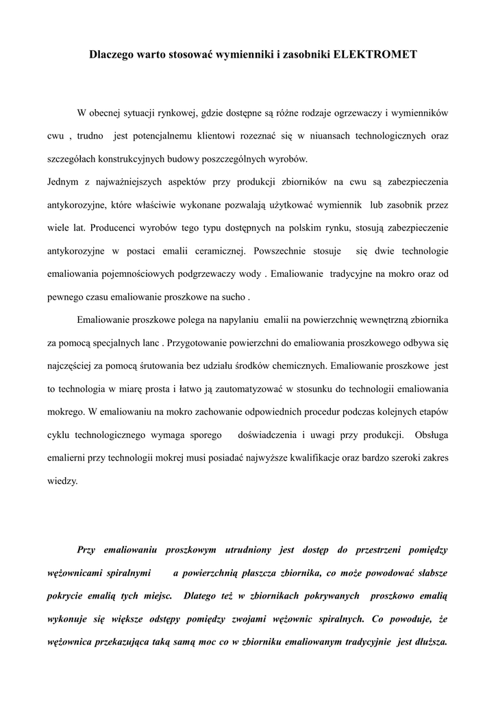 Dlaczego warto stosować wymienniki i zasobniki ELEKTROMET W obecnej sytuacji rynkowej, gdzie dostępne są różne rodzaje ogrzewaczy i wymienników cwu , trudno jest potencjalnemu klientowi rozeznać się w niuansach technologicznych oraz szczegółach konstrukcyjnych budowy poszczególnych wyrobów. Jednym z najważniejszych aspektów przy produkcji zbiorników na cwu są zabezpieczenia antykorozyjne, które właściwie wykonane pozwalają użytkować wymiennik lub zasobnik przez wiele lat. Producenci wyrobów tego typu dostępnych na polskim rynku, stosują zabezpieczenie antykorozyjne w postaci emalii ceramicznej. Powszechnie stosuje się dwie technologie emaliowania pojemnościowych podgrzewaczy wody . Emaliowanie tradycyjne na mokro oraz od pewnego czasu emaliowanie proszkowe na sucho . Emaliowanie proszkowe polega na napylaniu emalii na powierzchnię wewnętrzną zbiornika za pomocą specjalnych lanc . Przygotowanie powierzchni do emaliowania proszkowego odbywa się najczęściej za pomocą śrutowania bez udziału środków chemicznych. Emaliowanie proszkowe jest to technologia w miarę prosta i łatwo ją zautomatyzować w stosunku do technologii emaliowania mokrego. W emaliowaniu na mokro zachowanie odpowiednich procedur podczas kolejnych etapów cyklu technologicznego wymaga sporego doświadczenia i uwagi przy produkcji. Obsługa emalierni przy technologii mokrej musi posiadać najwyższe kwalifikacje oraz bardzo szeroki zakres wiedzy. Przy emaliowaniu proszkowym utrudniony jest dostęp do przestrzeni pomiędzy wężownicami spiralnymi pokrycie emalią tych miejsc. a powierzchnią płaszcza zbiornika, co może powodować słabsze Dlatego też w zbiornikach pokrywanych proszkowo emalią wykonuje się większe odstępy pomiędzy zwojami wężownic spiralnych. Co powoduje, że wężownica przekazująca taką samą moc co w zbiorniku emaliowanym tradycyjnie jest dłuższa. W przypadku zbiorników z dwiema wężownicami spiralnymi dla uzyskania tej samej mocy zbiornik musi być wyższy lub wężownice muszą mieć mniejszą moc grzewczą. ZUG ELEKTROMET stosuje do zabezpieczania antykorozyjnego wymienników technologię emaliowania na mokro. Należy dodać, że znane w branży produkcji wymienników i ogrzewaczy cwu firmy niemieckie posługują się w większości również tradycyjną metodą emaliowania na mokro. W ofercie firmy Elektromet znajduje się cała gama zbiorników stojących zabezpieczanych antykorozyjnie metodą emaliowania na mokro. Są to zbiorniki stojące o pojemnościach od 100 litrów do 1000 litrów. Wymienniki są produkowane z jedną lub z dwiema wężownicami a także ze zbiornikiem wewnątrz bufora oraz z wężownicą . Jest to tzw seria MULTI. Seria Multi to specjalny typ zbiornika, pojemnościowego ogrzewacza wody użytkowej, w którym cwu jest zgromadzona w zbiorniku znajdującym się wewnątrz zbiornika buforowego. Oczywiście istnieje również możliwość podłączenia grzałki elektrycznej. Zbiorniki serii MULTI posiadają także wężownicę do której można podłączyć układ solarny. Wykorzystanie układu solarnego do wytwarzania cwu możliwe jest we wszystkich wymiennikach stojących ZUG ELEKTROMET wyposażonych w dwie wężownice. Wychodząc naprzeciw zapotrzebowaniu rynku firma produkuje także specjalne zbiorniki serii SOL wyposażone w grupę pompową oraz sterownik elektroniczny. Wymienniki stojące produkowane przez ZUG ELEKTROMET dostępne są w izolacjach z polistyrenu ( styropianu ) oraz z pianki pouliretanowej. Odpowiednia warstwa izolacji zapewnia uzyskanie właściwej efektywności energetycznej. Należy dodać, że ZUG ELEKTROMET wykonuje izolacje ze styropianu w unikalnej technologii, gdzie zbiornik jest umieszczany w specjalnej formie, która jest zasypywana styropianem. Następnie styropian jest utwardzany pod wysokim ciśnieniem tworząc szczelną warstwę izolacyjną. ELEKTROMET nie stosuje systemu izolacji dzielonych w przypadku zbiorników o pojemnościach do 500 l. Każdy z wymienników stojących ma możliwość zamontowania grzałki elektrycznej typu EJK. W ofercie firma posiada grzałki o mocach od 1500 W do 9000W. Obudowa zewnętrzna wymienników stojących wykonywana jest w trzech odmianach w zależności od życzenia klienta. Wymienniki mogą być oferowane w obudowie z blachy malowanej proszkowo na dowolny kolor, w wersji SOL obudowy są wykonywane z twardego tworzywa sztucznego a na zamówienie mogą również być dostarczone w obudowie ze skay. Każdy z wymienników ELEKTROMET posiada króciec cyrkulacji oraz anodę magnezową . Ponieważ zarówno metoda emaliowania proszkowego jak i metoda tradycyjna nie daje 100% gwarancji pokrycia ścian zbiornika, wszystkie zbiorniki emaliowane wyposażane są w anodę magnezowa lub tytanową. Anody są nieodzownym elementem zabezpieczenia antykorozyjnego zbiorników na wypadek niewielkich ubytków emalii.