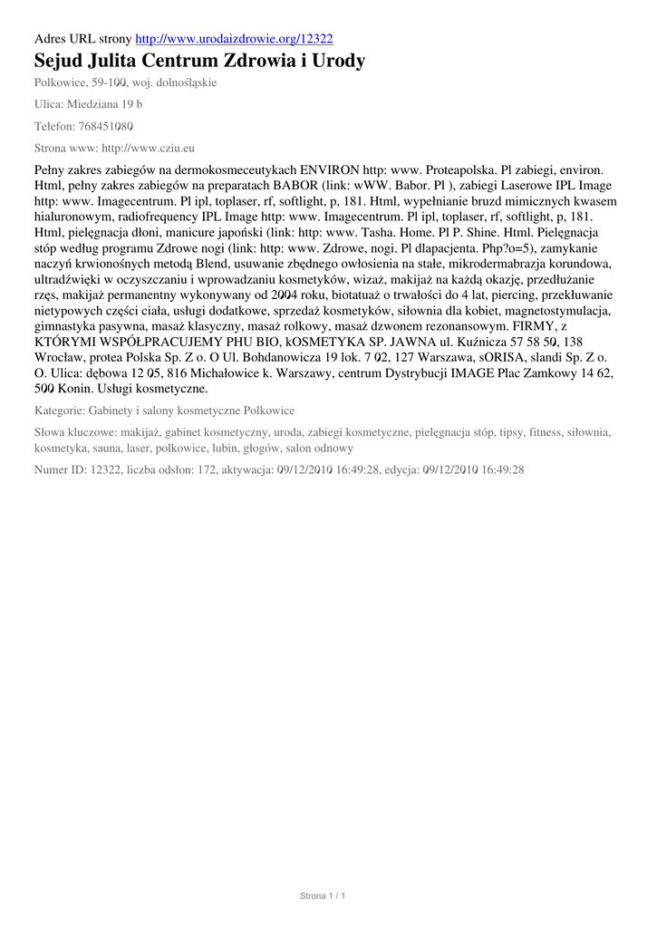 Adres URL strony http://www.urodaizdrowie.org/12322 Sejud Julita Centrum Zdrowia i Urody Polkowice, 59-100, woj. dolnośląskie Ulica: Miedziana 19 b Telefon: 768451080 Strona www: http://www.cziu.eu Pełny zakres zabiegów na dermokosmeceutykach ENVIRON http: www. Proteapolska. Pl zabiegi, environ. Html, pełny zakres zabiegów na preparatach BABOR (link: wWW. Babor. Pl ), zabiegi Laserowe IPL Image http: www. Imagecentrum. Pl ipl, toplaser, rf, softlight, p, 181. Html, wypełnianie bruzd mimicznych kwasem hialuronowym, radiofrequency IPL Image http: www. Imagecentrum. Pl ipl, toplaser, rf, softlight, p, 181. Html, pielęgnacja dłoni, manicure japoński (link: http: www. Tasha. Home. Pl P. Shine. Html. Pielęgnacja stóp według programu Zdrowe nogi (link: http: www. Zdrowe, nogi. Pl dlapacjenta. Php?o=5), zamykanie naczyń krwionośnych metodą Blend, usuwanie zbędnego owłosienia na stałe, mikrodermabrazja korundowa, ultradźwięki w oczyszczaniu i wprowadzaniu kosmetyków, wizaż, makijaż na każdą okazję, przedłużanie rzęs, makijaż permanentny wykonywany od 2004 roku, biotatuaż o trwałości do 4 lat, piercing, przekłuwanie nietypowych części ciała, usługi dodatkowe, sprzedaż kosmetyków, siłownia dla kobiet, magnetostymulacja, gimnastyka pasywna, masaż klasyczny, masaż rolkowy, masaż dzwonem rezonansowym. FIRMY, z KTÓRYMI WSPÓŁPRACUJEMY PHU BIO, kOSMETYKA SP. JAWNA ul. Kuźnicza 57 58 50, 138 Wrocław, protea Polska Sp. Z o. O Ul. Bohdanowicza 19 lok. 7 02, 127 Warszawa, sORISA, slandi Sp. Z o. O. Ulica: dębowa 12 05, 816 Michałowice k. Warszawy, centrum Dystrybucji IMAGE Plac Zamkowy 14 62, 500 Konin. Usługi kosmetyczne. Kategorie: Gabinety i salony kosmetyczne Polkowice Słowa kluczowe: makijaż, gabinet kosmetyczny, uroda, zabiegi kosmetyczne, pielęgnacja stóp, tipsy, fitness, siłownia, kosmetyka, sauna, laser, polkowice, lubin, głogów, salon odnowy Numer ID: 12322, liczba odsłon: 172, aktywacja: 09/12/2010 16:49:28, edycja: 09/12/2010 16:49:28 Strona 1 / 1