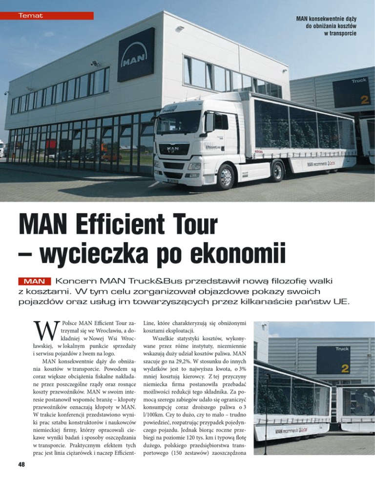 Temat MAN konsekwentnie dąży do obniżania kosztów w transporcie MAN Efficient Tour – wycieczka po ekonomii MAN Koncern MAN Truck&Bus przedstawił nową filozofię walki z kosztami. W tym celu zorganizował objazdowe pokazy swoich pojazdów oraz usług im towarzyszących przez kilkanaście państw UE. W Polsce MAN Efficient Tour zatrzymał się we Wrocławiu, a dokładniej w Nowej Wsi Wrocławskiej, w lokalnym punkcie sprzedaży i serwisu pojazdów z lwem na logo. MAN konsekwentnie dąży do obniżania kosztów w transporcie. Powodem są coraz większe obciążenia fiskalne nakładane przez poszczególne rządy oraz rosnące koszty przewoźników. MAN w swoim interesie postanowił wspomóc branżę – kłopoty przewoźników oznaczają kłopoty w MAN. W trakcie konferencji przedstawiono wyniki prac sztabu konstruktorów i naukowców niemieckiej firmy, którzy opracowali ciekawe wyniki badań i sposoby oszczędzania w transporcie. Praktycznym efektem tych prac jest linia ciężarówek i naczep Efficient48 Line, które charakteryzują się obniżonymi kosztami eksploatacji. Wszelkie statystyki kosztów, wykonywane przez różne instytuty, niezmiennie wskazują duży udział kosztów paliwa. MAN szacuje go na 29,2%. W stosunku do innych wydatków jest to najwyższa kwota, o 3% mniej kosztują kierowcy. Z tej przyczyny niemiecka firma postanowiła przebadać możliwości redukcji tego składnika. Za pomocą szeregu zabiegów udało się ograniczyć konsumpcję coraz droższego paliwa o 3 l/100km. Czy to dużo, czy to mało – trudno powiedzieć, rozpatrując przypadek pojedynczego pojazdu. Jednak biorąc roczne przebiegi na poziomie 120 tys. km i typową flotę dużego, polskiego przedsiębiorstwa transportowego (150 zestawów) zaoszczędzona kwota może sięgać 2 mln złotych. To 5 kompletnych zestawów rocznie sfinansowanych za darmo! Aby osiągnąć taki wynik MAN wskazuje na cztery elementy składowe: aerodynamikę, opory toczenia, tarcie wewnętrzne i zachowanie kierowcy. Na każdą z tych bolączek MAN przygotował rozwiązanie. Pierwszym wrogiem ekonomii jest opór powietrza. Niestety, kształt kabiny oraz rozmiary naczepy pozostaną jeszcze przez lata takie same. Opór rośnie z kwadratem prędkości, tzn. przy podwójnej prędkości oddziałuje poczwórny opór powietrza. MAN proponuje dlatego obniżenie prędkości - 85 zamiast 89 km/ h oznacza, że przy 9,5-godzinnym czasie jazdy daje to 38 kilometrów mniej pokonanego dystansu, ale przy niższym zużyciu paliwa o niemal 19 litrów. Ważne jest także zdemontowanie ozdobników w postaci rur i dodatkowych halogenów, gdyż konsumują one nawet litr na 100 km. W zamian za to MAN proponuje aerodynamiczne osłony, które też mogą dodawać uroku pojazdowi. Nieco trudniej będzie kierowcy po usunięciu osłony przeciwsłonecznej, ale nie ma nic za darmo – ona także stawia opór. Także wybór rodzaju kabiny znacząco wpływa na poziom zużycia paliwa. Kabiny wysokie stawiają niższe opory, gdyż w przeciwieństwie do niższych z owiewkami nie posiadają szczelin technologicznych, w których „kotłuje” się powietrze. Różnica ta może sięgać nawet 5%. Dlatego MAN zaleca stosowanie kabin o wysokości dopasowanej do wysokości Doświadczenie MAN w szkoleniach sięga około 30 lat naczepy. W przypadku naczep wywrotek należy jednak pamiętać o stosowaniu optymalnego spoilera lub/i plandeki nad ładownią, w celu obniżenia oporów powietrza. Nieprawidłowe ustawienie spoilera owocuje zużyciem większym o 3%. Opory toczenia to głównie wina opon. Z jednej strony muszą zapewnić przyczepność, z drugiej strony przyczepność podnosi konsumpcję paliwa. Ciśnienie mniejsze o 2 bary w jednej oponie może spowodować zużycie paliwa wyższe o 0,2 l/100 km. Dużą pomocą może być układ monitorowania ciśnienia, minimalizujący kosztowne awarie. Na podstawie wyników własnych badań MAN zaleca używanie ogumienia Wszelkie statystyki kosztów, wykonywane przez różne instytuty, niezmiennie wskazują duży udział kosztów paliwa Michelin z rodziny Savergreen. Oprócz odpowiedniej opony masa własna pojazdu powinna być możliwie jak najniższa. Tarcie wewnętrzne, czy inaczej opory urządzeń dodatkowych także odbywają się kosztem paliwa. Optymalnym celem jest uruchamianie ich jedynie wówczas, gdy są potrzebne, albo stale, aby praca w trybie ciągłym odbywała się przy minimalnym oporze. Dlatego MAN zaleca zastosowanie pompy powietrza tylko wtedy, gdy ma ona sprężać powietrze. Innym elementem jest korzystanie ze świateł do jazdy dziennej, zużywających 42 watów energii zamiast 300 watów przy klasycznym oświetleniu. Przeciwnikiem nr 4 jest niewłaściwe obchodzenie się z pojazdem oraz niepotrzebnie lub zbędnie przejechane kilometry. Po przeszkoleniu kierowcy w zakresie oszczędnej jazdy efekty i zmiany można śledzić w systemie Telematic. W ten sposób można w konsekwentny sposób szkolić, ale także premiować kierowców. Oferta MAN pod tym względem także jest interesująca. Doświadczenie MAN w szkoleniach sięga około 30 lat. Koncern posiada uznany ośrodek dokształcania zgodny z Dyrektywą UE, dotyczącą kierowców zawodowych oraz 33 trenerów w Niemczech, 25 trenerów w Europie, 20 trenerów w krajach zamorskich. Po konferencji zaproszeni goście mogli przejechać się pojazdami EfficientLine oraz skorzystać z porad wykwalifikowanych trenerów jazdy. Grzegorz Teperek 49