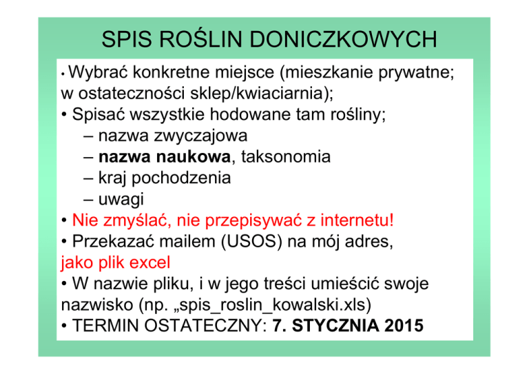 SPIS ROŚLIN DONICZKOWYCH • Wybrać konkretne miejsce (mieszkanie prywatne; w ostateczności sklep/kwiaciarnia); • Spisać wszystkie hodowane tam rośliny; – nazwa zwyczajowa – nazwa naukowa, taksonomia – kraj pochodzenia – uwagi • Nie zmyślać, nie przepisywać z internetu! • Przekazać mailem (USOS) na mój adres, jako plik excel • W nazwie pliku, i w jego treści umieścić swoje nazwisko (np. „spis_roslin_kowalski.xls) • TERMIN OSTATECZNY: 7. STYCZNIA 2015