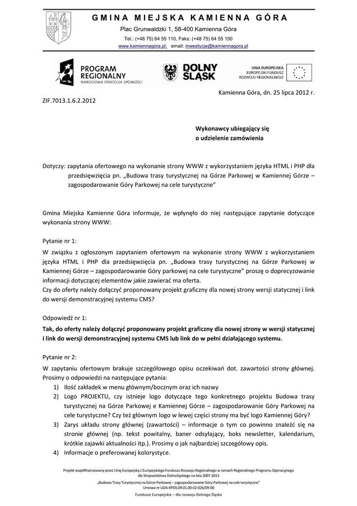 GMINA MIEJSKA KAMIENNA GÓRA Plac Grunwaldzki 1, 58-400 Kamienna Góra Tel.: (+48 75) 64 55 110, Faks: (+48 75) 64 55 150 www.kamiennagora.pl; email: [email protected] Kamienna Góra, dn. 25 lipca 2012 r. ZIF.7013.1.6.2.2012 Wykonawcy ubiegający się o udzielenie zamówienia Dotyczy: zapytania ofertowego na wykonanie strony WWW z wykorzystaniem języka HTML i PHP dla przedsięwzięcia pn. „Budowa trasy turystycznej na Górze Parkowej w Kamiennej Górze – zagospodarowanie Góry Parkowej na cele turystyczne” Gmina Miejska Kamienne Góra informuje, że wpłynęło do niej następujące zapytanie dotyczące wykonania strony WWW: Pytanie nr 1: W związku z ogłoszonym zapytaniem ofertowym na wykonanie strony WWW z wykorzystaniem języka HTML i PHP dla przedsięwzięcia pn. „Budowa trasy turystycznej na Górze Parkowej w Kamiennej Górze – zagospodarowanie Góry parkowej na cele turystyczne” proszę o doprecyzowanie informacji dotyczącej elementów jakie zawierać ma oferta. Czy do oferty należy dołączyć proponowany projekt graficzny dla nowej strony wersji statycznej i link do wersji demonstracyjnej systemu CMS? Odpowiedź nr 1: Tak, do oferty należy dołączyć proponowany projekt graficzny dla nowej strony w wersji statycznej i link do wersji demonstracyjnej systemu CMS lub link do w pełni działającego systemu. Pytanie nr 2: W zapytaniu ofertowym brakuje szczegółowego opisu oczekiwań dot. zawartości strony głównej. Prosimy o odpowiedzi na następujące pytania: 1) Ilość zakładek w menu głównym/bocznym oraz ich nazwy 2) Logo PROJEKTU, czy istnieje logo dotyczące tego konkretnego projektu Budowa trasy turystycznej na Górze Parkowej e Kamiennej Górze – zagospodarowanie Góry Parkowej na cele turystyczne? Czy też głównym logo w lewej części strony ma być logo Kamiennej Góry? 3) Zarys układu strony głównej (zawartości) – informacje o tym co powinno znaleźć się na stronie głównej (np. tekst powitalny, baner odsyłający, boks newsletter, kalendarium, krótkie zajawki aktualności itp.). Prosimy o jak najbardziej szczegółowy opis. 4) Informacje o preferowanej kolorystyce. Projekt współfinansowany przez Unię Europejską z Europejskiego Funduszu Rozwoju Regionalnego w ramach Regionalnego Programu Operacyjnego dla Województwa Dolnośląskiego na lata 2007-2013 „Budowa Trasy Turystycznej na Górze Parkowej – zagospodarowanie Góry Parkowej na cele turystyczne” Umowa nr UDA-RPDS.09.01.00-02-026/09-00 Fundusze Europejskie – dla rozwoju Dolnego Śląska Odpowiedź na 2: Zamawiający informuje, że: 1) Na stronie ma znajdować się 5/6 zakładek standardowych, m.in.: galeria, aktualności, kontakt; 2) Nie ma logo dla tego konkretnego projektu, głównym logo będzie logo Kamiennej Góry; 3) Zarys układu strony pozostawia w gestii projektanta strony; 4) Nie ma preferowanej kolorystyki, winna ona nawiązywać do charakteru i przedmiotu inwestycji. Odpowiedź jest wiążąca dla stron. Z poważaniem: Z up. Burmistrza Miasta Kamiennej Góry Zastępca Burmistrza /-/ Kazimierz Kawa Sprawę prowadzi: Urząd Miasta Kamienna Góra Wydział Zamówień Publicznych, Inwestycji i Funduszy Zewnętrznych Katarzyna Kwiatkowska, pok. 308 tel. 75 64 55 125 e-mail: [email protected] Otrzymują: 1. Adresat 2. a/a Projekt współfinansowany przez Unię Europejską z Europejskiego Funduszu Rozwoju Regionalnego w ramach Regionalnego Programu Operacyjnego dla Województwa Dolnośląskiego na lata 2007-2013 „Budowa Trasy Turystycznej na Górze Parkowej – zagospodarowanie Góry Parkowej na cele turystyczne” Umowa nr UDA-RPDS.09.01.00-02-026/09-00 Fundusze Europejskie – dla rozwoju Dolnego Śląska 2