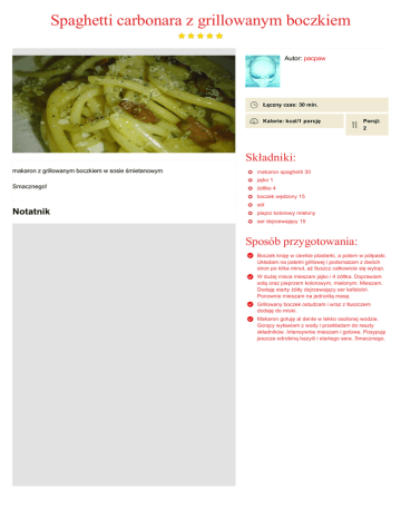 Spaghetti carbonara z grillowanym boczkiem Autor: pacpaw Łączny czas: 30 min. Kalorie: kcal/1 porcję Porcji: 2 Składniki: makaron z grillowanym boczkiem w sosie śmietanowym makaron spaghetti 30 jajko 1 Smacznego! żółtko 4 boczek wędzony 15 sól Notatnik pieprz kolorowy mielony ser dojrzewający 15 Sposób przygotowania: Boczek kroję w cienkie plasterki, a potem w półpaski. Układam na patelni grillowej i podsmażam z dwóch stron po kilka minut, aż tłuszcz całkowicie się wytopi. W dużej misce mieszam jajko i 4 żółtka. Doprawiam solą oraz pieprzem kolorowym, mielonym. Mieszam. Dodaję starty żółty dojrzewający ser kefalotiri. Ponownie mieszam na jednolitą masę. Grillowany boczek ostudzam i wraz z tłuszczem dodaję do miski. Makaron gotuję al dente w lekko osolonej wodzie. Gorący wyławiam z wody i przekładam do reszty składników. Intensywnie mieszam i gotowe. Posypuję jeszcze odrobiną bazylii i startego sera. Smacznego.