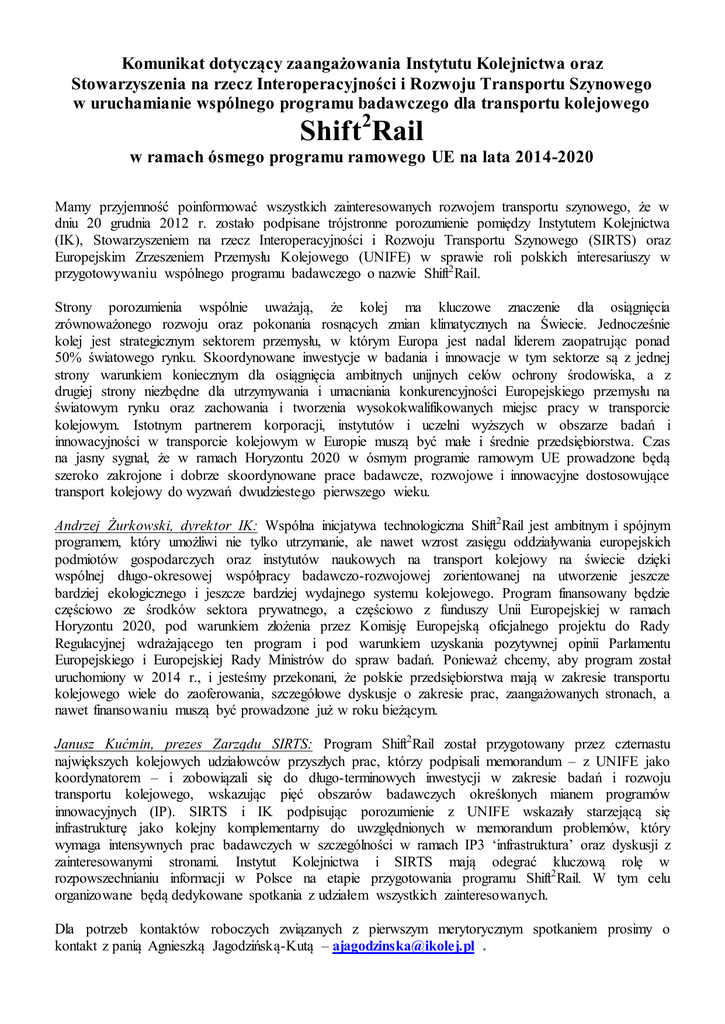 Komunikat dotyczący zaangażowania Instytutu Kolejnictwa oraz Stowarzyszenia na rzecz Interoperacyjności i Rozwoju Transportu Szynowego w uruchamianie wspólnego programu badawczego dla transportu kolejowego Shift2Rail w ramach ósmego programu ramowego UE na lata 2014-2020 Mamy przyjemność poinformować wszystkich zainteresowanych rozwojem transportu szynowego, że w dniu 20 grudnia 2012 r. zostało podpisane trójstronne porozumienie pomiędzy Instytutem Kolejnictwa (IK), Stowarzyszeniem na rzecz Interoperacyjności i Rozwoju Transportu Szynowego (SIRTS) oraz Europejskim Zrzeszeniem Przemysłu Kolejowego (UNIFE) w sprawie roli polskich interesariuszy w przygotowywaniu wspólnego programu badawczego o nazwie Shift2 Rail. Strony porozumienia wspólnie uważają, że kolej ma kluczowe znaczenie dla osiągnięcia zrównoważonego rozwoju oraz pokonania rosnących zmian klimatycznych na Świecie. Jednocześnie kolej jest strategicznym sektorem przemysłu, w którym Europa jest nadal liderem zaopatrując ponad 50% światowego rynku. Skoordynowane inwestycje w badania i innowacje w tym sektorze są z jednej strony warunkiem koniecznym dla osiągnięcia ambitnych unijnych celów ochrony środowiska, a z drugiej strony niezbędne dla utrzymywania i umacniania konkurencyjności Europejskiego przemysłu na światowym rynku oraz zachowania i tworzenia wysokokwalifikowanych miejsc pracy w transporcie kolejowym. Istotnym partnerem korporacji, instytutów i uczelni wyższych w obszarze badań i innowacyjności w transporcie kolejowym w Europie muszą być małe i średnie przedsiębiorstwa. Czas na jasny sygnał, że w ramach Horyzontu 2020 w ósmym programie ramowym UE prowadzone będą szeroko zakrojone i dobrze skoordynowane prace badawcze, rozwojowe i innowacyjne dostosowujące transport kolejowy do wyzwań dwudziestego pierwszego wieku. Andrzej Żurkowski, dyrektor IK: Wspólna inicjatywa technologiczna Shift2 Rail jest ambitnym i spójnym programem, który umożliwi nie tylko utrzymanie, ale nawet wzrost zasięgu oddziaływania europejskich podmiotów gospodarczych oraz instytutów naukowych na transport kolejowy na świecie dzięki wspólnej długo-okresowej współpracy badawczo-rozwojowej zorientowanej na utworzenie jeszcze bardziej ekologicznego i jeszcze bardziej wydajnego systemu kolejowego. Program finansowany będzie częściowo ze środków sektora prywatnego, a częściowo z funduszy Unii Europejskiej w ramach Horyzontu 2020, pod warunkiem złożenia przez Komisję Europejską oficjalnego projektu do Rady Regulacyjnej wdrażającego ten program i pod warunkiem uzyskania pozytywnej opinii Parlamentu Europejskiego i Europejskiej Rady Ministrów do spraw badań. Ponieważ chcemy, aby program został uruchomiony w 2014 r., i jesteśmy przekonani, że polskie przedsiębiorstwa mają w zakresie transportu kolejowego wiele do zaoferowania, szczegółowe dyskusje o zakresie prac, zaangażowanych stronach, a nawet finansowaniu muszą być prowadzone już w roku bieżącym. Janusz Kućmin, prezes Zarządu SIRTS: Program Shift2 Rail został przygotowany przez czternastu największych kolejowych udziałowców przyszłych prac, którzy podpisali memorandum – z UNIFE jako koordynatorem – i zobowiązali się do długo-terminowych inwestycji w zakresie badań i rozwoju transportu kolejowego, wskazując pięć obszarów badawczych określonych mianem programów innowacyjnych (IP). SIRTS i IK podpisując porozumienie z UNIFE wskazały starzejącą się infrastrukturę jako kolejny komplementarny do uwzględnionych w memorandum problemów, który wymaga intensywnych prac badawczych w szczególności w ramach IP3 ‘infrastruktura’ oraz dyskusji z zainteresowanymi stronami. Instytut Kolejnictwa i SIRTS mają odegrać kluczową rolę w rozpowszechnianiu informacji w Polsce na etapie przygotowania programu Shift2 Rail. W tym celu organizowane będą dedykowane spotkania z udziałem wszystkich zainteresowanych. Dla potrzeb kontaktów roboczych związanych z pierwszym merytorycznym spotkaniem prosimy o kontakt z panią Agnieszką Jagodzińską-Kutą – [email protected] .