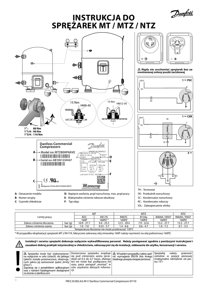 INSTRUKCJA DO sPRĘżAREK MT / MTZ / NTZ C C S R S R Nigdy nie uruchamiać sprężarek bez zamontowanej osłony puszki zaciskowej 1 ~ PSC 230 V C TH IOL 15 Nm 15 Nm HM8-40 S RC R HM12-50 230 V 1 ~ CSR SR C TH 5 1" : 80 Nm 1"1/4 : 90 Nm 1"3/4 : 110 Nm IOL 2 RC S 1 R SC A IOL D E B 3~ F C A:Oznaczenie modelu B:Numer seryjny C:Czynniki chłodnicze D: Napięcie zasilania, prąd rozruchowy, max. prąd pracy E:Maksymalne ciśnienie robocze obudowy F: Typ oleju TH : Termostat SR : Przekaźnik rozruchowy SC : Kondensator rozruchowy RC : Kondensator roboczy IOL : Zabezpieczenie silnika MT MTZ R22 R417A R407C R134a R404A / R507 160P 160PZ * 160PZ 160PZ 160PZ Zakres ciśnienia tłoczenia bar (g) 10.9 - 27.7 9.4 - 25.5 12.5 - 29.4 7.9 - 22.6 13.2 - 27.7 Zakres ciśnienia ssania bar (g) 1.0 - 7.0 0.55 - 5.7 1.4 - 6.6 0.6 - 4.7 1.0 - 7.2 Temperatura tłoczenia nie może przekraczać 130°C * W przypadku eksploatacji sprężarek MT z R417A, fabrycznie zalewany olej mineralny 160P należy wymienić na olej poliestrowy 160PZ. Limity pracy NTZ R404A / R507 160PZ 13.2 - 27.7 0.1 - 3.3 Instalacji i serwisu sprężarki dokonuje wyłącznie wykwalifikowany personel. Należy postępować zgodnie z poniższymi instrukcjami i zasadami dobrej praktyki inżynierskiej w chłodnictwie, odnoszącymi się do instalacji, oddawania do użytku, konserwacji i serwisu. Sprężarka może być wykorzystywana wyłącznie w celu (celach), do jakiego (jakich) została przeznaczona, obejmujących zakres jej zastosowań (patrz „limity pracy”). Zapoznaj się z poradnikiem aplikacyjnym oraz z kartami katalogowymi dostępnymi na stronie cc.danfoss.com 1 Dostarczona sprężarka znajduje W każdym przypadku należy spełsię pod ciśnieniem azotu (prze- nić wymagania EN378 (lub innego dział od 0,3 do 0,7 bara), dlatego lokalnego przepisu bezpieczeństwa). też nie może być podłączana od razu; patrz paragraf „montaż” w celu uzyskania dalszych informacji. FRCC.EI.002.A2.49 © Danfoss Commercial Compressors 07/10 Sprężarkę należy przenosić ostrożnie w pozycji pionowej (maksymalne odchylenie od pionu: 15°) INSTRUKCJA 1 – Wstęp Poniższa instrukcja odnosi się do sprężarek tłokowych Maneurop typu MT, MTZ i NTZ, stosowanych z czynnikami R404A/R507A. Zawiera informacje dotyczące bezpieczeństwa pracy oraz obsługi i instalacji sprężarek. 2 – Transport i magazynowanie • Urządzenia powinny być transportowane ze szczególną ostrożnością. Do manewrowania sprężarką służą specjalne uchwyty w opakowaniu. Należy używać odpowiednich i bezpiecznych podnośników podczas przewożenia i rozpakowywania. • Sprężarkę należy przechowywać i transportować podstawą do dołu. • Sprężarkę można wyłącznie magazynować w temperaturze od -35°C do 50°C. • Należy się upewnić, czy urządzenie i jego opakowanie nie jest narażone na bezpośrednie działanie deszczu, czynników łatwopalnych oraz powodujących korozję. 3 – Zachowane środki bezpieczeństwa przed rozpoczęciem montażu Sprężarki nigdy nie powinny być stosowane w atmosferze palnej i wybuchowej. • Temperatura otoczenia podczas postoju urządzenia nie może przekroczyć 50°C. • Z amontować sprężarkę na poziomej, płaskiej powierzchni, o kącie nachylenia mniejszym niż 3°. • Sprawdzić czy parametry napięcia zasilania odpowiadają wymaganiom silnika (patrz tabliczka znamionowa). • Podczas montażu sprężarek MTZ lub NTZ, używać sprzętu specjalnie przeznaczonego do czynników chłodniczych HFC, który nigdy nie był używany do czynników CFC. • Stosować tylko czyste i osuszone rury miedziane. Połączenia wykonywać z lutu z dodatkiem srebra. • Wszystkie komponenty systemu chłodniczego powinny być czyste i osuszone. • Rurociąg podłączony do sprężarki powinien być podatny w trzech wymiarach, aby tłumić drgania. 4 – Montaż • Powoli wypuścić azot z płaszcza sprężarki używając zaworu Shradera. • Usunąć uszczelki podczas lutowania przyłączy rotolock. • Zawsze używać nowych uszczelek podczas montażu. • Podłączyć sprężarkę do układu tak szybko, jak to możliwe, aby uniknąć zanieczyszczenia oleju wilgocią z otoczenia. • Należy upewnić się, że żadne elementy materiału rur nie dostały się do wnętrza rurociągów podczas ich cięcia. Ponadto niedopuszczalne jest wiercenie otworów w rurociągach już zmontowanych. • Połączenia lutowane powinny być wykonywane ze szczególna starannością. Podczas lutowania należy zapewnić przepływ azotu wewnątrz rurociągu. • Podłączyć wszystkie urządzenia zabezpieczające i sterujące. Gdy wykorzystywany jest zawór Schradera, usunąć wewnętrzny zawór. 5 – Wykrywanie nieszczelności Nigdy nie wykorzystywać do próby ciśnieniowej czystego tlenu lub powietrza. Może to spowodować pożar lub eksplozję. • Nie używać barwnika do wykrywania wycieków. • Testy szczelnościowe przeprowadzać na kompletnym systemie. • Ciśnienie próbne po stronie ssawnej nie może przekroczyć 25 bar. • W przypadku wykrycia nieszczelności, należy ją usunąć i powtórzyć od początku całą procedurę testu szczelności. 6 – Próżniowanie • Nigdy nie używać sprężarki do wytworzenia próżni w układzie. • Podłączyć pompę próżniową do strony ssawnej i tłocznej. • Opróżnić układ do ciśnienia absolutnego 500 µm Hg (0,67 mbar). FRCC.EI.002.A2.49 -July. 2010 • Nie wolno używać megaomomierza, ani podawać napięcia na uzwojenia silnika sprężarki podczas występowania próżni, ze względu na niebezpieczeństwo uszkodzenia (przepalenia uzwojeń) silnika sprężarki. 7 – Połączenia elektryczne • Przed wykonywaniem połączeń elektrycznych odłączyć i zaizolować główne żródło zasilania. Zapoznać się ze szczegółowymi informacjami na odwrocie strony. • Sprężarka jest wyposażona w wewnętrzne zabezpieczenie silnika przed przegrzaniem i przeciążeniem. Zewnętrzne zab