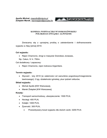 Apollo Michał, [email protected] Żołądek Marek, [email protected] KOMISJA WSPINACZKI WYSOKOGÓWSKIEJ POLSKIEGO ZWIĄZKU ALPINIZMU Zwracamy się z uprzejmą prośbą o zatwierdzenie i dofinansowanie wyjazdu w Alpy [zima] 2010. Cel wyjazdu: Rejon Chamonix, drogi w masywie Grandess Jorasses, Np. Całun, IV 4. 750m. Cel dodatkowy / zapasowy: Rejon Chamonix, rejon lodowca Argentiere. Termin wyjazdu: Styczeń - luty 2010 [w zależności od warunków pogodowych/zagrożenia lawinowego]. 2 tyg. działalności górskiej, plus tydzień skiturów. Skład wyjazdu: Michał Apollo [KW Warszawa], Marek Żołądek [KW Warszawa]. Koszty: Transport samochodowy, ubezpieczenie: 1500 PLN, Noclegi: 400 PLN, Kolejki: 1000 PLN, Żywność: 300 PLN, Przewidywany koszt wyjazdu dla dwóch osób: 3200 PLN. Zasady finansowania: Udział własny 950 PLN / osobę, PZA: 650 / osobę, 1300 PLN zespół. Wcześniejsze dofinansowania z PZA: Marek Żołądek Wspinanie lodowe w Dolinie Gastein 2006, Dolina Miyar w Himalajach 2006, Wspinanie Lodowe w okolicach Chamonix 2009. Michał Apollo Wspinanie Lodowe w okolicach Chamonix 2009. Wykaz przejść uczestników w bazie PZA. Z taternickim pozdrowieniem Michał Apollo, Marek Żołądek. Marek Żołądek Michał Apollo Absolwent geografii Uniwersytetu Pedagogicznego w Krakowie, członek Koła Naukowego Geografów, Klubu Wysokogórskiego Warszawa oraz Polskiego Towarzystwa Geograficznego. Organizator i uczestnik wyjazdów w różne rejony świata, wliczając Himalaje, Andy, góry Alaski, Afryki, Europy, Kaukazu, Australii oraz Góry Skaliste. Zapalony podróżnik, pasjonat fotografii, autor licznych artykułów i prelekcji. Na wyjazdach prócz wspinaczki zajmuje się badaniami z dziedziny ochrony środowiska. Zdobywca dziewiczego szczytu Himalajach – Masala Peak 5650 m n.p.m., – za który został nominowany do prestiżowej nagrody środowiska wspinaczkowego "Jedynka". W W W . M A S A L A P E A K . C O M Absolwent geografii Uniwersytetu Pedagogicznego w Krakowie, członek, Klubu Wysokogórskiego Warszawa, Polskiego Towarzystwa Geograficznego oraz Koła Naukowego Geografów. Uczestnik oraz współorganizator wypraw wspinaczkowo – naukowych na 6 kontynentach m. in. w Himalaje, Andy, góry Alaski, Afryki, Europy, Kaukazu, Góry Skaliste, Ziemię Ognistą oraz Australię. Zajmuję się profesjonalnie wspinaczką wysokogórską. Zdobywca dziewiczego szczytu w Himalajach – Masala Peak 5650 m n.p.m., – za który został nominowany do prestiżowej nagrody środowiska wspinaczkowego "Jedynka". Inne pasje to rower oraz snowboard. Autor licznych prelekcji oraz artykułów o tematyce podróżniczo – górskiej. Uczestnicy są w grupie testowej namiotów Marabut, teamie Tatra Trade Zakopane oraz ekspertami sprzętowymi portalu ceneria.pl.