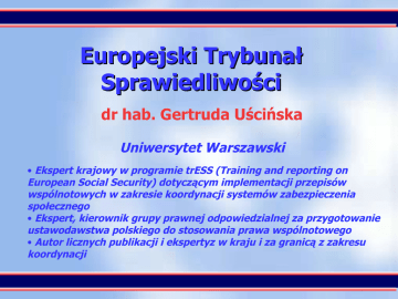 Europejski Trybunał Sprawiedliwości dr hab. Gertruda Uścińska Uniwersytet Warszawski • Ekspert krajowy w programie trESS (Training and reporting on European Social Security) dotyczącym implementacji przepisów wspólnotowych w zakresie koordynacji systemów zabezpieczenia społecznego • Ekspert, kierownik grupy prawnej odpowiedzialnej za przygotowanie ustawodawstwa polskiego do stosowania prawa wspólnotowego • Autor licznych publikacji i ekspertyz w kraju i za granicą z zakresu koordynacji 1 I. Podstawy prawne Europejski Trybunał Sprawiedliwości powstał na mocy Traktatu o utworzeniu Europejskiej Wspólnoty Węgla i Stali (TEWWiS) z 1951 r., jako organ sądowy tej Wspólnoty. Z czasem stał się organem orzekającym wszystkich Wspólnot Europejskich. Obecnie podstawy prawne jego funkcjonowania to: • Traktat o ustanowieniu Europejskiej Wspólnoty Energii Atomowej (TEWEA - Euroatom), • Traktat o ustanowieniu Wspólnoty Europejskiej (TWE), • Traktat o ustanowieniu Unii Europejskiej (TUE). Zasady funkcjonowania określa statut ETS i regulamin proceduralny. 2 Zadania i sposób funkcjonowania Zgodnie z art. 220 TWE zadaniem Trybunału jest zapewnienie poszanowania prawa w wykładni i stosowaniu Traktatu. Trybunał zapewnia jednolite stosowanie prawa wspólnotowego w państwach członkowskich oraz sprawuje kontrolę nad legalnością aktów wtórnego prawa wspólnotowego. Przyczynia się do rozwoju prawa wspólnotowego. 3 Zadania i sposób funkcjonowania Odgrywa istotną rolę w formułowaniu zasad ogólnych, które nie zostały wprost wyrażone w traktatach lub w prawie pochodnym, ale znalazły wyraz w orzecznictwie. ETS łączy funkcje m.in. Sądu Konstytucyjnego, Najwyższego i Międzynarodowego. 4 Sąd Konstytucyjny Sąd Konstytucyjny orzeka o zgodności z traktatami aktów prawnych Rady Unii Europejskiej i Komisji Europejskiej, aktów wydanych wspólnie przez Parlament Europejski i Radę Unii Europejskiej, aktów prawnych Parlamentu Europejskiego oraz aktów Europejskiego Banku Centralnego, które mają skutki prawne w stosunku do osób trzecich. 5 Sąd Najwyższy Sąd Najwyższy rozpatruje środki odwoławcze od wyroków Sądu Pierwszej Instancji (który został utworzony decyzją Rady Unii Europejskiej z 24 października 1988 r.) na podstawie art. 225 TWE, wprowadzonego przez Jednolity Akt Europejski. 6 Sąd Najwyższy Powodem jego utworzenia był zamiar odciążenia ETS od spraw mniejszej wagi, głównie pracowniczych dotyczących kwestii indywidualnych, a nie mających znaczenia ogólnego. Traktat Nicejski w znowelizowanym art. 220 TWE przyznał SN status autonomicznej instytucji wspólnotowej, Sąd Najwyższy posiada uprawnienia odwoławcze w stosunku do pewnej kategorii decyzji Komisji Europejskiej (np. decyzji w zakresie ochrony konkurencji, nakładającej na przedsiębiorstwa grzywny pieniężne). 7 Sąd Międzynarodowy Sąd Międzynarodowy rozpatruje spory między państwami członkowskimi wynikające ze stosowania prawa wspólnotowego, a także spory wynikające z realizacji traktatów. 8 Europejski Trybunał Sprawiedliwości Trybunał jest organem niezależnym od państw członkowskich oraz od pozostałych instytucji i organów Wspólnot . Działa wyłącznie w imieniu Wspólnot Europejskich oraz w interesie poszanowania prawa wspólnotowego. ETS jest organem ponadnarodowym (Sądem Wspólnoty), który nie jest hierarchicznie powiązany z sądami narodowymi (krajowymi). 9 Europejski Trybunał Sprawiedliwości Trybunał jest organem kolegialnym, a w jego skład wchodzą dwie kategorie członków: sędziowie (jeden sędzia z każdego państwa członkowskiego), rzecznicy generalni, których na podstawie art. 222 TWE jest ośmiu (ich liczba może być zwiększona). 10 Europejski Trybunał Sprawiedliwości Sędziowie orzekają w sprawach objętych jurysdykcją Trybunału w sposób bezstronny i sumienny, z zachowaniem tajemnicy obrad. Do zadań rzeczników generalnych należy przedstawienie, w sposób bezstronny i niezależny. Uzasadnionych wniosków w sprawach przedłożonych Trybunałowi. Ich funkcja polega na analizie orzeczeń Trybunału wydanych w sprawach zbliżonych do tej stanowiącej przedmiot danego postępowania i opracowania propozycji orzeczenia. 11 Europejski Trybunał Sprawiedliwości Sędziowie i rzecznicy generalni wybierani są za wspólnym porozumieniem rządów państw członkowskich spośród osób spełniających warunków do zajmowania najwyższych stanowisk sądowych lub będących pracownikami o powszechnie uznanej kompetencji. Powoływani są na okres 6 lat, ale co 3 lata następuje częściowe odnowienie składu sędziowskiego i rzeczników generalnych, na warunkach określonych w statucie Trybunału. 12 Europejski Trybunał Sprawiedliwości Rodzaje rozpatrywanych spraw ETS jest uprawniony do rozpatrywania ściśle określonych rodzajów spraw (skarg) w ramach jurysdykcji spornej oraz niespornej. W ramach jurysdykcji spornej ETS orzeka w sprawach: skarg przeciwko państwom członkowskim za naruszenie prawa wspólnotowego poprzez niewykonywanie zobowiązań wspólnotowych (art. 226 i 227 TWE), 13 Rodzaje rozpatrywanych spraw skarg przeciwko instytucjom wspólnotowym o stwierdzenie nieważności aktu prawa wspólnotowego (art. 230 TWE – tzw. skarga o uchylenie aktu prawnego wydanego przez instytucję Wspólnot Europejskich), skarg przeciwko instytucjom wspólnotowym na ich bezczynność (art. 232 TWE), 14 Rodzaje rozpatrywanych spraw skarg przeciwko instytucjom wspólnotowym o odszkodowanie (art. 288 TWE – tzw. skarga odszkodowawcza), sporów między funkcjonariuszami a Wspólnotą Europejską (art. 236 TWE – tzw. spory pracownicze). 15 Europejski Trybunał Sprawiedliwości Rodzaje rozpatrywanych spraw W ramach jurysdykcji niespornej ETS orzeka w sprawach: zgodności umowy międzynarodowej, którą zamierza zawrzeć Wspólnota Europejska (art. 300 TWE), pytań prejudycjalnych kierowanych przez sądy krajowe (art. 234 TWE). 16 Europejs