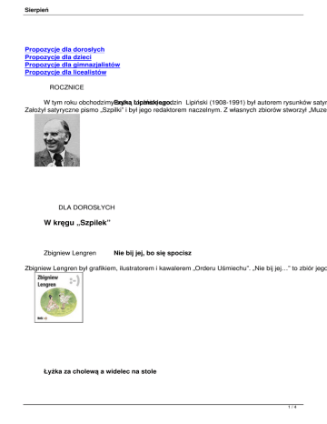 Sierpień Propozycje dla dorosłych Propozycje dla dzieci Propozycje dla gimnazjalistów Propozycje dla licealistów ROCZNICE W tym roku obchodzimyEryka setną Lipińskiego. rocznicę urodzin Lipiński (1908-1991) był autorem rysunków satyr Założył satyryczne pismo „Szpilki” i był jego redaktorem naczelnym. Z własnych zbiorów stworzył „Muze DLA DOROSŁYCH W kręgu „Szpilek” Zbigniew Lengren Nie bij jej, bo się spocisz Zbigniew Lengren był grafikiem, ilustratorem i kawalerem „Orderu Uśmiechu”. „Nie bij jej…” to zbiór jego Łyżka za cholewą a widelec na stole 1/4 Sierpień Wysmakowana i dowcipna książeczka, pięknie ilustrowana przez współpracującą ze „Szpilkami” Maję B Eryk Lipiński Nowy zefirek historii Skąd się wzięły latarnie na ulicy Podwale? kto kopnął Daniela Defoe na chrzcinach Piętaszka? Dlaczego Stanisław Tym Mamuta tu mam Zabójczo śmieszny tom Tyma. Felietony, afery kryminalne, skecze z STS-u i krótka historia współczesna 2/4 Sierpień Przygotowała: Ludmiła Milc DLA DZIECI Dostaliśmy po dziecku Ewa Grętkiewicz Opowieść o Albercie i Julce, którzy przez tydzień opiekują się młodszymi braćmi, gdyż ich rodzice musz Carmen Gil Matka Teresa z Kalkuty Kim była Agnes Gonxha Boyaxhiu? Co to są kasty? I dlaczego młoda Albanka postanowiła pracować w DLA GIMNAZJALISTÓW Rachel Wright Tragikomiczne dzieje teatru Książka z serii „Monstrrrualna Erudycja”. W sposób interesujący i przy okazji zabawny opowiada o dzieja 3/4 Sierpień Dalsze losy Lucy Ani Maud Shirley, Montgomery rudowłosejAnia dziewczynki z Avonlea posiadającej wybujałą wyobraźnię. Podobnie jak w „Ani DLA LICEALISTÓW Historia piętnastoletniej Jana Frey dziewczyny, W ciemności która traci wzrok w wypadku samochodowym. Leonia przeżywa dep Sofia ma Jana bardzo Frey trudną sytuacje W rodzinną ślepym – zaułku matka jej wolności nie kocha, a ojczym bije. Pewnego dnia dowiaduje Przygotowała: Ewa Gajcy 4/4