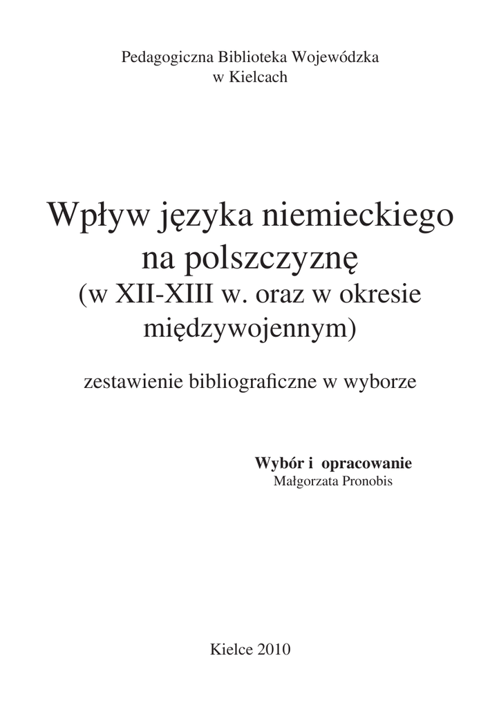 Pedagogiczna Biblioteka Wojewódzka w Kielcach Wpływ języka niemieckiego na polszczyznę (w XII-XIII w. oraz w okresie międzywojennym) zestawienie bibliograficzne w wyborze Wybór i opracowanie Małgorzata Pronobis Kielce 2010 2 1. Brückner, Aleksander : Dzieje języka polskiego / Aleksander Brückner. – Wrocław : Zakład Narodowy im. Ossolińskich, 1960 [Od strony 88 – germanizmy] Sygn. 27059 Wypożyczalnia Pedagogicznej Biblioteki Wojewódzkiej 2. Brückner, Aleksander : Początki i rozwój języka polskiego / Aleksander Brückner. – Warszawa : Państwowe Wydawnictwo Naukowe, 1974. – S. 363-457 : Wpływy języków obcych [M.in. niemieckie] Sygn. 115795 – 115802 Wypożyczalnia Pedagogicznej Biblioteki Wojewódzkiej 3. Buttler, Danuta : Germanizmy składniowe / Danuta Buttler // „Poradnik Językowy”. – 1987, z. 7, s. 562-565 4. Buttler, Danuta : Germanizmy słownikowe / Danuta Buttler // „Poradnik Językowy”. – 1987, z. 5, s. 479-482 5. Buttler, Danuta : Zapożyczenia niemieckie jako problem normatywny / Danuta Buttler // „Poradnik Językowy”. – 1987, z. 6, s. 399-403 6. Czarnecki, Tomasz : Pośrednictwo czeskie w staropolskich pożyczkach z niemieckiego / Tomasz Czarnecki // „Studia z Filologii Polskiej i Słowiańskiej”. – T. 9 (1970), s. 37-44 Czytelnia Pedagogicznej Biblioteki Wojewódzkiej 7. Czarnecki, Tomasz : Z historii wyrazów staropolskich pochodzenia niemieckiego / Tomasz Czarnecki // „Studia z Filologii Polskiej i Słowiańskiej”. – T. 19 (1980), s. 15-19 Czytelnia Pedagogicznej Biblioteki Wojewódzkiej 8. Czopek-Kopciuch, Barbara : Adaptacje niemieckich nazw miejscowych w języku polskim / Barbara Czopek-Kopciuch. – Kraków : Instytut Języka Polskiego PAN, 1995. – 274,[2] s. Sygn. 232582 Czytelnia Pedagogicznej Biblioteki Wojewódzkiej 3 9. D.B. : Germanizmy językowe / D.B. // „Poradnik Językowy”. – 1987, z. 6, s. 479-482 Czytelnia Pedagogicznej Biblioteki Wojewódzkiej 10. D.B. : Zapożyczenia niemieckie jako problem normatywny / D.B. // „Poradnik Językowy”. – 1987, z. 5, s. 399-403 Czytelnia Pedagogicznej Biblioteki Wojewódzkiej 11. Decyk, Wanda : Historia zapisana w nazwach – o losie obcych nazw w języku polskim / Wanda Decyk // „Poradnik Językowy”. – 2002, z. 7, s. 15-31 Czytelnia Pedagogicznej Biblioteki Wojewódzkiej 12. Długosz-Kurczabowa, Krystyna : Funkcjonowanie zapożyczonego formantu „-ulec” w języku polskim // W : Prace Filologiczne. T. 33 / pod red. Mieczysława Szymczaka. – Warszawa : Państwowe Wydawnictwo Naukowe, 1986. – S. 247-254 Sygn. 185358 Wypożyczalnia Pedagogicznej Biblioteki Wojewódzkiej 13. Dunaj, Bogusław : Język polski najstarszej doby piśmiennej : XII – XIII w. / Bogusław Dunaj // „Zeszyty Naukowe Uniwersytetu Jagiellońskiego. Prace Językoznawcze”. – 1975, z. 46, s. 198 Sygn. 119271 czytelnia Pedagogicznej Biblioteki Wojewódzkiej Sygn. 119272 – 119274 Wypożyczalnia Pedagogicznej Biblioteki Wojewódzkiej 14. Habrajska, Grażyna : Dziedzictwo stu lat kontaktów kulturowych polsko – niemieckich w słownictwie łódzkim // W : Kontakty języka polskiego z innymi językami na tle kontaktów kulturowych / pod red. Jolanty Maćkiewicz i Janusza Siatkowskiego. – Wrocław : „Wiedza o Kulturze”, 1992. – S. 25-30 Sygn. 216185 Czytelnia Pedagogicznej Biblioteki Wojewódzkiej 4 15. Karpluk, Maria : Mowa naszych przodków : (podstawowe wiadomości z historii języka polskiego do końca XVIII w.) / Maria Karpluk. – Kraków : Towarzystwo Miłośników Języka Polskiego, 1993. – S. 37-39 : Zapożyczenia niemieckie Sygn. 214087 Czytelnia Pedagogicznej Biblioteki Wojewódzkiej 16. Klemensiewicz, Zenon : Co wiemy o początkach języka polskiego / Zenon Klemensiewicz // „Życie Literackie”. – 1966, nr 17, s. 3 Czytelnia Pedagogicznej Biblioteki Wojewódzkiej 17. Klemensiewicz, Zenon : Historia języka polskiego / Zenon Klemensiewicz. – Warszawa : Wydawnictwo Naukowe PWN, 2002. – 2728:Najstarsze zapożyczenia ; S. 28-30 : Najstarsza warstwa zapożyczonej terminologii chrześcijańskiej ; S. 342-344; S. 645-648 : Wpływy niemieckie Sygn. 234664 Czytelnia Pedagogicznej Biblioteki Wojewódzkiej Sygn. 227515 Wypożyczalnia Pedagogicznej Biblioteki Wojewódzkiej 18. Klemensiewicz, Zenon : Jak żyła polszczyzna do końca XV wieku / Zenon Klemensiewicz. – Warszawa : Czytelnik, 1949 [Od s. 14 – oddziaływania niemieckie] Sygn. 7123 Wypożyczalnia Pedagogicznej Biblioteki Wojewódzkiej 19. Klemensiewicz, Zenon : Jaka była najstarsza polszczyzna / Zenon Klemensiewicz // „Życie Literackie”. – 1966, nr 19, s. 7 Czytelnia Pedagogicznej Biblioteki Wojewódzkiej 20. Klemensiewicz, Zenon : Podłoże rozwoju języka doby średniopolskiej / Zenon Klemensiewicz // „Życie Literackie”. – 1966, nr 21, s. 3 Czytelnia Pedagogicznej Biblioteki Wojewódzkiej 5 21. Klemensiewicz, Zenon : Pogadanki o języku / Zenon Klemensiewicz. – Wrocław : Zakład Narodowy im. Ossolińskich, 1966. – S. 68-72 : Wśród cudzoziemców naszego słownictwa Sygn. 43613 Czytelnia Pedagogicznej Biblioteki Wojewódzkiej Sygn. 43612 – 43616 Wypożyczalnia Pedagogicznej Biblioteki Wojewódzkiej 22. Klimek, Zygmunt : Nazwy osobowe pochodzenia niemieckiego / Zygmunt Klimek. – Kraków : IJP PAN, 1997 Czytelnia Główna Uniwersytetu Humanistyczno - Przyrodniczego w Kielcach 23. Kontakty języka polskiego z innymi językami na tle kontaktów kulturowych / red. Jolanta Maćkiewicz. – Wrocław : Wiedza o Kulturze, 1992 Czytelnia Główna Uniwersytetu Humanistyczno - Przyrodniczego w Kielcach 24. Korbut, Gabriel : Niemczyzna w języku polskim / Gabriel Korbut. – Warszawa : [b.w.], 1935 Biblioteka Uniwersytetu Rzeszowskiego 25. Korbut, Gabriel : Wyrazy niemieckie w języku polskim pod względem językowym i cywilizacyjnym / Gabriel Korbut. – Warszawa : [s.n.], 1893 Biblioteka Narodowa 26. Lehr-Spławiński, Tadeusz : Język polski : pochodzenie, powstanie, rozwój 