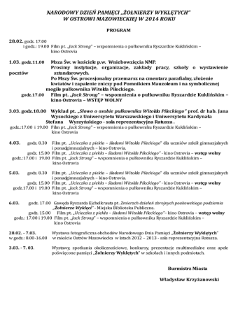 NARODOWY DZIEŃ PAMIĘCI „ŻOŁNIERZY WYKLĘTYCH” W OSTROWI MAZOWIECKIEJ W 2014 ROKU PROGRAM 28.02. godz. 17.00 i godz.: 19.00 Film pt. „Jack Strong” – wspomnienia o pułkowniku Ryszardzie Kuklińskim – kino Ostrovia 1.03. godz.11.00 Msza Św. w kościele p.w. Wniebowzięcia NMP. Prosimy instytucje, organizacje, zakłady pracy, szkoły o wystawienie pocztów sztandarowych. Po Mszy Św. procesjonalny przemarsz na cmentarz parafialny, złożenie kwiatów i zapalenie zniczy pod Pomnikiem Mauzoleum i na symbolicznej mogile pułkownika Witolda Pileckiego. godz.17.00 Film pt. „Jack Strong” – wspomnienia o pułkowniku Ryszardzie Kuklińskim – kino Ostrovia – WSTĘP WOLNY 3.03. godz.18.00 Wykład pt. „Słowo o osobie pułkownika Witolda Pileckiego” prof. dr hab. Jana Wysockiego z Uniwersytetu Warszawskiego i Uniwersytetu Kardynała Stefana Wyszyńskiego - sala reprezentacyjna Ratusza . godz.:17.00 i 19.00 Film pt. „Jack Strong” – wspomnienia o pułkowniku Ryszardzie Kuklińskim – kino Ostrovia 4.03. godz. 8.30 5.03. godz. 8.30 Film pt. „Ucieczka z piekła – śladami Witolda Pileckiego” dla uczniów szkół gimnazjalnych i ponadgimnazjalnych – kino Ostrovia. godz. 15.00 Film pt. „Ucieczka z piekła – śladami Witolda Pileckiego” - kino Ostrovia – wstęp wolny godz.:17.00 i 19.00 Film pt. „Jack Strong” – wspomnienia o pułkowniku Ryszardzie Kuklińskim – kino Ostrovia Film pt. „Ucieczka z piekła – śladami Witolda Pileckiego” dla uczniów szkół gimnazjalnych i ponadgimnazjalnych – kino Ostrovia. godz. 15.00 Film pt. „Ucieczka z piekła – śladami Witolda Pileckiego” - kino Ostrovia – wstęp wolny godz.17.00 i 19.00 Film pt. „Jack Strong” – wspomnienia o pułkowniku Ryszardzie Kuklińskim – kino Ostrovia 6.03. godz. 17.00 Gawęda Ryszarda Ejchelkrauta pt. Zmierzch działań zbrojnych poakowskiego podziemia „Żołnierze Wyklęci” - Miejska Biblioteka Publiczna. godz. 15.00 Film pt. „Ucieczka z piekła – śladami Witolda Pileckiego”– kino Ostrovia – wstęp wolny godz.: 17.00 i 19.00 Film pt. „Jack Strong” – wspomnienia o pułkowniku Ryszardzie Kuklińskim – kino Ostrovia 28.02. - 7.03. Wystawa fotograficzna obchodów Narodowego Dnia Pamięci „Żołnierzy Wyklętych” w godz.: 8.00-16.00 w mieście Ostrów Mazowiecka w latach 2012 – 2013 - sala reprezentacyjna Ratusza. 3.03. - 7. 03. Wystawy, spotkania okolicznościowe, konkursy, prezentacje multimedialne oraz apele poświęcone pamięci „Żołnierzy Wyklętych” w szkołach i innych podmiotach. Burmistrz Miasta Władysław Krzyżanowski