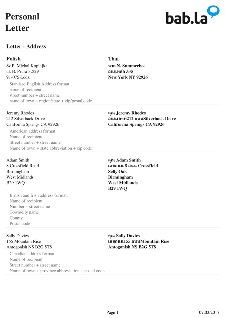 Personal Letter Letter - Address Polish Thai Sz.P. Michał Kopiejka ul. B. Prusa 32/29 91-075 Łódź Standard English Address format: name of recipient street number + street name name of town + region/state + zip/postal code. นาย N. Summerbee ถนนหลัก 335 New York NY 92926 Jeremy Rhodes 212 Silverback Drive California Springs CA 92926 American address format: Name of recipient Street number + street name Name of town + state abbreviation + zip code คุณ Jeremy Rhodes ถนนเลขที่212 ถนนSilverback Drive California Springs CA 92926 Adam Smith 8 Crossfield Road Birmingham West Midlands B29 1WQ คุณ Adam Smith เลขถนน 8 ถนน Crossfield Selly Oak Birmingham West Midlands B29 1WQ British and Irish address format: Name of recipient Number + street name Town/city name County Postal code Sally Davies คุณ Sally Davies 155 Mountain Rise เลขถนน155 ถนนMountain Rise Antogonish NS B2G 5T8 Antogonish NS B2G 5T8 Canadian address format: Name of recipient Street number + street name Name of town + province abbreviation + postal code Page 1 07.03.2017 Personal Letter Celia Jones 47 Herbert Street Floreat Perth WA 6018 Australian address format: Name of recipient Street number + street name Name of province Town/city name + postal code คุณ Celia Jones เลขที่ถนน47 ถนนHerbert Floreat Perth WA 6018 Alex Marshall 745 King Street West End Wellington 0680 New Zealand address format: Name of recipient Number + street name Suburb/RD number/PO box Town/city + postal code ถนน Alex Marshall ถนนเลขที่ 745 ถนน King West End, Wellington 0680 Letter - Opening Polish Thai Drogi Janie, Informal, standard way of addressing a friend เรียน จอห์น Droga Mamo/Drogi Tato, / Kochani Rodzice, Informal, standard way of addressing your parents เรียนคุณพ่อ/คุณแม่ Drogi Wujku, เรียนคุณลุง เจอโรม Informal, standard way of addressing a member of your family Cześć Michale, Informal, standard way of addressing a friend สวัสดีค่ะ/ครับ คุณจอห์น Hej Janku, Very informal, standard way of addressing a friend ว่าไง จอห์น Page 2 07.03.2017 Personal Letter Janku, Informal, direct way of addressing a friend จอห์น Mój Drogi/Moja Droga, Very informal, used when addressing a loved one ที่รักของฉัน Mój Najdroższy/Moja Najdroższa, Very informal, used when addressing a partner สุดที่รักของฉัน Najdroższy/Najdroższa, Informal, used when addressing a partner ถึงจอห์นสุดที่รัก Dziękuję za Twój list. Used when replying to correspondence ขอบคุณสำหรับจดหมายของคุณ Cieszę się, że się odezwałeś/-aś. Used when replying to correspondence มันเป็นเรื่องน่ายินดีมากที่คุณตอบกลับมาอีกครั้ง Przepraszam, że nie pisałem/-am tak długo. ฉันต้องขอโทษคุณมากที่ไม่ได้ติดต่อคุณมาเป็นระยะเวลานาน Used when writing to an old friend you haven't contacted for a while Minęło sporo czasu od naszego ostatniego kontaktu. มันเป็นเวลานานมากที่เราไม่ได้ติดต่อกัน Used when writing to an old friend you haven't contacted for a long time Letter - Main Body Polish Thai Piszę, by przekazać Ci... Used when you have important news ฉันจะเขียนถึงคุณว่า... Czy masz już plany na...? คุณมีแผนสำหรับ...แล้วหรือยัง? Used when you want to invite someone to an event or meet up with them Dziękuję bardzo za ขอบคุณมากสำหรับการส่ง/เชิญชวน/แนบมา... przesłanie/zaproszenie/załączenie... Used when thanking someone for sending something / inviting someone somewhere / enclosing some information Page 3 07.03.2017 Personal Letter Jestem Ci bardzo wdzięczny za poinformowanie ฉันรู้สึกดีใจมากที่คุณบอกให้ฉันทราบ/เอื้อ/เขียนถึงฉัน mnie/zaoferowanie mi/napisanie mi... Used when sincerely thanking someone for telling you something / offering you something / writing to you regarding something Jak miło, że do mnie napisałeś/mnie zaprosiłeś มันเป็นเรื่องดีอย่างมากที่คุณเขียน/เชิญชวน/ส่ง...มาให้ฉัน do/przesłałeś mi... Used when you sincerely appreciate something someone wrote to you / invited you to / sent you Z przyjemnością powiadamiam, że... Used when announcing good news to friends ฉันรู้สึกยินดีอย่างมากที่จะประกาศว่า... Ucieszyłem się słysząc, że... Used when relaying a message or news ฉันรู้สึกยินดีอย่างมากที่ได้ยินว่า... Z przykrością piszę, że... Used when announcing bad news to friends ฉันขอโทษที่ต้องบอกคุณว่า... Tak przykro mi słyszeć, że... ฉันต้องขอแสดงความเสียใจที่ได้ยินว่า... Used when comforting a friend regarding bad news that they had Letter - Closing Polish Thai Ucałuj ode mnie ... i przekaż im, jak bardzo za nimi ส่งความรักของฉันให้แก่...และบอกเขาว่าฉันคิดถึงเขามากแค่ไ tęsknię. หน Used when you want to tell someone you miss them vi
