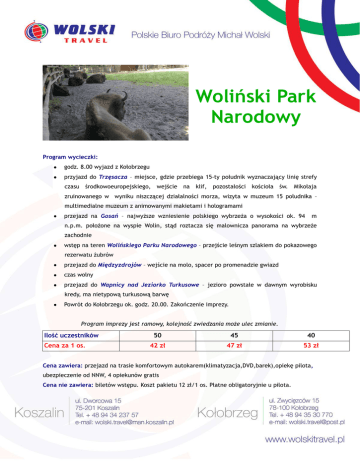 Woliński Park Narodowy Program wycieczki: godz. 8.00 wyjazd z Kołobrzegu przyjazd do Trzęsacza – miejsce, gdzie przebiega 15-ty południk wyznaczający linię strefy czasu środkowoeuropejskiego, wejście na klif, pozostałości kościoła św. Mikołaja zruinowanego w wyniku niszczącej działalności morza, wizyta w muzeum 15 południka – multimedialne muzeum z animowanymi makietami i hologramami przejazd na Gosań – najwyższe wzniesienie polskiego wybrzeża o wysokości ok. 94 m n.p.m. położone na wyspie Wolin, stąd roztacza się malownicza panorama na wybrzeże zachodnie wstęp na teren Wolińskiego Parku Narodowego – przejście leśnym szlakiem do pokazowego rezerwatu żubrów przejazd do Międzyzdrojów – wejście na molo, spacer po promenadzie gwiazd czas wolny przejazd do Wapnicy nad Jeziorko Turkusowe – jezioro powstałe w dawnym wyrobisku kredy, ma nietypową turkusową barwę Powrót do Kołobrzegu ok. godz. 20.00. Zakończenie imprezy. Program imprezy jest ramowy, kolejność zwiedzania może ulec zmianie. Ilość uczestników Cena za 1 os. 50 45 40 42 zł 47 zł 53 zł Cena zawiera: przejazd na trasie komfortowym autokarem(klimatyzacja,DVD,barek),opiekę pilota, ubezpieczenie od NNW, 4 opiekunów gratis Cena nie zawiera: biletów wstępu. Koszt pakietu 12 zł/1 os. Płatne obligatoryjnie u pilota.
