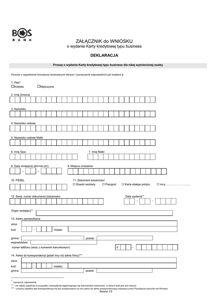 ZAŁĄCZNIK do WNIOSKU o wydanie Karty kredytowej typu business DEKLARACJA Proszę o wydanie Karty kredytowej typu business dla niżej wymienionej osoby Prosimy o wypełnienie formularza drukowanymi literami i zaznaczenie odpowiednich pól znakiem x. 1. Płeć*: Kobieta Mężczyzna 2. Imię (imiona) 3. Nazwisko 4. Nazwisko rodowe 5. Nazwisko rodowe Matki 6. Imię Ojca 7. Imię Matki 8. Data urodzenia (dd-mm-rrrr) _ 9. Miejsce urodzenia _ 11. Dokument tożsamości* Dowód osobisty Paszport 10. PESEL Karta stałego pobytu 12. Seria, numer dokumentu tożsamości inny:????????? Data wydania** - - Organ wydający** 13. Adres zamieszkania ulica: kod: - miasto: gmina: powiat: województwo: numer telefonu (wraz z numerem kierunkowym) 0 - 14. Adres do korespondencji (jeżeli inny niż adres firmy)*** ulica: kod: - gmina * miasto: powiat: zaznaczyć odpowiednie ** - nie należy wypełniać w przypadku nierezydenta legitymującego się dokumentem tożsamości, w którym brak jest tych danych *** - prosimy wypełnić jeśli korespondencja ma być przekazywana na inny adres niż adres korespondencyjny wskazany przez Posiadacza rachunku we Wniosku Strona 1/3 : województwo: numer telefonu (wraz z numerem kierunkowym) 0 - 15. Numer telefonu komórkowego Dla wskazanej osoby proszę o wydanie Karty kredytowej typu business 16. Rodzaj grafiki karty: linia czarna 17. Imię i nazwisko do umieszczenia na karcie Maksymalnie 25 znaków wraz z odstępami. Prosimy nie wpisywać inicjałów, tytułów, pseudonimów itp. 18. Proszę o ustalenie limitu karty, w wysokości PLN Limit karty może być niższy lub równy limitowi kredytowemu. W przypadku podania limitu przewyższającego limit kredytowy zostanie on zmniejszony do wysokości limitu kredytowego. Informacje dodatkowe 19. Karta ma być wydana w trybie ekspresowym?*: TAK NIE Wysyłka karty i PIN pocztą Sposób wysyłki karty i numeru PIN Wysyłka karty pocztą i PIN – SMS-em Numer telefonu +48 Informacja administratora danych osobowych Oświadczam, że zostałem/am poinformowany/a przez Bank Ochrony Środowiska Spółka Akcyjna z siedzibą w Warszawie, ul. Żelazna 32, że administratorem danych osobowych jest Bank Ochrony Środowiska S.A., zwany dalej „Bankiem”, z siedzibą w Warszawie, ul. Żelazna 32; 1) podane przeze mnie dane osobowe będą przetwarzane w celu podjęcia przez Bank niezbędnych czynności związanych z zawarciem i wykonaniem umowy oraz w celu wypełnienia usprawiedliwionych potrzeb Banku; 2) dane osobowe mogą być przekazane wyłącznie podmiotom wskazanym w art. 104 ust. 2 oraz art. 105 ustawy Prawo bankowe, w szczególności do innych banków, biur informacji gospodarczej, BIK S.A., chyba że upoważniłem/am lub upoważnię Bank do przetwarzania moich danych osobowych w szerszym zakresie; 3) przysługuje mi prawo dostępu do treści moich danych oraz ich poprawiania na warunkach określonych w ustawie o ochronie danych osobowych, a także przysługują mi inne uprawnienia wynikające z tej ustawy; 4) podanie przeze mnie danych osobowych jest dobrowolne, jednak dane te są potrzebne do prawidłowego wykonania czynności bankowej, zgodnie z obowiązującymi przepisami prawa oraz przepisami wewnętrznymi Banku. Podstawa prawna: art. 24 ust. 1 ustawy z dnia 29 sierpnia 1997 r. o ochronie danych osobowych (j.t. Dz. U. z 2014 r. poz. 1182 z późn. zm.). Oświadczam, że wszystkie podane przeze mnie informacje są prawdziwe i kompletne. Zobowiązuję się do niezwłocznego powiadomienia Banku w przypadku ich zmiany. Wyrażam zgodę na*: a) dokonywanie przez Bank Ochrony Środowiska S.A., zwany dalej „Bankiem”, następujących czynności w zakresie usług i produktów Banku oraz usług i produktów dystrybuowanych przez Bank: - przekazywanie mi za pomocą środków komunikacji elektronicznej, w szczególności poczty elektronicznej - informacji handlowej (zgodnie z ustawą z dnia 18 lipca 2002 r. o świadczeniu usług drogą elektroniczną - j.t. Dz. U. z 2013 r. poz. 1422), - używanie telekomunikacyjnych urządzeń końcowych i automatycznych systemów wywołujących (w szczególności telefonu i poczty elektronicznej) dla celów marketingu bezpośredniego (zgodnie z ustawą z dnia 16 lipca 2004 r. - Prawo telekomunikacyjne - j.t. Dz. U. z 2014 r. poz. 243 z późn. zm.) □ TAK – wyrażam zgodę b) □ NIE – nie wyrażam zgody udostępnianie moich danych osobowych (imię, nazwisko, adres, nr telefonu, e-mail) przez Bank podmiotom powiązanym kapitałowo z Bankiem i współpracującym z Bankiem (aktualna lista podmiotów powiązanych kapitałowo z Bankiem i współpracujących z Bankiem znajduje się na stronie www.bosbank.pl) i na przetwarzanie przez te podmioty moich danych osobowych w ich celach marketingowych □ TAK – wyrażam zgodę c) □ NIE – nie wyrażam zgody dokonywanie przez podmioty powiązane kapitałowo z Bankiem i współpracujące z Bankiem następujących czynności w zakresie ich usług i produktów oraz usług i produktów dystrybuowanych przez te podmioty: - przekazywanie mi za pomocą środków komunikacji elektronicznej, w szczególności poczty elektronicznej - informacji handlowej (zgodnie z ustawą z dnia 18 lipca 2002 r. o świadczeniu usług drogą elektroniczną), - używanie telekomunikacyjnych urządzeń końcowych i automatycznych systemów wywołujących dla celów marketingu bezpośredniego (w szczególności telefonu i poczty elektronicznej) (zgodnie z ustawą z dnia 16 lipca 2004 r. - Prawo telekomunikacyjne) Strona 2/3 □ TAK – wyrażam zgodę □ NIE – nie wyrażam zgody Niniejszą zgodę składam dobrowolnie. *) 1) 2) właściwą odpowiedź zaznaczyć X Art. 286. § 1. Kto, w celu osiągnięcia korzyści majątkowej, doprowadza inną osobę do niekorzystnego rozporządzenia własnym lub cudzym mieniem za pomocą wprowadzenia jej w błąd albo wyzyskania błędu lub niezdolności do należytego pojmowania przedsiębranego działania, podlega karze pozbawienia wolności od 6 m