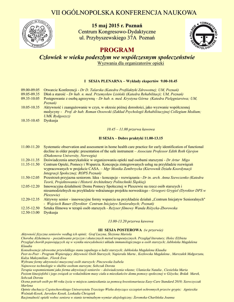 VII OGÓLNOPOLSKA KONFERENCJA NAUKOWA 15 maj 2015 r. Poznań Centrum Kongresowo-Dydaktyczne ul. Przybyszewskiego 37A Poznań PROGRAM Człowiek w wieku podeszłym we współczesnym społeczeństwie Wyzwania dla organizatorów opieki I SESJA PLENARNA – Wykłady ekspertów 9.00-10.45 09.00-09.05 09.05-09.35 09.35-10.05 10.05-10.35 10.35-10.45 Otwarcie Konferencji - Dr D. Talarska (Katedra Profilaktyki Zdrowotnej; UM, Poznań) Dłoń a starość - Dr hab. n. med. Przemysław Lisiński (Katedra Rehabilitacji; UM, Poznań) Postępowanie z osobą agresywną – Dr hab. n. med. Krystyna Górna (Katedra Pielęgniarstwa; UM, Poznań) Aktywność i zaangażowanie w czyn, w okresie późnej dorosłości, jako wyzwanie współczesnej medycyny - Prof. dr hab. Roman Ossowski (Zakład Psychologii Rehabilitacyjnej Collegium Medium; UMK Bydgoszcz) Dyskusja 10.45 – 11.00 przerwa kawowa II SESJA – Dobre praktyki 11.00-13.15 11.00-11.20 11.20-11.35 11.35-11.50 11.50-12.05 12.05-12.20 12.20-12.35 12.35-12.50 12.50-13.00 Systematic observation and assessment in home health care practice for early identification of functional decline in older people: presentation of the safe instrument – Associate Professor Edith Roth Gjevjon (Diakonova University, Norwegia) Doświadczenia amerykańskie w organizowaniu opieki nad osobami starszymi - Dr Artur Migo Centrum Opieki, Pomocy i Wsparcia. Koncepcja zintegrowanych usług na przykładzie rozwiązań wypracowanych w projekcie CASA. – Mgr Monika Zembrzycka (Kierownik Działu Koordynacji Integracji Społecznej; ROPS Poznań) Przestrzeń przyjazna seniorom. Idea - koncepcje - rozwiązania - Dr in. arch. Anna Szewczenko (Katedra Teorii, Projektowania i Historii Architektury Politechniki Śląskiej) Innowacyjna działalność Domu Pomocy Społecznej w Pleszewie na rzecz osób starszych i niesamodzielnych na przykładzie wdrażanego projektu norweskiego - Grzegorz Grygiel (Dyrektor DPS w Pleszewie) Aktywny senior - innowacyjne formy wsparcia na przykładzie działań „Centrum Inicjatyw Senioralnych" - Wojciech Bauer (Dyrektor Centrum Inicjatyw Senioralnych; Poznań) Sztuka filmowa w terapii osób starszych - Reżyser filmowy Wanda Różycka-Zborowska Dyskusja 13.00-13.20 przerwa kawowa III SESJA POSTEROWA (w przerwie) Aktywność fizyczna seniorów według ich opinii; Graf Lucyna, Śleziona Mariola Choroba Alzheimera – poszukiwanie przyczyn i skutecznych metod terapeutycznych. Przegląd literatury; Holec Elżbieta Przegląd chorób pojawiających się w wyniku niewydolności układu immunologicznego u osób starszych; Jabłońska Magdalena Klaudia Konsekwencje zdrowotne przewlekłego stanu zapalnego u ludzi starszych; Jabłońska Magdalena Klaudia Peer-to-Peer - Program Wspierający Aktywność Osób Starszych; Napierała Marta , Kozłowska Magdalena , Marszałek Małgorzata, Kulza Maksymilian , Florek Ewa Wybrane formy aktywności muzycznej osób starszych; Pinczewska Izabela Najnowsze technologie w służbie osobom starszym; Sobczak Dorota Terapia wspomnieniami jako forma aktywizacji seniorów – doświadczenia własne; Ulaniecka Natalia , Ciesielska Maria Poziom kinezjofobii i jego związek ze wskaźnikiem masy ciała u mieszkańców domu pomocy społecznej w Giżycku; Brdak Marek, Sobczak Dorota Ocena potrzeb osób po 60 roku życia w miejscu zamieszkania za pomocą kwestionariusza Easy-Care Standard 2010; Szewczyczak Marlena Opinie słuchaczy Częstochowskiego Uniwersytetu Trzeciego Wieku dotyczące szczepień ochronnych przeciw grypie; Agnieszka Woźniak-Kosek, Jarosław Kosek, Leokadia Chrząstek Racjonalność opieki wobec seniora w stanie terminalnym-wymiar aksjologiczny; Żeromska-Charlińska Joanna Relacje międzypokoleniowe i rehabilitacja. Januszewski Paweł WARSZTATY 13.20-13.50 13.50-14.20 Warsztat I Elementy usprawniania pacjentów po udarze mózgu – Dr n. med. Adrianna Borowicz (Katedra Geriatrii i Gerontologii; UM, Poznań) Warsztat II Pielęgnowanie jamy ustnej u osób starszych – Dr n. med. Joanna Kunert (Zakład i Poradnia Stomatologii Zachowawczej UM Łódź; sekretarz łódzkiego oddziału PTG) Warsztat III Film o dr W. Błeńskiej - Reżyser filmowy Wanda Różycka-Zborowska Warsztat IV Ból – wróg czy przyjaciel? Psychologiczne aspekty bólu - jak je odkrywać – Mgr Sylwia Wójcik (Psycholog; Centrum wspierania Rodzin „Swoboda”, Hospicjum Domowe, Poznań) Warsztat V Idea tworzenia Centrów Spotkań dla osób z otępieniem oraz ich opiekunów – praktyczne aspekty adaptacyjnego wdrożenia modelu amsterdamskiego w Polsce- Prof. Joanna Rymaszewska, mgr Dorota Szcześniak (Zakład Psychiatrii Konsultacyjnej i Badań Neurobiologicznych, Katedra Psychiatrii, Uniwersytet Medyczny im. Piastów Śląskich, Wrocław) 14.20- 14.50 przerwa lunchowa IV SESJA Doniesienia własne 14.50-15.00 15.00-15.10 15.10-15.20 15.20-15.30 15.30-15.40 15.40-15.50 15.50-16.00 16.00-16.10 16.10-16.20 16.20-16.30 16.30-16.40 16.40-16.50 16.50-17.00 17.00-17.10 17.10-17.20 Dziarski Dziadek – senior aktywny w świecie realnym i wirtualnym – studium przypadku; Michniuk Anna Metoda dramy edukacyjnej w kursie dla seniorów z zasad udzielania pierwszej pomocy z udziałem słuchaczy Szkoły Policealnej Opiekun Osoby Starszej; Drabik Urszula, Marzęcka Agnieszka Komunikacja pracowników służby zdrowia z pacjentem w wieku podeszłym; Deręgowska Justyna Aktywizacja seniorów z udziałem słuchaczy Szkoły Policealnej kierunku Opiekun Osoby Starszej w ZSRCKU w Czernichowie. Rozpoznawanie potrzeb seniorów; Marzęcka Agnieszka , Drabik Urszula, Marzęcka Agnieszka , Drabik Urszula Znaczenie farmakoterapii w rehabilitacji po nabytych uszkodzeniach mózgu; Mazurek Justyna, Szczygieł Jarosław Dziadek uczy wnuczka czy wnuczek dziadka – o socjalizacji odwróconej i wykorzystywaniu nowych technologii przez seniorów; Polcyn-Matuszewska Sylwia Centrum Spotkań dla osób z otępieniem oraz ich opiekunów we Wrocławiu - efekty podjętych działań w zakresie adapt