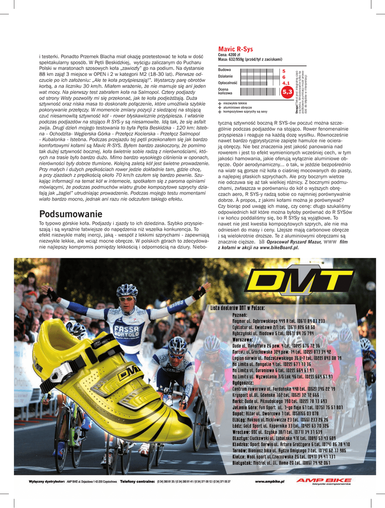 Mavic R-Sys Podsumowanie To typowo górskie koła. Podjazdy i zjazdy to ich dziedzina. Szybko przyspieszają i są wyraźnie łatwiejsze do napędzenia niż wszelka konkurencja. To efekt niezwykle małej inercji, jaką - wespół z lekkimi szprychami - zapewniają niezwykle lekkie, ale wciąż mocne obręcze. W polskich górach to zdecydowanie najlepszy kompromis pomiędzy lekkością i odpornością na dziury. Niebo- Cena: 4200 zł Masa: 632/959g (przód/tył z zaciskami) Budowa Opłacalność 5 6 4,1 Ocena końcowa 5,3 Działanie niezwykle lekkie aluminiowe obręcze kompozytowe szprychy są sexy Uwaga! Tekst jest integralną częścią testu. Wnioskowanie tylko na podstawie punktacji może prowadzić do błędów w interpretacji i testerki. Ponadto Przemek Blacha miał okazję przetestować te koła w dość spektakularny sposób. W Pętli Beskidzkiej, wyścigu zaliczanym do Pucharu Polski w maratonach szosowych koła „zawiozły” go na podium. Na dystansie 88 km zajął 3 miejsce w OPEN i 2 w kategorii M2 (18-30 lat). Pierwsze odczucie po ich założeniu: „Ale te koła przyśpieszają!”. Wystarczy parę obrotów korbą, a na liczniku 30 km/h. Miałem wrażenie, że nie marnuje się ani jeden wat mocy. Na pierwszy test zabrałem koła na Salmopol. Cztery podjazdy od strony Wisły pozwoliły mi się przekonać, jak te koła podjeżdżają. Duża sztywność oraz niska masa to doskonałe połączenie, które umożliwia szybkie pokonywanie przełęczy. W momencie zmiany pozycji z siedzącej na stojącą czuć niesamowitą sztywność kół - rower błyskawicznie przyśpiesza. I właśnie podczas podjazdów na stojąco R SYS-y są niesamowite. Idą tak, że się asfalt zwija. Drugi dzień mojego testowania to była Pętla Beskidzka - 120 km: Istebna - Ochodzita- Węgierska Górka - Przełęcz Kocierska - Przełęcz Salmopol - Kubalonka - Istebna. Podczas przejazdu tej pętli przekonałem się jak bardzo komfortowymi kołami są Mavic R-SYS. Byłem bardzo zaskoczony, że pomimo tak dużej sztywność bocznej, koła świetnie sobie radzą z nierównościami, których na trasie było bardzo dużo. Mimo bardzo wysokiego ciśnienia w oponach, nierówności były dobrze tłumione. Kolejną zaletą kół jest świetne prowadzenie. Przy małych i dużych prędkościach rower jedzie dokładnie tam, gdzie chcę, a przy zjazdach z prędkością około 70 km/h czułem się bardzo pewnie. Szukając informacji na temat kół w internecie, spotkałem się z paroma opiniami mówiącymi, że podczas podmuchów wiatru grube kompozytowe szprychy działają jak „żagiel” utrudniając prowadzenie. Podczas mojego testu momentami wiało bardzo mocno, jednak ani razu nie odczułem takiego efektu. tyczną sztywność boczną R SYS-ów poczuć można szczególnie podczas podjazdów na stojąco. Rower fenomenalnie przyspiesza i reaguje na każdą dozę wysiłku. Równocześnie nawet bardzo rygorystycznie zapięte hamulce nie ocierają obręczy. Nie bez znaczenia jest jakość panowania nad rowerem i jest to efekt wymienionych wcześniej cech, w tym jakości hamowania, jakie oferują wyłącznie aluminiowe obręcze. Opór aerodynamiczny... o tak, w jeździe bezpośrednio na wiatr są gorsze niż koła o ciaśniej mocowanych do piasty, a najlepiej płaskich szprychach. Ale przy bocznym wietrze nie odczuwa się aż tak wielkiej różnicy. Z bocznymi podmuchami, zwłaszcza w porównaniu do kół o wyższych obręczach aero, R SYS-y radzą sobie co najmniej porównywalnie dobrze. À propos, z jakimi kołami można je porównywać? Czy biorąc pod uwagę ich masę, czy cenę: długo szukaliśmy odpowiednich kół które można byłoby porównać do R SYSów i w końcu poddaliśmy się, bo R SYSy są wyjątkowe. To nawet nie jest kwestia kompozytowych szprych, ale nie ma odniesień do masy i ceny. Lżejsze mają carbonowe obręcze i są wielokrotnie droższe. Te z aluminiowymi obręczami są Opracował Ryszard Mazur, film znacznie cięższe. z kołami w akcji na www.bikeBoard.pl.