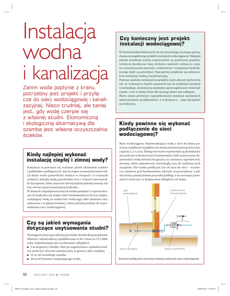 Instalacja wodna i kanalizacja Zanim woda popïynie z kranu, potrzebny jest projekt i przyïÈcze do sieci wodociÈgowej i kanalizacyjnej. Nieco trudniej, ale taniej jest, gdy wodÚ czerpie siÚ z wïasnej studni. EkonomicznÈ i ekologicznÈ alternatywÈ dla szamba jest wïasna oczyszczalnia Ăcieków. Kiedy najlepiej wykonaÊ instalacjÚ ciepïej i zimnej wody? Instalacje te powinno siÚ wykonaÊ przed uïoĝeniem tynków i podkïadów podïogowych. Juĝ na etapie wznoszenia konstrukcji domu warto przewidzieÊ miejsca w stropach i w Ăcianach noĂnych, którÚdy bÚdÈ przechodziÊ rury i wstawiÊ tam kawaïki styropianu, które znacznie ïatwiej bÚdzie póěniej usunÈÊ niĝ kuÊ otwory przez konstrukcjÚ budynku. W domach niepodpiwniczonych trzeba pamiÚtaÊ o wprowadzeniu do budynku (na etapie robót fundamentowych) rury doprowadzajÈcej wodÚ ze studni lub wodociÈgu albo uïoĝeniu rury osïonowej o wiÚkszej Ărednicy, która póěniej posïuĝy do wprowadzenia rury wodociÈgowej. Czy konieczny jest projekt instalacji wodociÈgowej? W domach jednorodzinnych nie ma formalnego wymogu sporzÈdzania szczegóïowego projektu instalacji wodociÈgowej. Najlepiej jednak instalacjÚ wodnÈ rozprowadziÊ na podstawie projektu, w którym okreĂla siÚ: trasÚ, Ărednice, materiaï i rodzaj rur, miejsce zamontowania zaworów, wodomierza i urzÈdzenia hydroforowego (jeĂli sÈ potrzebne). NajczÚĂciej projektuje siÚ jednoczeĂnie instalacjÚ wodnÈ i kanalizacyjnÈ. Podczas montaĝu instalacji bez projektu moĝe zdarzyÊ siÚ bowiem tak, ĝe wykonawca bÚdzie namawiaï nas do zrobienia instalacji w technologii, do której ma niezbÚdne oprzyrzÈdowanie i doĂwiadczenie, a nie w takiej, która dla naszego domu jest najlepsza. Warto zatem powierzyÊ zaprojektowanie instalacji sanitarnych uprawnionemu projektantowi, a wykonawcy – jego skrupulatnÈ realizacjÚ. Kiedy powinno siÚ wykonaÊ podïÈczenie do sieci wodociÈgowej? Rura wodociÈgowa doprowadzajÈca wodÚ z sieci do domu powinna znajdowaÊ siÚ gïÚbiej niĝ strefa przemarzania gruntu (najczÚĂciej 1,2–1,5 m). Dlatego teĝ warto wprowadziÊ jÈ do budynku juĝ podczas wykonywania fundamentów. JeĂli zamierzamy doprowadziÊ wodÚ równieĝ do garaĝu czy zraszaczy ogrodowych, musimy takĝe zamontowaÊ równolegïÈ rurÚ do zasilania tych urzÈdzeñ. Nie trzeba podïÈczaÊ ich od razu do sieci – wystarczy umieĂciÊ pod fundamentem odcinek wyprowadzony z jednej strony ponad poziom przyszïej podïogi, a na zewnÈtrz pozostawiÊ zwój rury w bezpiecznej odlegïoĂci od domu. sieÊ wodociÈgowa przepust przez ĂcianÚ budynku Czy sÈ jakieĂ wymagania dotyczÈce usytuowania studni? Wymagania dotyczÈce lokalizacji studni okreĂla RozporzÈdzenie Ministra Infrastruktury opublikowane w Dz. Ustaw nr 75 z 2002 roku. Najistotniejsze jest zachowanie odlegïoĂci: 5 m od granicy dziaïki, choÊ po uzgodnieniu z sÈsiadem studnia moĝe byÊ równieĝ umieszczona w granicy jako wspólna, 15 m od szczelnego szamba, 30 m od drenaĝu rozsÈczajÈcego Ăcieki. 50 BUDUJEMY DOM BD7i8_TwojDom_inst_wodna_kanalizacja.indd 50 zawór odcinajÈcy zestaw wodomierzy Schemat podïÈczenia domowej instalacji wodnej do sieci wodociÈgowej 7–8/2008 2008-06-28 22:44:19 Instalacja wodna i kanalizacyjna Jaka studnia jest najlepsza? W zaleĝnoĂci od warunków wodno-gruntowych studniÚ buduje siÚ jako krÚgowÈ lub wierconÈ. Studnie krÚgowe buduje siÚ na dziaïkach, na których poziom wód gruntowych jest stosunkowo wysoki, a warstwa wodonoĂna zapewnia dostateczny wydatek wody. Ze wzglÚdu na to, ĝe do takiej studni ïatwo dostajÈ siÚ róĝne zanieczyszczenia (w tym bakteriologiczne), a niezbyt gruba warstwa gruntu nie filtruje dostatecznie wód opadowych zasilajÈcych warstwÚ wodonoĂnÈ, studnia krÚgowa nie jest dobrym ěródïem wody do instalacji domowej, nadaje siÚ raczej do celów gospodarczych: podlewania ogrodu czy mycia samochodu. Studnie wiercone siÚgajÈ gïÚbszych warstw wodonoĂnych, dlatego czerpana z nich woda jest znacznie bezpieczniejsza pod wzglÚdem bakteriologicznym, mogÈ w niej jednak wystÚpowaÊ zwiÈzki chemiczne pogarszajÈce jej jakoĂÊ (zaĝelazienie, znaczna twardoĂÊ). Zaleĝnie od gïÚbokoĂci lustra wody, do jej czerpania stosuje siÚ pompy: samozasysajÈce – jeĂli jest pïycej niĝ 7 m, gïÚbinowe – do studni gïÚbszych niĝ 7 m. Studnia wiercona z pompÈ gïÚbinowÈ przewód ssÈcy studnia dopuszczalna wysokoĂÊ ssania 7–8 m przewód tïoczny pompa silnik Studnia wiercona z pompÈ samozasysajÈcÈ Jakie formalnoĂci sÈ wymagane przy wykonywaniu przyïÈcza wodociÈgowego, a jakie przy budowie wïasnej studni? PodïÈczenie do wodociÈgu – formalnoĂci z nim zwiÈzane ograniczajÈ siÚ najczÚĂciej do zïoĝenia w lokalnym zakïadzie wodociÈgów i kanalizacji wniosku o wydanie warunków technicznych zaopatrzenia w wodÚ i/lub odprowadzanie Ăcieków. Do wniosku naleĝy doïÈczyÊ aktualnÈ mapÚ sytuacyjno-wysokoĂciowÈ w skali 1:500, z naniesionym przez geodetÚ planowanym przyïÈczem (mapÚ pobiera siÚ w wydziale geodezji starostwa). Zaleĝnie od miejscowych przepisów przyïÈcze wykonuje sam zakïad wodociÈgów lub na podstawie wydanych przezeñ warunków technicznych przyïÈczenia, pracÚ zleca siÚ innej firmie. PrzyïÈczenie do sieci wodociÈgowej nie wymaga pozwolenia na budowÚ – wystarczy zgïoszenie w starostwie, ĝe mamy zamiar je wykonaÊ. Opïata za wydanie warunków technicznych jest róĝna na terenie kraju, tak jak róĝna jest opïata za wodÚ i Ăcieki (wodociÈgi to przedsiÚbiorstwa gminne i dziaïajÈ wedïug stawek gminnych). Opïata za przyïÈcze to Ărednio 100 zïotych. Po otrzymaniu warunków technicznych trzeba zleciÊ sporzÈdzenie projektu przyïÈcza wodociÈgowego. Projekt taki musi sporzÈdziÊ projektant z uprawnieniami wodno-kanalizacyjnymi i po jego wykonaniu uzgodniÊ go z zakïadem wodociÈgów. Zatwierdzony projekt jest waĝny przez 3 lata. W 