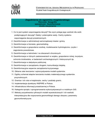 Wydział Nauk Geograficznych i Geologicznych Zagadnienia do egzaminu magisterskiego Kierunek: Geografia specjalność: Geoinformacja studia stacjonarne 1. Co to jest system wspomagania decyzji? Na czym polega jego wartość dla osób podejmujących decyzję? Zalety i potencjalne wady. Cechy systemu wspomagania decyzji przestrzennych. 2. Geoinformacja w administracji samorządowej miasta i gminy. 3. Geoinformacja w biznesie, geomarketing. 4. Geoinformacja w gospodarce wodnej, modelowanie hydrologiczne, ryzyko i zagrożenia powodziowe. 5. Geoinformacja w leśnictwie i na obszarach chronionych. 6. Geoinformacja w różnych zastosowaniach w wojsku, gospodarce rolnej, turystyce, ochronie środowiska, w badaniach archeologicznych i historycznych itp. 7. Geoinformacja w statystyce publicznej. 8. Geoinformacja w zarządzaniu drogami, komunikacją miejską. 9. Geoinformacyjne wsparcie zarządzania kryzysowego. 10. Główne cele tworzenia i wykorzystywania modeli systemów. 11. Ogólny schemat etapów tworzenia modelu matematycznego systemów przyrodniczych. 12. Granice i ich rola w krajobrazie, cechy i podziały granic. 13. Implementacja dyrektywy INSPIRE w Polsce. 14. Infrastruktura informacji przestrzennej w Polsce. 16. Kategorie sprzętu i oprogramowania wykorzystywanych w mobilnym GIS. 17. Metody pozyskiwania cyfrowych modeli wysokościowych i ich wartość interpretacyjna dla rozpoznania geomorfologii danego obszaru; parametry geomorfometryczne. www.wngig.amu.edu.pl Wydział Nauk Geograficznych i Geologicznych 18. Metryki kompozycji i konfiguracji stosowane w analizie struktury krajobrazu i jego przemian. 19. Mobilne systemy geoinformacyjne – definicja, składniki, zastosowania. 20. Partycypacja społeczna w zarządzaniu jednostkami administracyjnymi. 21. Pojęcie ilości informacji. Jak można mierzyć ilość informacji w kontekście różnych typów danych geoprzestrzennych?. 22. Porównanie modeli „fenomenologicznych” i „mechanistycznych”. Ich wady i zalety oraz przykłady. 23. Rola baz danych w systemach informacji geograficznej. 24. Rola geowizualizacji w badaniach geoprzestrzennych. 25. Rola metadanych w analizach geoinformacyjnych. 26. Ryzyko decyzji i jego źródła. 27. Struktura krajobrazu - geokomponenty, procesy przestrzenne przemian krajobrazu. 28. Systemy pozycjonowania używane w mobilnym GIS. 29. Trendy rozwojowe współczesnej geoinformacji. 30. Wolne i komercyjne oprogramowanie geoinformacyjne i bazodanowe, źródła danych przestrzennych. 31. Zasada decyzyjna i jej odmiany. 32. Gradienty ekologiczne i ich wykorzystanie w badaniach naukowych. 33. Zastosowanie analiz wielowymiarowych - pośrednich i bezpośrednich w badaniach ekologicznych. 34. Znaczenie ilościowych rekonstrukcji paleoekologicznych oraz funkcji transferu. www.wngig.amu.edu.pl