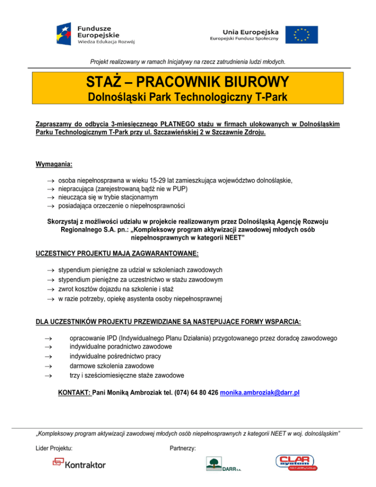 Projekt realizowany w ramach Inicjatywy na rzecz zatrudnienia ludzi młodych. STAŻ – PRACOWNIK BIUROWY Dolnośląski Park Technologiczny T-Park Zapraszamy do odbycia 3-miesięcznego PŁATNEGO stażu w firmach ulokowanych w Dolnośląskim Parku Technologicznym T-Park przy ul. Szczawieńskiej 2 w Szczawnie Zdroju. Wymagania: osoba niepełnosprawna w wieku 15-29 lat zamieszkująca województwo dolnośląskie, niepracująca (zarejestrowaną bądź nie w PUP) nieucząca się w trybie stacjonarnym posiadająca orzeczenie o niepełnosprawności Skorzystaj z możliwości udziału w projekcie realizowanym przez Dolnośląską Agencję Rozwoju Regionalnego S.A. pn.: „Kompleksowy program aktywizacji zawodowej młodych osób niepełnosprawnych w kategorii NEET” UCZESTNICY PROJEKTU MAJĄ ZAGWARANTOWANE: stypendium pieniężne za udział w szkoleniach zawodowych stypendium pieniężne za uczestnictwo w stażu zawodowym zwrot kosztów dojazdu na szkolenie i staż w razie potrzeby, opiekę asystenta osoby niepełnosprawnej DLA UCZESTNIKÓW PROJEKTU PRZEWIDZIANE SĄ NASTĘPUJĄCE FORMY WSPARCIA: opracowanie IPD (Indywidualnego Planu Działania) przygotowanego przez doradcę zawodowego indywidualne poradnictwo zawodowe indywidualne pośrednictwo pracy darmowe szkolenia zawodowe trzy i sześciomiesięczne staże zawodowe KONTAKT: Pani Moniką Ambroziak tel. (074) 64 80 426 [email protected] „Kompleksowy program aktywizacji zawodowej młodych osób niepełnosprawnych z kategorii NEET w woj. dolnośląskim” Lider Projektu: Partnerzy: