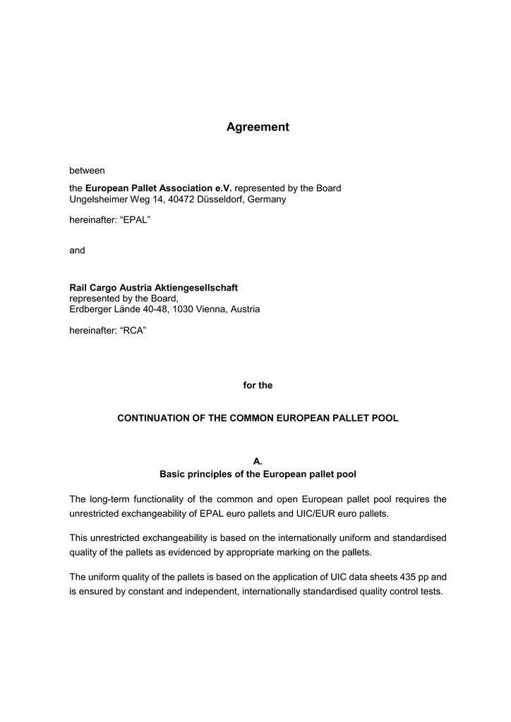 Agreement between the European Pallet Association e.V. represented by the Board Ungelsheimer Weg 14, 40472 Düsseldorf, Germany hereinafter: “EPAL” and Rail Cargo Austria Aktiengesellschaft represented by the Board, Erdberger Lände 40-48, 1030 Vienna, Austria hereinafter: “RCA” for the CONTINUATION OF THE COMMON EUROPEAN PALLET POOL A. Basic principles of the European pallet pool The long-term functionality of the common and open European pallet pool requires the unrestricted exchangeability of EPAL euro pallets and UIC/EUR euro pallets. This unrestricted exchangeability is based on the internationally uniform and standardised quality of the pallets as evidenced by appropriate marking on the pallets. The uniform quality of the pallets is based on the application of UIC data sheets 435 pp and is ensured by constant and independent, internationally standardised quality control tests. Agreement for the continuation of the common European pallet pool between the European Pallet Association e.V. (EPAL) and Rail Cargo Austria AG (RCA) 3 B. Current situation Due to the termination of the collaboration between EPAL and UIC as of 31/12/2012, the pre-requisites for the functionality of the European pallet pool are only being complied with to a limited extent. The marking of the pallets does not have an identity, in full or in part. As far as the users are concerned, this causes problems when exchanging EPAL and UIC/EUR euro pallets. C. Agreements In order to restore the basic principles for the long-term functionality of the European pallet pool, the parties agree to the following: I. Agreement on the unrestricted exchangeability 1. The parties agree, with immediate effect, that wooden flat pallets, which bear the branded marking “EPAL in oval” or “EUR in oval” on at least one corner block of the long side of the pallet, are capable of being exchanged with one another without restriction. This includes pallets currently marked with the “EPAL/EPAL” or “UIC/EUR” branded marks and which in the past have been marked with the “EPAL/EUR” or “EUR” branded marks in combination with various railway marks. 2. EPAL is obligated to actively make reference to the exchangeability of UIC/EUR euro pallets in the EPAL exchange conditions and in all communication with licensees and users of EPAL euro pallets. 3. RCA is obligated to enforce the acceptance of this unrestricted exchangeability as per clause 1 with respect to all member railways of the UIC working group “Palletisation Issues” and actively make reference to the exchangeability of EPAL euro pallets in all communication with licensees and users of UIC/EUR euro pallets. Agreement for the continuation of the common European pallet pool between the European Pallet Association e.V. (EPAL) and Rail Cargo Austria AG (RCA) 3 4. Both parties are obligated not to make any declarations or behave in ways which conflict or may conflict with the unrestricted exchangeability of EPAL and EUR euro pallets. II. Uniform quality control tests 1. The parties agree that is only possible to ensure the permanent guarantee of the uniformly high quality of exchangeable euro pallets by means of internationally uniform quality control tests. 2. It is agreed that EPAL, RCA and any other Railway Undertaking is entitled to commission licensed inspection companies to perform quality control tests on pallets. This agreement is subject to Austrian law without recourse to the rules on conflict of international private law. Any disputes shall be settled by the objective competent court in Vienna as the court of jurisdiction. Düsseldorf, ..[23rd OCTOBER 2014].. Vienna, ...................................... [Signature] [Signature] __________________________ [Signature] __________________________ European Pallet Association e.V. (Rail Cargo Austria AG) (VD Dr. Georg Kasperkovitz) [Signature] __________________________ (VD Drs. Erik Regler)