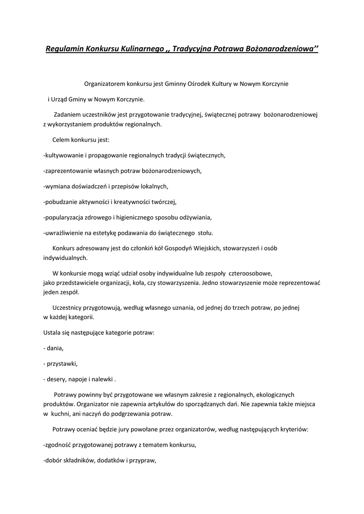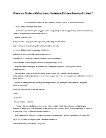 Regulamin Konkursu Kulinarnego ,, Tradycyjna Potrawa Bożonarodzeniowa’’ Organizatorem konkursu jest Gminny Ośrodek Kultury w Nowym Korczynie i Urząd Gminy w Nowym Korczynie. Zadaniem uczestników jest przygotowanie tradycyjnej, świątecznej potrawy bożonarodzeniowej z wykorzystaniem produktów regionalnych. Celem konkursu jest: -kultywowanie i propagowanie regionalnych tradycji świątecznych, -zaprezentowanie własnych potraw bożonarodzeniowych, -wymiana doświadczeń i przepisów lokalnych, -pobudzanie aktywności i kreatywności twórczej, -popularyzacja zdrowego i higienicznego sposobu odżywiania, -uwrażliwienie na estetykę podawania do świątecznego stołu. Konkurs adresowany jest do członkiń kół Gospodyń Wiejskich, stowarzyszeń i osób indywidualnych. W konkursie mogą wziąć udział osoby indywidualne lub zespoły czteroosobowe, jako przedstawiciele organizacji, koła, czy stowarzyszenia. Jedno stowarzyszenie może reprezentować jeden zespół. Uczestnicy przygotowują, według własnego uznania, od jednej do trzech potraw, po jednej w każdej kategorii. Ustala się następujące kategorie potraw: - dania, - przystawki, - desery, napoje i nalewki . Potrawy powinny być przygotowane we własnym zakresie z regionalnych, ekologicznych produktów. Organizator nie zapewnia artykułów do sporządzanych dań. Nie zapewnia także miejsca w kuchni, ani naczyń do podgrzewania potraw. Potrawy oceniać będzie jury powołane przez organizatorów, według następujących kryteriów: -zgodność przygotowanej potrawy z tematem konkursu, -dobór składników, dodatków i przypraw, -walory smakowe i zdrowotne, -estetykę przyrządzenia i sposób podania oraz zaprezentowania potrawy, -oryginalność, kreatywność i własną inwencję. W konkursie zostaną przyznane trzy nagrody za pierwsze, drugie i trzecie miejsce w każdej kategorii oraz wyróżnienia. O ilości wyróżnień zadecyduje jury. Jury zastrzega sobie także inny podział nagród. Zgłoszenia należy kierować do Gminnego Ośrodka Kultury w Nowym Korczynie, ul. Tarnowska 5 do dnia 14 grudnia 2014 roku do godz. 16.30. Rozstrzygnięcie konkursu nastąpi na uroczystości w dniu 14 grudnia 2004 r. o godz. 17.00, która odbędzie się w Remizie OSP w Nowym Korczynie. W ramach konkursu uczestnicy zobowiązani są do przygotowania we własnym zakresie stoiska konkursowego, nakrycia stołu, ozdób, naczyń i sztućców. Zdjęcia i przepisy z potrawą zamieszczone będą na stronie internetowej Urzędu Gminy w Nowym Korczynie. Przepisy na potrawy można przesyłać na adres e-mail GOK-u zamieszczony poniżej lub dostarczyć bezpośrednio do Gminnego Ośrodka Kultury. Zgłoszenie potrawy do konkursu jest równoznaczne z wyrażeniem zgody na publikację przepisu oraz wizerunku w wydawanych publikacjach oraz w Internecie. Zgłaszając się do konkursu uczestnik lub drużyna jednocześnie oświadcza, że wyraża zgodę na wykorzystanie swoich danych osobowych przez organizatorów w celu promocji konkursu, publikacji i przyznawania nagród. Szczegółowych informacji o konkursie udziela Gminny Ośrodek Kultury w Nowym Korczynie ul. Tarnowska 5, 28-136 Nowy Korczyn tel./ faks 413771126 lub tel. 511299988; e-mail: [email protected] .