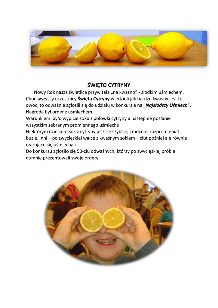 ŚWIĘTO CYTRYNY Nowy Rok nasza świetlica przywitała „na kwaśno” - słodkim uśmiechem. Choć wszyscy uczestnicy Święta Cytryny wiedzieli jak bardzo kwaśny jest to owoc, to odważnie zgłosili się do udziału w konkursie na „Najsłodszy Uśmiech”. Nagrodą był order z uśmiechem. Warunkiem było wypicie soku z połówki cytryny a następnie posłanie wszystkim zebranym promiennego uśmiechu. Niektórym dzieciom sok z cytryny jeszcze szybciej i mocniej rozpromieniał buzie. Inni – po zwycięskiej walce z kwaśnym sokiem – ciut później ale równie czarująco się uśmiechali. Do konkursu zgłosiło się 50-ciu odważnych, którzy po zwycięskiej próbie dumnie prezentowali swoje ordery.