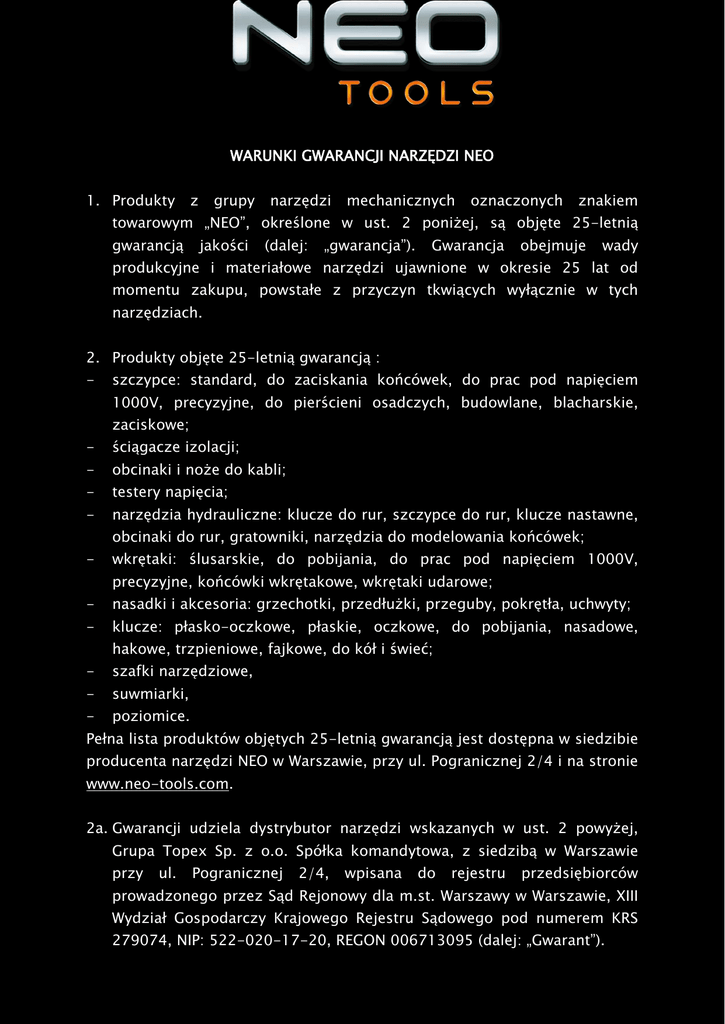 WARUNKI GWARANCJI NARZĘDZI NEO 1. Produkty z grupy narzędzi mechanicznych oznaczonych znakiem towarowym „NEO”, określone w ust. 2 poniżej, są objęte 25-letnią gwarancją jakości (dalej: „gwarancja”). Gwarancja obejmuje wady produkcyjne i materiałowe narzędzi ujawnione w okresie 25 lat od momentu zakupu, powstałe z przyczyn tkwiących wyłącznie w tych narzędziach. 2. Produkty objęte 25-letnią gwarancją : - - szczypce: standard, do zaciskania końcówek, do prac pod napięciem 1000V, precyzyjne, do pierścieni osadczych, budowlane, blacharskie, zaciskowe; ściągacze izolacji; - obcinaki i noże do kabli; - narzędzia hydrauliczne: klucze do rur, szczypce do rur, klucze nastawne, - - - - testery napięcia; obcinaki do rur, gratowniki, narzędzia do modelowania końcówek; wkrętaki: ślusarskie, do pobijania, do prac pod napięciem 1000V, precyzyjne, końcówki wkrętakowe, wkrętaki udarowe; nasadki i akcesoria: grzechotki, przedłużki, przeguby, pokrętła, uchwyty; klucze: płasko-oczkowe, płaskie, oczkowe, do pobijania, nasadowe, hakowe, trzpieniowe, fajkowe, do kół i świeć; szafki narzędziowe, suwmiarki, poziomice. Pełna lista produktów objętych 25-letnią gwarancją jest dostępna w siedzibie producenta narzędzi NEO w Warszawie, przy ul. Pogranicznej 2/4 i na stronie www.neo-tools.com. 2a. Gwarancji udziela dystrybutor narzędzi wskazanych w ust. 2 powyżej, Grupa Topex Sp. z o.o. Spółka komandytowa, z siedzibą w Warszawie przy ul. Pogranicznej 2/4, wpisana do rejestru przedsiębiorców prowadzonego przez Sąd Rejonowy dla m.st. Warszawy w Warszawie, XIII Wydział Gospodarczy Krajowego Rejestru Sądowego pod numerem KRS 279074, NIP: 522-020-17-20, REGON 006713095 (dalej: „Gwarant”). 3. Gwarancją objęte są narzędzia NEO, używane wyłącznie zgodnie z ich przeznaczeniem. Gwarancja nie obejmuje produktów, które były niewłaściwie użytkowane, w których dokonywano zmian konstrukcyjnych, oraz zużytych lub naprawianych przez Użytkownika lub osobę trzecią. Gwarancja nie obejmuje produktów w przypadku gdy nastąpiło ich naturalne zużycie. 4. W - przypadku wystąpienia zobowiązany jest do: niesprawności narzędzia, użytkownik powstrzymania się od używania uszkodzonego sprzętu od chwili stwierdzenia usterki, dostarczenia do naprawy kompletnego narzędzia wraz z niezbędnymi dokumentami do punktu sprzedaży lub punktu serwisowego. 5. W przypadku kompletu narzędzi 25-letnia gwarancja obejmuje tylko uszkodzony produkt, a nie cały komplet. 6. Gwarant rozpatrzy zgłoszenie reklamacyjne w terminie 14 dni roboczych od daty dostarczenia produktu do punktu serwisowego wskazanego w ust. 4 powyżej. Z przyczyn niezależnych od Gwaranta wskazany powyżej termin może ulec zmianie, w szczególności gdy produkt wymaga dodatkowej ekspertyzy rzeczoznawcy lub wystąpią okoliczności mające postać siły wyższej uniemożliwiającej jego zachowanie np. :powódź, pożar, strajki, klęski żywiołowe, restrykcje importowe itp. 7. Ujawnione w trakcie użytkowania wady produktów NEO będą bezpłatnie usuwane, sposób usuwania wady określa Gwarant. W przypadku uznania gwarancji uszkodzonego produktu, Gwarant dopuszcza następujące sposoby realizacji gwarancji: naprawa, wymiana produktu na nowy, wymiana produktu na nowy o podobnej charakterystyce, lub zwrot gotówki (ceny nabycia produktu) na podstawie dowodu zakupu. Realizacja wybranego przez Gwaranta sposobu usunięcia wady nastąpi w terminie 14 dni roboczych od dnia rozpatrzenia zgłoszenia reklamacyjnego. 8. Uprawnienia wynikające z gwarancji realizowane będą po przedstawieniu przez Użytkownika: a. Dowodu zakupu (faktury lub paragonu) b. Kompletnego produktu zgłaszanego gwarancyjnie; 9. Gwarancji nie podlegają: a. Adaptery (ukręcone) redukcyjne, zbyt ponieważ dużym mogą momentem zostać osiąganym łatwo przez uszkodzone grzechotki z większymi czopami. Podczas pracy wymagającej użycia adapterów należy zachować szczególną ostrożność. b. Uszkodzenie końcówki wkrętaków i końcówek wkrętakowych wynikające z naturalnego zużycia. c. Wkrętaki uszkodzone w wyniku użycia nadmiernego momentu obrotowego, skutkującego ukręceniem, złamaniem i wykruszeniem materiału. d. Wykrzywione albo uszkodzone trzony wkrętaków, ponieważ są wyraźnym efektem ich niewłaściwego używania, między innymi jako pobijaków, dźwigni, dłut. e. Nasadki, nasadki typu BIT mające zaokrąglone krawędzie zewnętrzne lub wyraźne znaki uderzeń (odpryski, rysy, wgniecenia) wokół prowadnicy, które jasno wskazują na stosowanie ich w połączeniu z kluczami udarowymi lub innymi napędami mechanicznymi. Współpraca elementów opisanych w punkcie 9e w połączeniu z kluczami udarowymi doprowadzi f. do szybkiego ich uszkodzenia. Grzechotki i klucze, które mają wyszczerbienia, wyżłobienia i uszkodzenia, wskazujące na wyraźne używanie w stosunku do nich młotków lub innych niewłaściwych narzędzi. g. Mechanizmy zapadkowe grzechotek o ile ich uszkodzenie jest wynikiem naturalnego ich zużycia. h. Mechaniczne uszkodzenia produktu lub jego części, i. Roszczenia z tytułu parametrów technicznych produktu o ile są one j. Uszkodzenia zgodne z podanymi przez producenta, lub wady wynikające przechowywania, konserwacji, z niewłaściwego użytkowania, k. Skutki samowolnych napraw, przeróbek lub zmian konstrukcyjnych l. dokonanych przez Użytkownika lub osoby trzecie, Uszkodzenia powstałe pośrednio lub bezpośrednio wskutek zdarzeń zewnętrznych, np.: powódź, pożar, uderzenie pioruna i inne. 10. Gwarant nie ponosi żadnej odpowiedzialności za szkodę na mieniu lub zdrowiu wynikłą z użytkowania narzędzia, a stanowiącą następstwo jego użytkowania niezgodnego z jego przeznaczeniem eksploatacyjnymi ustalonymi przez producenta. lub warunkami 11. Gwarant nie odpowiada za bezpośrednie i pośrednie szkody i straty związane z użyciem lub niemożliwością użycia narzędzia