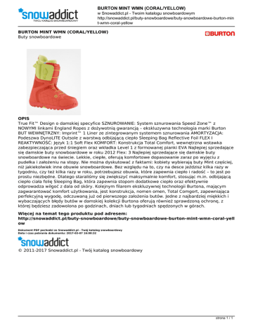 BURTON MINT WMN (CORAL/YELLOW) w Snowaddict.pl - Twoim katalogu snowboardowym http://snowaddict.pl/buty-snowboardowe/buty-snowboardowe-burton-min t-wmn-coral-yellow BURTON MINT WMN (CORAL/YELLOW) Buty snowboardowe OPIS True Fit™ Design o damskiej specyfice SZNUROWANIE: System sznurowania Speed Zone™ z NOWYMI linkami England Ropes z dożywotnią gwarancją – ekskluzywna technologia marki Burton BUT WEWNĘTRZNY: Imprint™ 1 Liner ze zintegrowanym systemem sznurowania AMORTYZACJA: Podeszwa DynoLITE Outsole z warstwą odbijającą ciepło Sleeping Bag Reflective Foil FLEX I REAKTYWNOŚĆ: Język 1:1 Soft Flex KOMFORT: Konstrukcja Total Comfort, wewnętrzna wstawka zabezpieczająca przed śniegiem oraz wkładka Level 1 z formowanej pianki EVA Najlepiej sprzedające się damskie buty snowboardowe w roku 2012 Flex: 3 Najlepiej sprzedające się damskie buty snowboardowe na świecie. Lekkie, ciepłe, oferują komfortowe dopasowanie zaraz po wyjęciu z pudełka i założeniu na stopy. Nie można dyskutować z faktami: kobiety wybierają buty Mint częściej, niż jakiekolwiek inne obuwie snowboardowe. Bez względu na to, czy na desce jeździsz kilka razy w tygodniu, czy też kilka razy w roku, potrzebujesz obuwia, które zapewnia ciepło i radość – to jest po prostu niezbędne. Dlatego staraliśmy się zwiększyć maksymalnie komfort, stosując m.in. odbijającą ciepło ciała folię Sleeping Bag, która zapewnia stopom dodatkowe ciepło oraz efektywnie odprowadza wilgoć z dala od skóry. Kolejnym filarem ekskluzywnej technologii Burtona, mającym zagwarantować komfort użytkowania, jest konstrukcja, nomen omen, Total Comgort, zapewniająca perfekcyjną wygodę, odczuwaną już od pierwszego założenia butów. Jedne z najbardziej miękkich i wybaczających błędy butów w damskiej kolekcji Burtona oferują również sprawdzoną ochronę, z której będziesz zadowolona po godzinach, dniach lub tygodniach spędzonych w górach. Więcej na temat tego produktu pod adresem: http://snowaddict.pl/buty-snowboardowe/buty-snowboardowe-burton-mint-wmn-coral-yell ow Dokument PDF pochodzi ze Snowaddict.pl - Twój katalog snowboardowy Data i czas pobrania dokumentu: 2017-03-07 16:00:32 © 2011-2017 Snowaddict.pl - Twój katalog snowboardowy strona 1 / 1 Powered by TCPDF (www.tcpdf.org)