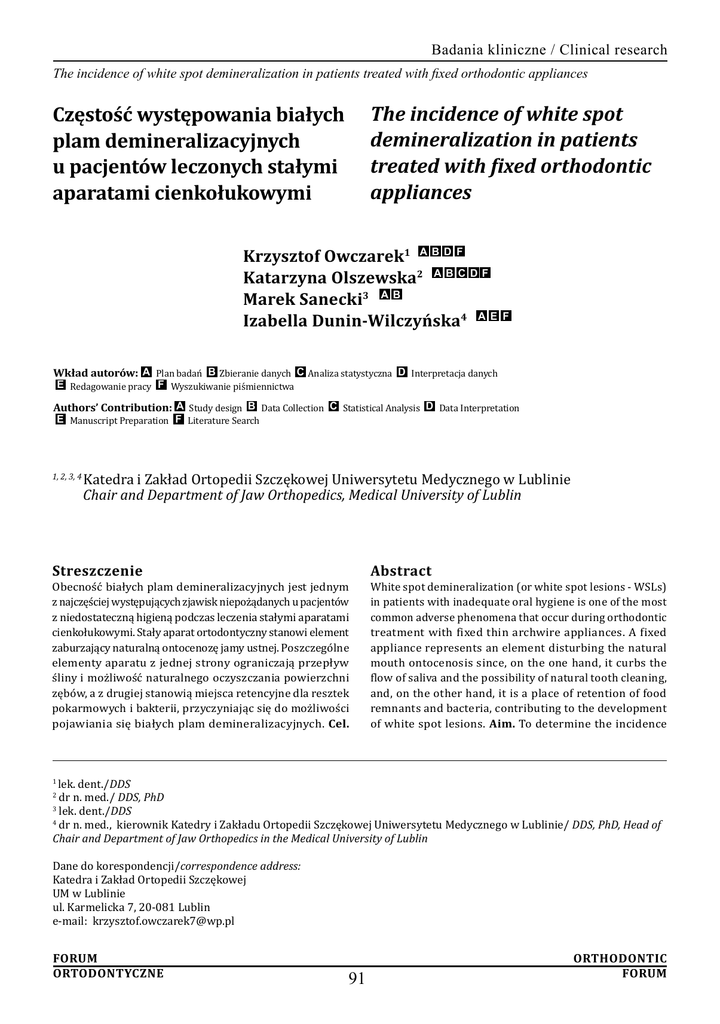 Badania kliniczne / Clinical research The incidence of white spot demineralization in patients treated with fixed orthodontic appliances The incidence of white spot demineralization in patients treated with fixed orthodontic appliances Częstość występowania białych plam demineralizacyjnych u pacjentów leczonych stałymi aparatami cienkołukowymi Krzysztof Owczarek1 A B D F Katarzyna Olszewska2 A B C D F Marek Sanecki3 A B Izabella Dunin-Wilczyńska4 A E F Wkład autorów: A Plan badań B Zbieranie danych C Analiza statystyczna D Interpretacja danych E Redagowanie pracy F Wyszukiwanie piśmiennictwa Authors’ Contribution: A Study design B Data Collection C Statistical Analysis D Data Interpretation E Manuscript Preparation F Literature Search 1, 2, 3, 4 Katedra i Zakład Ortopedii Szczękowej Uniwersytetu Medycznego w Lublinie Chair and Department of Jaw Orthopedics, Medical University of Lublin Streszczenie Obecność białych plam demineralizacyjnych jest jednym z najczęściej występujących zjawisk niepożądanych u pacjentów z niedostateczną higieną podczas leczenia stałymi aparatami cienkołukowymi. Stały aparat ortodontyczny stanowi element zaburzający naturalną ontocenozę jamy ustnej. Poszczególne elementy aparatu z jednej strony ograniczają przepływ śliny i możliwość naturalnego oczyszczania powierzchni zębów, a z drugiej stanowią miejsca retencyjne dla resztek pokarmowych i bakterii, przyczyniając się do możliwości pojawiania się białych plam demineralizacyjnych. Cel. Abstract White spot demineralization (or white spot lesions - WSLs) in patients with inadequate oral hygiene is one of the most common adverse phenomena that occur during orthodontic treatment with fixed thin archwire appliances. A fixed appliance represents an element disturbing the natural mouth ontocenosis since, on the one hand, it curbs the flow of saliva and the possibility of natural tooth cleaning, and, on the other hand, it is a place of retention of food remnants and bacteria, contributing to the development of white spot lesions. Aim. To determine the incidence lek. dent./DDS dr n. med./ DDS, PhD 3 lek. dent./DDS 4 dr n. med., kierownik Katedry i Zakładu Ortopedii Szczękowej Uniwersytetu Medycznego w Lublinie/ DDS, PhD, Head of Chair and Department of Jaw Orthopedics in the Medical University of Lublin 1 2 Dane do korespondencji/correspondence address: Katedra i Zakład Ortopedii Szczękowej UM w Lublinie ul. Karmelicka 7, 20-081 Lublin e-mail: [email protected] ForumOrthodontic Ortodontyczneforum 91 Badania kliniczne / Clinical research K. Owczarek, K. Olszewska et. al Celem pracy było określenie częstości występowania oraz lokalizacji białych plam demineralizacyjnych u pacjentów ze stałymi aparatami cienkołukowymi. Materiał i metody. Badaniem objęto 100 losowo wybranych pacjentów leczonych stałymi aparatami cienkołukowymi. Pacjentów podzielono na 3 grupy, w zależności od czasu trwania leczenia ortodontycznego. Metodą wzrokową sprawdzano częstość pojawiania się, liczbę oraz lokalizację plam demineralizacyjnych na powierzchniach wargowych i przedsionkowych zębów. Zaawansowanie białych plam oceniano przy użyciu wskaźnika Gorelicka. Do oceny higieny użyto wskaźnika PIOP. Wyniki. Stwierdzono występowanie białych plam u od 20% do 46,67% badanych, a im dłuższy był czas leczenia ortodontycznego, tym większa była frekwencja białych plam. Zębami najczęściej dotkniętymi białymi plamami były siekacze i kły. Demineralizacja występowała częściej u osób płci męskiej niż żeńskiej. Im gorszy był stan higieny jamy ustnej, tym częściej występowała demineralizacja. Wnioski. Badania wykazały zależność między higieną jamy ustnej a obecnością białych plam demineralizacyjnych na powierzchni szkliwa. Czas leczenia ortodontycznego z zastosowaniem stałych aparatów cienkołukowych zwiększa prawdopodobieństwo wystąpienia demineralizacji szkliwa. (Owczarek K, Olszewska K, Sanecki M, Dunin-Wilczyńska I. Częstość występowania białych plam demineralizacyjnych u pacjentów leczonych stałymi aparatami cienko łukowymi. Forum Ortod 2014; 10: 91-100). Nadesłano 3.04.2014 Przyjęto do druku 3.06.2014 and location of white spots in patients treated with fixed thin archwire appliances. Material and methods. The study group consisted of 100 randomly selected patients treated with fixed thin archwire appliances. The patients were divided into 3 groups depending on the duration of orthodontic treatment. The incidence, number, and location of white spot lesions on the labial and buccal surfaces of tooth crowns were visually checked. The severity of demineralization was assessed using the Gorelick index. The oral hygiene was evaluated with the PIOP index. Results. White spot demineralization was observed in 20 to 46.67% of the patients. The longer the duration of the treatment, the higher the incidence of white spot lesions was. The incisors and canines were the were most frequently affected with white spot lesions. Demineralization was more common in males than in females. The worse the oral hygiene status, the higher the incidence of white spot lesions was reported. Conclusions. The study revealed a correlation between the oral hygiene status and the occurrence of white spot lesions on tooth enamel surface. The duration of treatment with fixed thin archwire appliances enhances the probability of enamel demineralization. (Owczarek K, Olszewska K, Sanecki M, Dunin-Wilczyńska I. The incidence of white spot demineralization in patients treated with fixed orthodontic appliances. Forum Ortod 2014; 10: 91100). Received 3.04.2014 Accepted 3.06.2014 Wstęp Introduction Słowa kluczowe: białe plamy demineralizacyjne, higiena jamy ustnej, aparat stały cienkołukowy Obecność białych plam demineralizacyjnych jest częstym zjawiskiem niepożądanym, które może się pojawiać u pacjentów z niedostateczną higieną podczas leczenia or