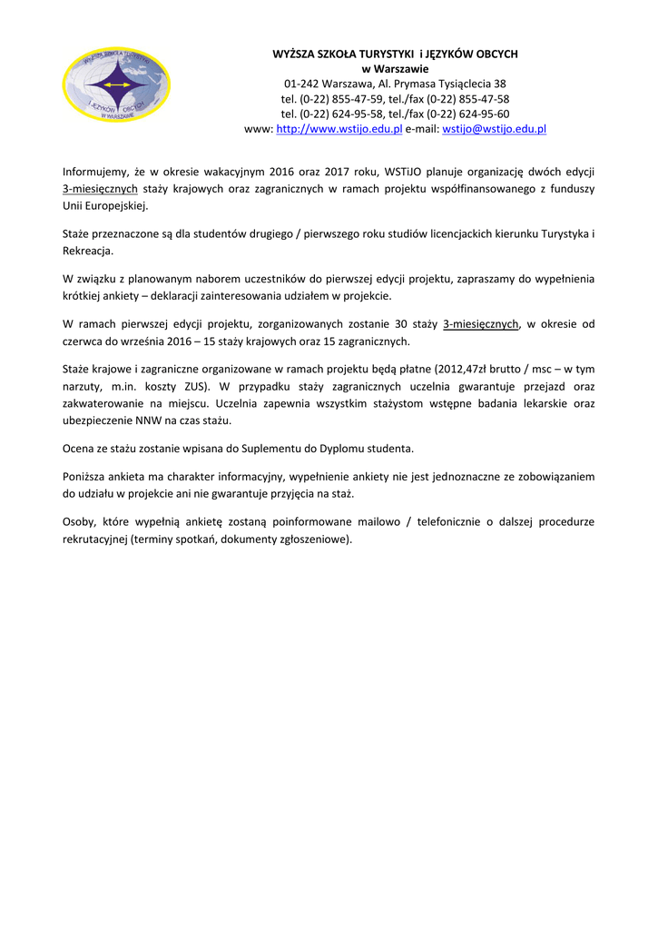 WYŻSZA SZKOŁA TURYSTYKI i JĘZYKÓW OBCYCH w Warszawie 01-242 Warszawa, Al. Prymasa Tysiąclecia 38 tel. (0-22) 855-47-59, tel./fax (0-22) 855-47-58 tel. (0-22) 624-95-58, tel./fax (0-22) 624-95-60 www: http://www.wstijo.edu.pl e-mail: [email protected] Informujemy, że w okresie wakacyjnym 2016 oraz 2017 roku, WSTiJO planuje organizację dwóch edycji 3-miesięcznych staży krajowych oraz zagranicznych w ramach projektu współfinansowanego z funduszy Unii Europejskiej. Staże przeznaczone są dla studentów drugiego / pierwszego roku studiów licencjackich kierunku Turystyka i Rekreacja. W związku z planowanym naborem uczestników do pierwszej edycji projektu, zapraszamy do wypełnienia krótkiej ankiety – deklaracji zainteresowania udziałem w projekcie. W ramach pierwszej edycji projektu, zorganizowanych zostanie 30 staży 3-miesięcznych, w okresie od czerwca do września 2016 – 15 staży krajowych oraz 15 zagranicznych. Staże krajowe i zagraniczne organizowane w ramach projektu będą płatne (2012,47zł brutto / msc – w tym narzuty, m.in. koszty ZUS). W przypadku staży zagranicznych uczelnia gwarantuje przejazd oraz zakwaterowanie na miejscu. Uczelnia zapewnia wszystkim stażystom wstępne badania lekarskie oraz ubezpieczenie NNW na czas stażu. Ocena ze stażu zostanie wpisana do Suplementu do Dyplomu studenta. Poniższa ankieta ma charakter informacyjny, wypełnienie ankiety nie jest jednoznaczne ze zobowiązaniem do udziału w projekcie ani nie gwarantuje przyjęcia na staż. Osoby, które wypełnią ankietę zostaną poinformowane mailowo / telefonicznie o dalszej procedurze rekrutacyjnej (terminy spotkań, dokumenty zgłoszeniowe). WYŻSZA SZKOŁA TURYSTYKI i JĘZYKÓW OBCYCH w Warszawie 01-242 Warszawa, Al. Prymasa Tysiąclecia 38 tel. (0-22) 855-47-59, tel./fax (0-22) 855-47-58 tel. (0-22) 624-95-58, tel./fax (0-22) 624-95-60 www: http://www.wstijo.edu.pl e-mail: [email protected] Nazwisko …………………………………………………………………………………………………………………………………………… Imię …………………………………………………………………………………………………………………………………………………... Kierunek ……………………………………………………………………………………………………………………………………………… Specjalizacja ……………………..……………………………………………………………………………………………………….………. Rok studiów : DRUGI- staż w roku 2016 Rok studiów: PIERWSZY – staż w roku 2017 Tel. komórkowy …………………………………………………………. e-mail …………………………………………………………………….….. Interesuje mnie 3-miesięczny staż: Wyłącznie krajowy Wyłącznie zagraniczny Krajowy lub zagraniczny Staż krajowy – preferowane miejsce: Hotel Obiekt hotelowo / restauracyjny Biuro podróży / izba turystyczna Staż zagraniczny (obiekty hotelowo – gastronomiczne) – preferowany kraj / kraje: Cypr Francja Grecja Litwa Słowacja Znajomość języków obcych: Język angielski: bardzo dobra / dobra / słaba Język rosyjski: bardzo dobra / dobra / słaba Język francuski: bardzo dobra / dobra / słaba Język niemiecki: bardzo dobra / dobra / słaba Inny ……………………………….: bardzo dobra / dobra / słaba WYŻSZA SZKOŁA TURYSTYKI i JĘZYKÓW OBCYCH w Warszawie 01-242 Warszawa, Al. Prymasa Tysiąclecia 38 tel. (0-22) 855-47-59, tel./fax (0-22) 855-47-58 tel. (0-22) 624-95-58, tel./fax (0-22) 624-95-60 www: http://www.wstijo.edu.pl e-mail: [email protected] Chciałbym / chciałabym wyjechać z : (imię i nazwisko studenta, z którym chciałbym / chciałabym wyjechać) …………………………………………………………………………………………………………………………………………. Doświadczenie zawodowe (należy podać dotychczasowe miejsca pracy / praktyk / stażu zawodowego i krótką charakterystykę zajmowanego stanowiska) ……………………………………………………………………........ ……………………………………………………………………………………………………………………………………………………………. ……………………………………………………………………………………………………………………………………………………………. ……………………………………………………………………………………………………………………………………………………………. Umiejętności i zainteresowania: …………………………………………………………………………………………………………. ……………………………………………………………………………………………………………………………………………………………. ………………………………………………………………………………………………………………………………………………………….... „Wyrażam zgodę na przetwarzanie moich danych osobowych dla potrzeb niezbędnych do realizacji procesu rekrutacji (zgodnie z Ustawą z dnia 29.08.1997 roku o Ochronie Danych Osobowych; tekst jednolity: Dz.U.z 2014r., poz.1182 ze zm.)”.