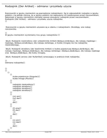 Rodzajnik (Der Artikel) - odmiana i przykłady użycia Rzeczowniki w języku niemieckim są poprzedzone rodzajnikami. Są to odpowiedniki rodzajów w języku polskim z tą jednak różnicą, że w języku polskim nie zapisujemy ich każdorazowo przed rzeczownikiem. Natomiast w języku niemieckim niemalże zawsze stosujemy rodzajniki przed rzeczownikami. Rodzajnik (Der Artikel) - odmiana i przykłady użycia rodzajnika Rzeczowniki w języku niemieckim używane są w zdaniu z rodzajnikami. Określają one rodzaj rzeczownika. W języku niemieckim wyróżniamy trzy grupy rodzajników: • Rodzajnik nieokreślony (der unbestimmte Artikel) „ein” dla rodzaju męskiego i nijakiego, „eine” dla rodzaju żeńskiego, w liczbie mnogiej nie ma rodzajnika nieokreślonego, • Rodzajnik określony (der bestimmte Artikel) w liczbie pojedynczej „der” dla rodzaju męskiego, „die” dla rodzaju żeńskiego i „das” dla rodzaju nijakiego oraz „die” dla liczby mnogiej, • Rodzajnik zerowy (der Nullartikel) oznaczający w praktyce brak rodzajnika. Odmiana rodzajnika liczba pojedyncza (Singular) liczba mnoga (Plural) rodzajnik rodzajnik rodzajnik rodzajnik nieokreślony określony określony określony (m) ein (m) der - die (f) eine (f) die - die (n) ein (n) das - die http://www.twojniemiecki.pl Kreator PDF Utworzono 7 March, 2017, 15:00 Rodzaje rzeczowników w języku niemieckim nie pokrywają się z ich rodzajami w języku polskim. Dlatego konieczna jest od początku nauka rzeczowników niemieckich wraz z rodzajnikami: np.: w języku niemieckim die Katze (kot) – rodzaj żeński, w języku polskim zaś „kot” posiada rodzaj męski. w języku niemieckim das Mädchen (dziewczynka) - rodzaj nijaki, w języku polskim zaś "dziewczynka" posiada rodzaj żeński. Przykłady użycia rodzajnika Rodzajnik nieokreślony (Der unbestimmte Artikel) Rodzajnika nieokreślonego używamy wtedy, gdy mówimy o nieznanej nam bliżej osobie, rzeczy, przedmiocie etc. oraz gdy mówi się o czymś pierwszy raz. Rodzajnik określony (Der bestimmte Artikel) Rodzajnika określonego używamy wówczas, gdy wspomnieliśmy już o danej rzeczy w poprzednim zdaniu, gdy wiemy już coś konkretnego o danym rzeczowniku. Np.: Sie hat eine Blume. (Ona ma kwiat. - bliżej nieokreślony kwiat, nie mamy o nim żadnych konkretnych informacji, mówimy o nim po raz pierwszy) Die Blume ist rot. (Kwiat jest czerwony. - jest podana cecha kwiatu, mówimy o nim po raz kolejny, wiemy o który kwiat chodzi) Rodzajnik zerowy (Der Null-Artikel) Rodzajnika nie używa się: • przed imionami i nazwiskami: Thomas hat ein Auto. Merkel wohnt in Deutschland. • przed rzeczownikami oznaczającymi narodowość lub zawód: Gerhard Schröder ist Deutscher. Mein Vater ist Psychologe. • przed nazwami własnymi, przed nazwami miast, kontynentów, większością nazw krajów i krain geograficznych: Berlin liegt an der Spree. Afrika ist ein Kontinent. Polen grenzt an Deutschland. • przy zastosowaniu wyrazów Herr i Frau: Frau und Herr Müller gehen spazieren. • po zaimkach dzierżawczych: Unsere Lehrerin ist nett. Mein Kind ist brav. • przed rzeczownikami nazywającymi materiały, bliżej nieokreślonymi: http://www.twojniemiecki.pl Kreator PDF Utworzono 7 March, 2017, 15:00 Stahl ist ein Metal. Ich mag Wein. • po liczebnikach głównych oraz wyrazach określających ilość, miarę i wagę: Ich habe 2 Freundinnen. Ich kaufe 2 Kilo Äpfel. • po wyrazach: viel (dużo), wenig (mało), etwas (trochę): Wir haben wenig Zeit. • w niektórych przysłowiach lub wyrażeniach: Eile mit Weile. (Śpiesz się powoli.) http://www.twojniemiecki.pl Kreator PDF Utworzono 7 March, 2017, 15:00