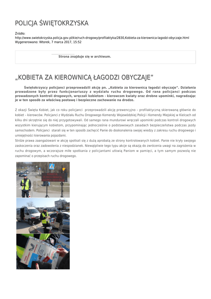 POLICJA ŚWIĘTOKRZYSKA Źródło: http://www.swietokrzyska.policja.gov.pl/kie/ruch-drogowy/profilaktyka/2830,Kobieta-za-kierownica-lagodzi-obyczaje.html Wygenerowano: Wtorek, 7 marca 2017, 15:52 Strona znajduje się w archiwum. „KOBIETA ZA KIEROWNICĄ ŁAGODZI OBYCZAJE” Świętokrzyscy policjanci przeprowadzili akcję pn. „Kobieta za kierownicą łagodzi obyczaje”. Działania prowadzone były przez funkcjonariuszy z wydziału ruchu drogowego. Od rana policjanci podczas prowadzonych kontroli drogowych, wręczali kobietom - kierowcom kwiaty oraz drobne upominki, nagradzając je w ten sposób za właściwą postawę i bezpieczne zachowanie na drodze. Z okazji Święta Kobiet, jak co roku policjanci przeprowadzili akcję prewencyjno – profilaktyczną skierowaną głównie do kobiet – kierowców. Policjanci z Wydziału Ruchu Drogowego Komendy Wojewódzkiej Policji i Komendy Miejskiej w Kielcach od kilku dni skrzętnie się do niej przygotowywali. Od samego rana mundurowi wręczali upominki podczas kontroli drogowych wszystkim kierującym kobietom, przypominając jednocześnie o podstawowych zasadach bezpieczeństwa podczas jazdy samochodem. Policjanci starali się w ten sposób zachęcić Panie do doskonalenia swojej wiedzy z zakresu ruchu drogowego i umiejętności kierowania pojazdami. Stróże prawa zaangażowani w akcję spotkali się z dużą aprobatą ze strony kontrolowanych kobiet. Panie nie kryły swojego zaskoczenia oraz zadowolenia z niespodzianek. Niewątpliwie tego typu akcje są okazją do zwrócenia uwagi na zagrożenia w ruchu drogowym, a wczorajsze miłe spotkania z policjantami utkwią Paniom w pamięci, a tym samym pozwolą nie zapominać o przepisach ruchu drogowego. Ocena: 0/5 (0) Tweetnij