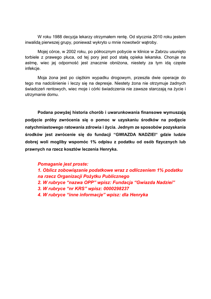 W roku 1988 decyzja lekarzy otrzymałem rentę. Od stycznia 2010 roku jestem inwalidą pierwszej grupy, ponieważ wykryto u mnie nowotwór wątroby. Mojej córce, w 2002 roku, po półrocznym pobycie w klinice w Zabrzu usunięto torbiele z prawego płuca, od tej pory jest pod stałą opieka lekarska. Choruje na astmę, wiec jej odporność jest znacznie obniżona, niestety za tym idą częste infekcje. Moja żona jest po ciężkim wypadku drogowym, przeszła dwie operacje do tego ma nadciśnienie i leczy się na depresje. Niestety żona nie otrzymuje żadnych świadczeń rentowych, wiec moje i córki świadczenia nie zawsze starczają na życie i utrzymanie domu. Podana powyżej historia chorób i uwarunkowania finansowe wymuszają podjęcie próby zwrócenia się o pomoc w uzyskaniu środków na podjęcie natychmiastowego ratowania zdrowia i życia. Jednym ze sposobów pozyskania środków jest zwrócenie się do fundacji “GWIAZDA NADZIEI“ gdzie ludzie dobrej woli mogliby wspomóc 1% odpisu z podatku od osób fizycznych lub prawnych na rzecz kosztów leczenia Henryka. Pomaganie jest proste: 1. Oblicz zobowiązanie podatkowe wraz z odliczeniem 1% podatku na rzecz Organizacji Pożytku Publicznego 2. W rubryce “nazwa OPP” wpisz: Fundacja “Gwiazda Nadziei” 3. W rubryce “nr KRS” wpisz: 0000298237 4. W rubryce “inne informacje” wpisz: dla Henryka