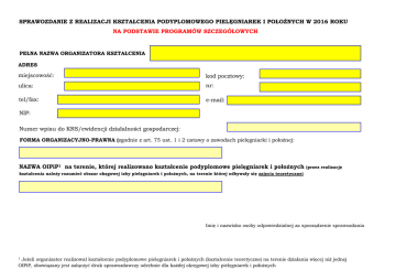 SPRAWOZDANIE Z REALIZACJI KSZTAŁCENIA PODYPLOMOWEGO PIELĘGNIAREK I POŁOŻNYCH W 2016 ROKU NA PODSTAWIE PROGRAMÓW SZCZEGÓŁOWYCH PEŁNA NAZWA ORGANIZATORA KSZTAŁCENIA ADRES miejscowość: kod pocztowy: ulica: nr: tel/fax: e-mail: NIP: Numer wpisu do KRS/ewidencji działalności gospodarczej: FORMA ORGANIZACYJNO-PRAWNA (zgodnie z art. 75 ust. 1 i 2 ustawy o zawodach pielęgniarki i położnej: NAZWA OIPiP1 na terenie, której realizowano kształcenie podyplomowe pielęgniarek i położnych (przez realizację kształcenia należy rozumieć obszar okęgowej izby pielęgniarek i położnych, na terenie której odbywały się zajęcia teoretyczne) Imię i nazwisko osoby odpowiedzialnej za sporządzenie sprawozdania Jeżeli organizator realizował kształcenie podyplomowe pielęgniarek i położnych (kształcenie teoretyczne) na terenie działania więcej niż jednej OIPiP, obowiązany jest załączyć druk sprawozdawczy odrębnie dla każdej okręgowej izby pielęgniarek i położnych 1 1. Szkolenia specjalizacyjne realizowane na przełomie roku 2016/2017 na podstawie programów szczegółowych Dziedzina kształcenia 1 System kształcenia Jeżeli nie dotyczy proszę zostawić puste pole Numer wpisu do rejestru1 Numer umowy (specjalizacja dofinansowana przez MZ) 1 Data rozpoczęcia zajęć (dzień/miesiąc/rok) Data zakończenia specjalizacji (dzień/miesiąc/rok) Liczba osób, które zaliczyły specjalizację w tym: Piel. Poł. 2 Kursy kwalifikacyjne realizowane w 2016 roku na podstawie programów szczegółowych Dziedzina kształcenia 1 System kształcenia Jeżeli nie dotyczy proszę zostawić puste pole Numer wpisu do rejestru1 Liczba zrealizowanych Liczba osób, które edycji kursu ukończyły kurs kwalifikacyjnego kwalifikacyjny w 2016 r. zakończonych egzaminem w 2016 roku Piel. Poł. Liczba edycji aktualnie realizowanych kursów kwalifikacyjnych, których zakończenie odbędzie się w 2017 roku Liczba uczestników aktualnie realizowanych edycji kursów kwalifikacyjnych Piel. Poł. 3 Kursy specjalistyczne realizowane w 2016 roku na podstawie programów szczegółowych Zakres kształcenia 1 System kształcenia Numer wpisu do Jeżeli nie dotyczy proszę zostawić puste pole rejestru1 Liczba osób, które Liczba zrealizowanych ukończyły kurs edycji kursu specjalistyczny w 2016 r. specjalistycznego zakończonych Piel. Poł. egzaminem w 2016 roku Liczba edycji aktualnie realizowanych kursów specjalistycznych, których zakończenie odbędzie się w 2017 roku Liczba uczestników aktualnie realizowanych edycji kursów specjalistycznych Piel. Poł. 4. Kursy dokształcające realizowane w 2016 roku. Nazwa kursu dokształcającego Tryb/system kształcenia Liczba zrealizowanych edycji kursu dokształcającego zakończonych egzaminem w 2016 roku Liczba osób, które ukończyły kurs dokształcający w 2016 r. Piel. Poł. Export XML
