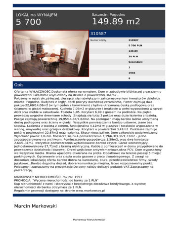 LOKAL na WYNAJEM 5 700 Szczecin, Pogodno 149.89 m2 310587 Numer oferty 310587 5 700 PLN 149.89 38 PLN Secondary 1 1936 6 Opis Oferta na WYŁĄCZNOŚĆ.Doskonała oferta na wynajem. Dom w zabudowie bliźniaczej z garażem o powierzchni 149,89m2 usytuowany na działce o powierzchni 361m2 . Położony w najatrakcyjnieszej, cieszącej się największym zainteresowaniem inwestorów dzielnicy miasta- Pogodno. Budynek z cegły, dach pokryty dachówką ceramiczną. Parter zajmują dwa pokoje-22,69/14,08m2 (w tym jeden z kominkiem) z łądnie utrzymaną deską podłogową oraz ścianami w gładzi malowanej. Kuchnia 7,05m2 w glazurze i terakocie w pełni wyposażona w sprzęt AGD oraz meble w zabudowie. Toaleta 1,05. Korytarz 6,99 z gresem na podłodze. Na piętro prowadzą wygodne drewniane schody. Znajdują się tutaj 3 pokoje oraz duża łazienka z toaletą. Pokoje zajmują powierzchnię 19,95/14,34/7,82m2. Na podłogach mają bardzo ładnie utrzymaną deskę podłogową oraz ściany w gładzi. Wszystkie pomieszczenia bardzo ustawne, jasne bez skosów. Łazienka z toaletą z oknem, funkcjonalna 4,12m2 w glazurze i terakocie wyposażona w wannę, umywalkę oraz grzejnik drabinkowy. Korytarz o powierzchni 3,41m2. Poddasze zajmuje pokój o powierzchni 22,67m2 oraz łazienka. Skosy nieuciążliwe. Dom całkowicie podpiwniczony. Wysokość piwnic 1,8-2m. Mieszczą się tu 4 pomieszczenia 7,19/6,3/3,36/1,33m2 - jedno zagospodarowane na archiwum. Pomieszczenie gospodarcze 3,59m2, oraz dwa korytarze 2,64/1,31m2. wszystkie pomieszczenia wybiałkowane-bardzo czyste. Garaż wolnostojący, jednostanowiskowy-17,71m2 z bramą elektryczną. Każde z pomieszczeń w domu przygotowane do prowadzenia działalności biurowej. Drzwi wejściowe antywłamaniowe,okna PCV. Dom wyposażony we wszystkie media. Brama wjazdowa otwierana na pilota. Dodatkowo na terenie posesji 5 miejsc parkingowych. Ogrzewanie oraz ciepła woda gazowe z pieca dwuobiegowego. Z uwagi na doskonałą lokalizację oferta bardzo dobra na kancelarię, biura, przedstawicielstwo firmy, szkoły językowe...Bardzo dogodny dojazd, dobra komunikacja miejska, łatwo rozpoznawalny punkt. Polecamy i zapraszamy na prezentację.Do ceny należy doliczyć podatek VAT.Zapraszamy na prezentację. MARKOWSCY NIERUCHOMOŚCI, rok zał. 1993 PROMOCJA: "Wycena nieruchomości do banku za 1 PLN" Kup nieruchomość z nami i skorzystaj z bezpłatnego doradztwa kredytowego, a wycenę nieruchomości do banku otrzymasz za 1 PLN. Regulamin promocji dostępny na stronie www.markowscy.pl Marcin Markowski Markowscy Nieruchomości tel. +48 790 333 444 email: [email protected] Markowscy Nieruchomości Powered by TCPDF (www.tcpdf.org)