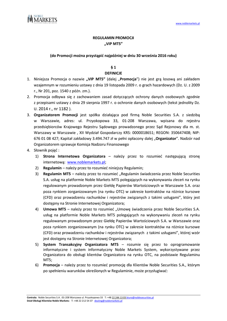 www.noblemarkets.pl REGULAMIN PROMOCJI „VIP MT5” (do Promocji można przystąpić najpóźniej w dniu 30 września 2016 roku) 1. 2. 3. 4. §1 DEFINICJE Niniejsza Promocja o nazwie „VIP MT5” (dalej „Promocja”) nie jest grą losową ani zakładem wzajemnym w rozumieniu ustawy z dnia 19 listopada 2009 r. o grach hazardowych (Dz. U. z 2009 r., Nr 201, poz. 1540 z późn. zm.). Promocja odbywa się z zachowaniem zasad dotyczących ochrony danych osobowych zgodnie z przepisami ustawy z dnia 29 sierpnia 1997 r. o ochronie danych osobowych (tekst jednolity Dz. U. 2014 r., nr 1182 ). Organizatorem Promocji jest spółka działająca pod firmą Noble Securities S.A. z siedzibą w Warszawie, adres: ul. Przyokopowa 33, 01-208 Warszawa, wpisana do rejestru przedsiębiorców Krajowego Rejestru Sądowego prowadzonego przez Sąd Rejonowy dla m. st. Warszawy w Warszawie , XII Wydział Gospodarczy KRS: 0000018651; REGON: 350647408; NIP: 676 01 08 427; Kapitał zakładowy 3.494.747 zł w pełni opłacony dalej „Organizator”. Nadzór nad Organizatorem sprawuje Komisja Nadzoru Finansowego Słownik pojęć : 1) Strona Internetowa Organizatora – należy przez to rozumieć następującą stronę internetową: www.noblemarkets.pl; 2) Regulamin – należy przez to rozumieć niniejszy Regulamin; 3) Regulamin MT5 – należy przez to rozumieć „Regulamin świadczenia przez Noble Securities S.A. usług na platformie Noble Markets MT5 polegających na wykonywaniu zleceń na rynku regulowanym prowadzonym przez Giełdę Papierów Wartościowych w Warszawie S.A. oraz poza rynkiem zorganizowanym (na rynku OTC) w zakresie kontraktów na różnice kursowe (CFD) oraz prowadzeniu rachunków i rejestrów związanych z takimi usługami”, który jest dostępny na Stronie Internetowej Organizatora; 4) Umowa MT5 – należy przez to rozumieć „Umowę świadczenia przez Noble Securities S.A. usług na platformie Noble Markets MT5 polegających na wykonywaniu zleceń na rynku regulowanym prowadzonym przez Giełdę Papierów Wartościowych S.A. w Warszawie oraz poza rynkiem zorganizowanym (na rynku OTC) w zakresie kontraktów na różnice kursowe (CFD) oraz prowadzeniu rachunków i rejestrów związanych z takimi usługami”, której wzór jest dostępny na Stronie Internetowej Organizatora; 5) System Transakcyjny Organizatora MT5 – rozumie się przez to oprogramowanie informatyczne i system informatyczny Noble Markets System, wykorzystywane przez Organizatora do obsługi klientów Organizatora na rynku OTC, na podstawie Regulaminu MT5; 6) Promocja – należy przez to rozumieć promocję dla Klientów Noble Securities S.A., którym po spełnieniu warunków określonych w Regulaminie, może przysługiwać: Centrala: Noble Securities S.A . 01-208 Warszawa ul. Przyokopowa 33 T: +48 22 244 13 03 [email protected] Dział Obsługi Klientów Noble Markets: T: +48 22 212 54 37 [email protected] www.noblemarkets.pl a) zwolnienie z opłaty za przyjęcie przez Organizatora dyspozycji telefonicznej do wystawienia zlecenia transakcyjnego na instrumentach finansowych dostępnych poza rynkiem zorganizowanym (na rynku OTC) w Systemie Transakcyjnym Organizatora oraz zwolnienie z opłaty za wypłatę (przelew lub przeksięgowanie) z Rachunku Pieniężnego Uczestnika środków pieniężnych w wysokości niższej niż 500,00 (słownie: pięćset 00/100) złotych lub b) przekazanie do korzystania na okres 12 (słownie: dwunastu) miesięcy od dnia zawarcia Umowy na rzecz Uczestnika jednego z urządzeń mobilnych wraz z aplikacją mobilną, określonych w Wykazie Urządzeń, stanowiącym Załącznik nr 3 do Regulaminu, dalej zwanego „Urządzeniem”, na warunkach określonych w Regulaminie oraz Umowie o korzystanie lub c) imienna Karta Noble Concierge przyznana Uczestnikowi na okres 12 (słownie: dwunastu) miesięcy od dnia jej wydania, wydana przez Noble Concierge Sp. z o.o. z siedzibą w Warszawie, przy czym Karta Noble Concierge może zostać przyznana Uczestnikowi wyłącznie w przypadku przekazania do korzystania Uczestnikowi Urządzenia i na podstawie stosownego wniosku Uczestnika składanego za pośrednictwem Organizatora, a Uczestnik ma możliwość przedłużenia okresu obowiązywania Karty Noble Concierge po upływie 12 (słownie: dwunastu) miesięcy od jej wydania przez Noble Concierge Sp. z o.o. na podstawie indywidualnych uzgodnień poczynionych z Organizatorem; 7) Okres Przystąpienia do Promocji – należy przez to rozumieć okres, w którym Klient może przystąpić do Promocji, tj. okres począwszy od dnia 1 czerwca 2016 r. (pierwszy dzień Promocji) do dnia 30 września 2016 r. (włącznie z tym dniem, jako ostatnim dniem, w którym można przystąpić do Promocji); 8) Okres Obowiązywania Promocji – należy przez to rozumieć okres, w trakcie którego Uczestnikowi będą przysługiwać prawa i obowiązki wynikające z Promocji, przy czym pierwszym dniem tego okresu jest potwierdzenie przez Organizatora udziału Uczestnika w Promocji stosownie do postanowień § 4 ust. 1 pkt 4 Regulaminu, nie wcześniej jednak niż dzień, w którym Organizator i Uczestnik zawarli Umowę o korzystanie; 9) Uczestnik – należy przez to rozumieć osobę zakwalifikowaną do Promocji przez Organizatora, po spełnieniu warunków określonych w Regulaminie i która nie zostanie wykluczona z Promocji; 10) Rachunek Promocyjny – należy przez to rozumieć otwarty i prowadzony przez Organizatora na rzecz Uczestnika, na podstawie Regulaminu MT5, Rachunek Noble Markets MT5 prowadzony w PLN, służący do zawierania transakcji zgodnie z Regulaminem MT5 i Umową OTC, przy uwzględnieniu postanowień Regulaminu; 11) Oświadczenie – należy przez to rozumieć ustne oświadczenie Uczestnika o przystąpieniu do Promocji lub pisemne oświadczenie Uczestnika o przystąpieniu do Promocji, którego wzór jest określony w Załączniku nr 1 do Regulaminu, zawierające m.in. oświadczenie o deklarowanej wysokości wpłaty środków pienię