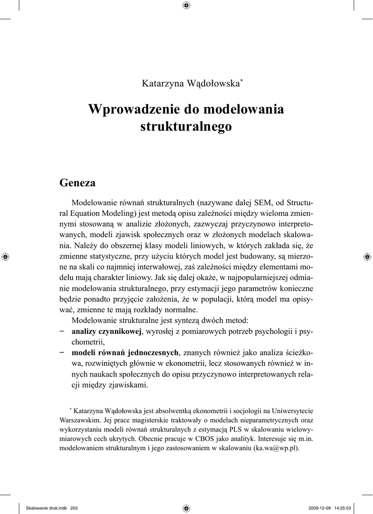 Katarzyna Wądołowska* Wprowadzenie do modelowania strukturalnego Geneza Modelowanie równań strukturalnych (nazywane dalej SEM, od Structural Equation Modeling) jest metodą opisu zależności między wieloma zmiennymi stosowaną w analizie złożonych, zazwyczaj przyczynowo interpretowanych, modeli zjawisk społecznych oraz w złożonych modelach skalowania. Należy do obszernej klasy modeli liniowych, w których zakłada się, że zmienne statystyczne, przy użyciu których model jest budowany, są mierzone na skali co najmniej interwałowej, zaś zależności między elementami modelu mają charakter liniowy. Jak się dalej okaże, w najpopularniejszej odmianie modelowania strukturalnego, przy estymacji jego parametrów konieczne będzie ponadto przyjęcie założenia, że w populacji, którą model ma opisywać, zmienne te mają rozkłady normalne. Modelowanie strukturalne jest syntezą dwóch metod: − analizy czynnikowej, wyrosłej z pomiarowych potrzeb psychologii i psychometrii, − modeli równań jednoczesnych, znanych również jako analiza ścieżkowa, rozwiniętych głównie w ekonometrii, lecz stosowanych również w innych naukach społecznych do opisu przyczynowo interpretowanych relacji między zjawiskami. Katarzyna Wądołowska jest absolwentką ekonometrii i socjologii na Uniwersytecie Warszawskim. Jej prace magisterskie traktowały o modelach nieparametrycznych oraz wykorzystaniu modeli równań strukturalnych z estymacją PLS w skalowaniu wielowymiarowych cech ukrytych. Obecnie pracuje w CBOS jako analityk. Interesuje się m.in. modelowaniem strukturalnym i jego zastosowaniem w skalowaniu ([email protected]). * Skalowanie druk.indb 203 2009-12-09 14:25:53 204 Katarzyna Wądołowska Omówimy teraz pokrótce oba źródła inspiracji, których syntezą jest metodologia SEM. Analiza czynnikowa Początki analizy czynnikowej, w formie modelu wspólnych czynników, przypisuje się głównie pracy Spearmana (1904) zajmującej się pomiarem i opisem struktury zdolności umysłowych (Kaplan 2009: 2–3). Zakładał on, że obserwowalne zależności statystyczne między różnymi testami zdolności umysłowych mogą być wyjaśnione przez ogólny czynnik zdolności wspólny dla wszystkich testów oraz specyficzne czynniki zdolności powiązane z każdym z testów. Celem analizy czynnikowej jest ustalenie udziału obojga rodzajów czynników (traktowanych jako zmienne ukryte), w zmienności obserwowalnych testów1. Ustalenie udziałów czynników wspólnych i swoistych w zmienności obserwowalnych wskaźników pozwala na oszacowanie ich wartości. Od tego momentu zmienne ukryte stają się konstruktami. Czynnikowej składowej modelu strukturalnego, nazywanej składową pomiarową, towarzyszy składowa przyczynowa, w której relacje między konstruktami opisuje się przy użyciu równań jednoczesnych. Równania takie są domeną analizy ścieżkowej. Analiza ścieżkowa Druga ze składowych modeli strukturalnych, analiza ścieżkowa, ma swe początki w pracach Sewalla Wrighta (1918). Jego głównym wkładem było przedstawienie za pomocą diagramu ścieżkowego sposobu, w jaki korelacje pomiędzy zmiennymi mogą być powiązane z parametrami modelu (Kaplan 2009: 3–4). Następnie pokazał on, jak równania modelu można wykorzystać do estymacji efektu bezpośredniego, pośredniego oraz całkowitego jednej zmiennej na inną. Podstawy analizy czynnikowej szczegółowo omawia tekst Andrzeja Szarkowskiego, zaś praktyczne problemy jej stosowania jako narzędzia wspomagającego skalowanie porusza artykuł Mariusza Grzędy (przyp. – HB). 1 Skalowanie druk.indb 204 2009-12-09 14:25:53 Wprowadzenie do modelowania strukturalnego 205 Druga linia rozwoju analizy ścieżkowej wiąże się z ekonometrycznymi pracami Haavelmo (1943). Był on zainteresowany modelowaniem współzależności pomiędzy zmiennymi ekonomicznymi za pomocą systemu równań jednoczesnych, w którym grupę zmiennych zależnych wyjaśnia się za pomocą innych zmiennych zależnych oraz zmiennych niezależnych zaproponowanych w modelu. Modelowanie strukturalne obejmuje oba rodzaje analizy ścieżkowej i pozwala na analizę równań jednoczesnych z wieloma zmiennymi zależnymi (Bollen i Long 1993). SEM Synteza czynnikowego i ścieżkowego podejścia do modelowania złożonych zjawisk społecznych w jedną spójną metodę jest dziełem Karla Jöreskoga (1973) i jego uczniów. Wedle Jöreskoga model równań strukturalnych składa się z dwóch części: − części pomiarowej, łączącej zmienne obserwowalne z ukrytymi poprzez konfirmacyjny model pomiarowy − oraz części strukturalnej, łączącej ze sobą zmienne ukryte za pomocą systemu równań jednoczesnych. Ważnym elementem modelu strukturalnego są błędy pomiaru dla wszystkich typów zmiennych występujących w modelu. W modelowaniu strukturalnym w wersji Jöreskoga szacowanie parametrów modelu odbywa się przy użyciu estymatorów największej wiarogodności (Maximum Likelihood Estimators MLE). W przypadku, gdy model nie zakłada błędów pomiaru dla zmiennych obserwowalnych, redukuje się do modelu równań jednoczesnych rozwiniętego w ekonometrii. Podsumowując, równania strukturalne zajmują się opisem zależności pomiędzy zmiennymi obserwowalnymi przy użyciu mniejszej liczby zmiennych ukrytych. Relacje między obserwowalnymi wskaźnikami a konstruktami oraz między konstruktami opisywane są przy użyciu parametrów strukturalnych modelu. Są one hipotezą, przy użyciu której usiłuje się jak najdokładniej zrekonstruować zależności między zmiennymi obserwowalnymi. Jej testowanie polega na weryfikacji hipotez na temat parametrów pomiarowych (czynnikowych) oraz strukturalnych (ścieżkowych) składowej modelu (Jöreskog 1993). Test taki polega, naj- Skalowanie druk.indb 205 2009-12-09 14:25:53 206 Katarzyna Wądołowska ogólniej biorąc, na zbadaniu, czy zależności między zmiennymi obserwowalnymi zrekonstruowane przy użyciu