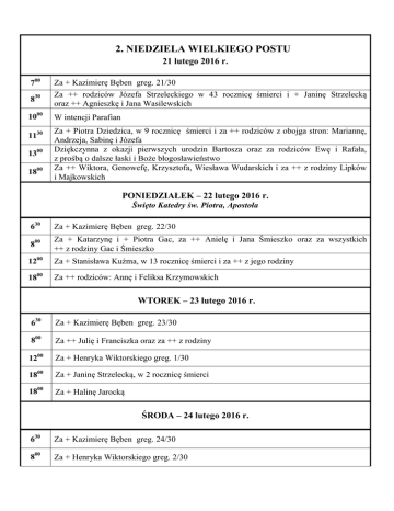 2. NIEDZIELA WIELKIEGO POSTU 21 lutego 2016 r. 700 830 1000 1130 1300 1800 Za + Kazimierę Bęben greg. 21/30 Za ++ rodziców Józefa Strzeleckiego w 43 rocznicę śmierci i + Janinę Strzelecką oraz ++ Agnieszkę i Jana Wasilewskich W intencji Parafian Za + Piotra Dziedzica, w 9 rocznicę śmierci i za ++ rodziców z obojga stron: Mariannę, Andrzeja, Sabinę i Józefa Dziękczynna z okazji pierwszych urodzin Bartosza oraz za rodziców Ewę i Rafała, z prośbą o dalsze łaski i Boże błogosławieństwo Za ++ Wiktora, Genowefę, Krzysztofa, Wiesława Wudarskich i za ++ z rodziny Lipków i Majkowskich PONIEDZIAŁEK – 22 lutego 2016 r. Święto Katedry św. Piotra, Apostoła 630 Za + Kazimierę Bęben greg. 22/30 800 Za + Katarzynę i + Piotra Gac, za ++ Anielę i Jana Śmieszko oraz za wszystkich ++ z rodziny Gac i Śmieszko 1200 Za + Stanisława Kuźma, w 13 rocznicę śmierci i za ++ z jego rodziny 1800 Za ++ rodziców: Annę i Feliksa Krzymowskich WTOREK – 23 lutego 2016 r. 630 Za + Kazimierę Bęben greg. 23/30 800 Za ++ Julię i Franciszka oraz za ++ z rodziny 1200 Za + Henryka Wiktorskiego greg. 1/30 1800 Za + Janinę Strzelecką, w 2 rocznicę śmierci 1800 Za + Halinę Jarocką ŚRODA – 24 lutego 2016 r. 630 Za + Kazimierę Bęben greg. 24/30 800 Za + Henryka Wiktorskiego greg. 2/30 1200 Dziękczynna w 77 rocznicę urodzin Janiny i 58 rocznicę urodzin Jolanty 1800 Msza św. Wspólnotowa CZWARTEK – 25 lutego 2016 r. 630 Za + Kazimierę Bęben greg. 25/30 800 Za + Henryka Wiktorskiego greg. 3/30 1200 Za + Franciszkę Zielińską w 25 rocznicę śmierci oraz za ++ z rodziny Zielińskich i Filipiak Za ++ Edwarda, Andrzeja, Józefę, Helenę, Wincentego, Zygfryda i Stanisławę Barańczyków oraz za ++ Stefanię, Józefa, Helenę, Jana, Stefana, Stanisława i Irenę, Stanisławę Dworaków, za + Stanisława Wierzbickiego i za rodzinę Musiałów 1800 PIĄTEK – 26 lutego 2016 r. 630 Za + Kazimierę Bęben greg. 26/30 800 Za + Henryka Wiktorskiego greg. 4/30 1200 Za ++ z rodziny Gilewskich: Czesława i Helenę oraz + Czesława w 4 rocznicę śmierci, prosząc o łaskę nieba 1800 Za ++ Aleksandrę i Romana Wolak SOBOTA – 27 lutego 2016 r. 630 800 1200 1800 Za + Kazimierę Bęben greg. 27/30 Za ++ z Żywego Różańca oraz za ++ kapłanów i siostry zakonne pracujących w naszej parafii W intencji wszystkich członków Rycerstwa Niepokalanej o łaskę gorliwości w modlitwie i Boże błogosławieństwo Za + Henryka Wiktorskiego greg. 5/30