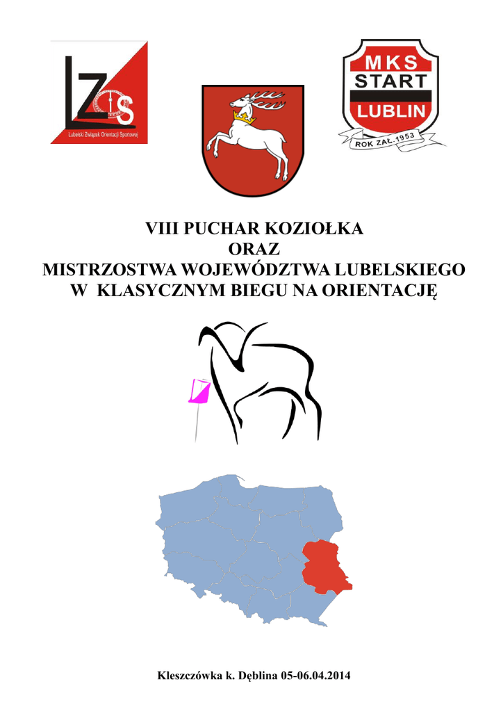 VIII PUCHAR KOZIOŁKA ORAZ MISTRZOSTWA WOJEWÓDZTWA LUBELSKIEGO W KLASYCZNYM BIEGU NA ORIENTACJĘ Kleszczówka k. Dęblina 05-06.04.2014 VIII PUCHAR KOZIOŁKA ORAZ MISTRZOSTWA WOJEWÓDZTWA LUBELSKIEGO W KLASYCZNYM BIEGU NA ORIENTACJĘ ORGANIZATOR: Lubelski Związek Orientacji Sportowej Miejski Klub Sportowy „START” Lublin ZESPÓŁ ORGANIZACYJNY: Kierownik zawodów – Wojciech ŻYCKI Sędzia główny – Waldemar SIKORA S-3 Budowniczy tras – Mirosław TARNOWSKI- BT1; RANGA I FORMA ZAWODÓW: A – RTZ rankingowe wsp. 0,8 (2 biegi). Mistrzostwa Województwa Lubelskiego w klasycznym BnO - klasyfikacja po jednym biegu. VIII Puchar Koziołka –o klasyfikacji końcowej decyduje suma czasów dwóch biegów. TERMIN I MIEJSCE: 05.04-06.04.2014 r. KLESZCZÓWKA k. DĘBLINA START: 05.04.2014 r. (sobota) godz. 11.30 (bieg klasyczny) 06.04.2014 r. (niedziela) godz. 10.00 (bieg średniodystansowy) KATEGORIE WIEKOWE: K/M -10 NR, 10, 12, 14, 16, 18, 20, 21, 35, 40, 45, 50, 55, 60, 65+, OPEN 1- trasa popularyzacyjna OPEN R – trasa rodzinna (drużynowa) - (w przypadku małej ilości zgłoszeń kategorie będą łączone). POTWIERDZANIE PK: W zawodach zastosowany zostanie system SportIdent. Prosimy o podanie numerów chipów w zgłoszeniu. Koszt wypożyczenie chipa za jeden bieg – 3 zł. Zagubienie chipa organizatora -120 zł. BIURO I CENTRUM ZAWODÓW: 05-06.04.2014 r. godz. 10.30-11.15 (Kleszczówka k. Dęblina – północny skraj miejscowości (przy jeziorze) (GPS N:51°34'5,27” E:21°54'42'83” – dojazd wyznaczony od centrum miejscowości Kleszczówka. Dojazd z Dęblina ; skręcić na Bobrowniki do miejscowości Kleszczówka. Od centrum miejscowości Kleszczówka dojazd wyznaczony. Dojazd z Warszawy i Lublina – skręcić na Dęblin, następnie do Bobrownik i dalej na Dęblin do miejscowości Kleszczówka. Od centrum miejscowości Kleszczówka dojazd wyznaczony. MAPY: „KLESZCZÓWKA 2014” skala 1:10000 i 1:15 000; warstwice co – 2,5m; aktualizacja: - jesuień, zima 2013/2014 r. Autorzy mapy: M Tarnowski, W Sikora, B i H Szuryga; CHARAKTERYSTYKA TERENU: Bieg średniodystansowy i klasyczny: Teren pofałdowany, o lekko utrudnionej przebieżności, pocięty dużą ilością dróg. ZGŁOSZENIA: do dnia 01.04.2014 r. na adres: [email protected] , podając: imię i nazwisko, kategorie wiekową, rok urodzenia, klub – instytucja , numer chipa, w przypadku posiadania numer licencji PZOS. OPŁATA STARTOWA: Kategorie K/M10 do K/M16 - 15 zł, pozostali 25 zł za 2 biegi. Opłata za pojedynczy bieg w kategoria K/M10 do K/M16 – 10zł, pozostali 12zł. Zgłoszenia po terminie za dodatkowa opłatą 5zł za bieg. NAGRODY: Dyplomy dla najlepszych 3 zawodników w każdej kategorii wiekowej. ZAKOŃCZENIE ZAWODÓW: 06.04.2014 r. (niedziela) godz. 12.30 ZAKWATEROWANIE: Istnieje możliwość noclegu na sali gimnastycznej – (z własnym materacem i śpiworem) - w cenie 12 zł os. Zapotrzebowanie na zakwaterowanie proszę podać w zgłoszeniu do dnia 01.04.2014r. UWAGI: Zawodnicy zrzeszeni w klubach zobowiązani są do posiadania ważnych badań lekarskich. Pozostali uczestnicy zawodów zostaną dopuszczeni do startu: - do 18 lat wymagana jest pisemna zgoda rodziców; - pozostali uczestnicy na własną odpowiedzialność. Uczestnicy zawodów ubezpieczają się we własnym zakresie.