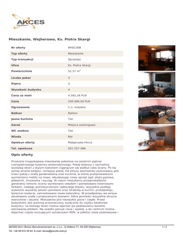 Mieszkanie, Wejherowo, Ks. Piotra Skargi Nr oferty RH01308 Typ oferty Mieszkanie Typ transakcji Sprzedaż Ulica Ks. Piotra Skargi Powierzchnia 52.57 m2 Liczba pokoi 3 Piętro 4 Wysokość budynku 4 Cena za metr 4 565,34 PLN Cena 240 000,00 PLN Ogrzewanie C.o. miejskie Balkon Balkon Jasna kuchnia Tak Garaż Miejsce parkingowe WC osobno Tak Winda Nie Opiekun oferty Małgorzata Hinca Tel. opiekuna 501 557 486 Opis oferty Przytulne trzypokojowe mieszkanie położone na ostatnim piętrze czeropietrowego budynku wielorodzinnego. Pokój dzienny z zachodnią wystawą okien z dużym bakonem ciągnącym się wzdłuż całej ściany. Po tej samej stronie kolejny- mniejszy pokój. Od strony wschodniej usytuowany jest trzeci pokój z szafą garderobianą oraz kuchnia, w której przeprowadzono wymieniono meble na nowe, wbudowując nowy sprzęt agd: płyta gazowa, piekarnik, zmywarka i wyciąg. W całym mieszkaniu przeprowadzono generalny remont; ściany wyrównano cekolem i pomalowano kolorowymi farbami, nadając pomieszczeniom radosnego blasku, wszystkie podłogi wyłożono wysokiej jakości panelami oraz terakotą w kuchni, przedpokoju , łaziencei toalecie, zamontowano nowe kaloryfery. W przedpokoju we wnęce zbudowano szafę z przesuwnymi dzwiami, która pomieści wszystkie okrycie wierzchnie i obuwie. Mieszaknie jest niezwykle jasne i ciepłe. Przed budynkiem jest parking przeznaczony wyłącznie do użytku lokatorów budynku, na którego teren można wjechać po podniesieniu barierki sterowanej pilotem. Na osiedlu panuje cisza i spokój, a do centrum można dojechać często kursującymi autobusami MZK, w pobliżu szoła podstawowa i AKCES Dom Obrotu Nieruchomosciami sp. z o.o., Ul.Hallera 7/1, 84-200 Wejherowo Tel. +48 58 672 49 84, E-mail: [email protected] 1/2 liceum, przedszkola, centra handlowe, przychodnia lekarska oraz rzeka i piękny las dla spacerowiczów. Zapraszam. AKCES Dom Obrotu Nieruchomosciami sp. z o.o., Ul.Hallera 7/1, 84-200 Wejherowo Tel. +48 58 672 49 84, E-mail: [email protected] 2/2