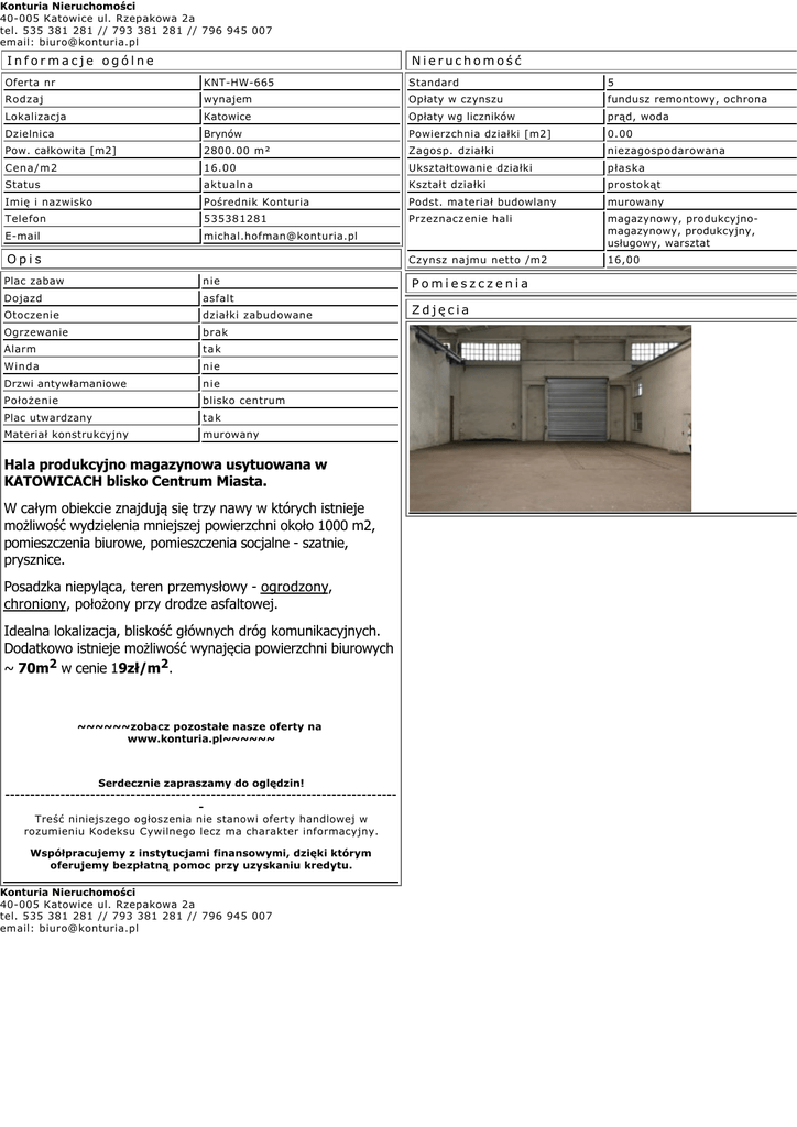 Konturia Nieruchomości 40-005 Katowice ul. Rzepakowa 2a tel. 535 381 281 // 793 381 281 // 796 945 007 email: [email protected] Informacje ogólne Nieruchomość Oferta nr KNT-HW-665 Standard 5 Rodzaj wynajem Opłaty w czynszu fundusz remontowy, ochrona Lokalizacja Katowice Opłaty wg liczników prąd, woda Dzielnica Brynów Powierzchnia działki [m2] 0.00 Pow. całkowita [m2] 2800.00 m² Zagosp. działki niezagospodarowana Cena/m2 16.00 Ukształtowanie działki płaska Status aktualna Kształt działki prostokąt Imię i nazwisko Pośrednik Konturia Podst. materiał budowlany murowany Telefon 535381281 Przeznaczenie hali E-mail [email protected] magazynowy, produkcyjnomagazynowy, produkcyjny, usługowy, warsztat Czynsz najmu netto /m2 16,00 Opis Plac zabaw nie Dojazd asfalt Otoczenie działki zabudowane Ogrzewanie brak Alarm tak Winda nie Drzwi antywłamaniowe nie Położenie blisko centrum Plac utwardzany tak Materiał konstrukcyjny murowany Hala produkcyjno magazynowa usytuowana w KATOWICACH blisko Centrum Miasta. W całym obiekcie znajdują się trzy nawy w których istnieje możliwość wydzielenia mniejszej powierzchni około 1000 m2, pomieszczenia biurowe, pomieszczenia socjalne - szatnie, prysznice. Posadzka niepyląca, teren przemysłowy - ogrodzony, chroniony, położony przy drodze asfaltowej. Idealna lokalizacja, bliskość głównych dróg komunikacyjnych. Dodatkowo istnieje możliwość wynajęcia powierzchni biurowych ~ 70m2 w cenie 19zł/m2. ~~~~~~zobacz pozostałe nasze oferty na www.konturia.pl~~~~~~ Serdecznie zapraszamy do oględzin! -----------------------------------------------------------------------------Treść niniejszego ogłoszenia nie stanowi oferty handlowej w rozumieniu Kodeksu Cywilnego lecz ma charakter informacyjny. Współpracujemy z instytucjami finansowymi, dzięki którym oferujemy bezpłatną pomoc przy uzyskaniu kredytu. Konturia Nieruchomości 40-005 Katowice ul. Rzepakowa 2a tel. 535 381 281 // 793 381 281 // 796 945 007 email: [email protected] Pomieszczenia Zdjęcia