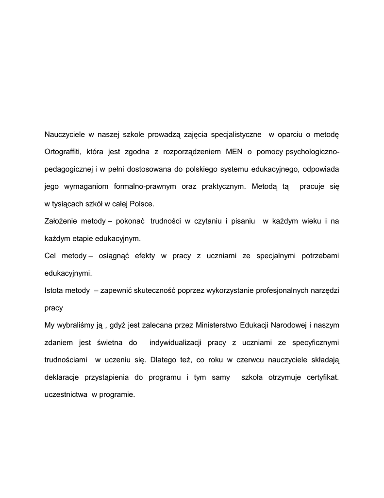 Nauczyciele w naszej szkole prowadzą zajęcia specjalistyczne w oparciu o metodę Ortograffiti, która jest zgodna z rozporządzeniem MEN o pomocy psychologicznopedagogicznej i w pełni dostosowana do polskiego systemu edukacyjnego, odpowiada jego wymaganiom formalno-prawnym oraz praktycznym. Metodą tą pracuje się w tysiącach szkół w całej Polsce. Założenie metody – pokonać trudności w czytaniu i pisaniu w każdym wieku i na każdym etapie edukacyjnym. Cel metody – osiągnąć efekty w pracy z uczniami ze specjalnymi potrzebami edukacyjnymi. Istota metody – zapewnić skuteczność poprzez wykorzystanie profesjonalnych narzędzi pracy My wybraliśmy ją , gdyż jest zalecana przez Ministerstwo Edukacji Narodowej i naszym zdaniem jest świetna do trudnościami indywidualizacji pracy z uczniami ze specyficznymi w uczeniu się. Dlatego też, co roku w czerwcu nauczyciele składają deklaracje przystąpienia do programu i tym samy uczestnictwa w programie. szkoła otrzymuje certyfikat.