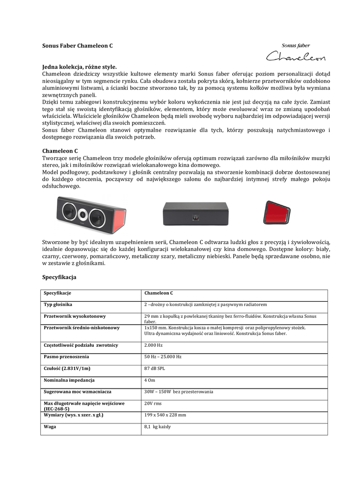 Sonus Faber Chameleon C Jedna kolekcja, różne style. Chameleon dziedziczy wszystkie kultowe elementy marki Sonus faber oferując poziom personalizacji dotąd nieosiągalny w tym segmencie rynku. Cała obudowa została pokryta skórą, kołnierze przetworników ozdobiono aluminiowymi listwami, a ścianki boczne stworzono tak, by za pomocą systemu kołków możliwa była wymiana zewnętrznych paneli. Dzięki temu zabiegowi konstrukcyjnemu wybór koloru wykończenia nie jest już decyzją na całe życie. Zamiast tego stał się swoistą identyfikacją głośników, elementem, który może ewoluować wraz ze zmianą upodobań właściciela. Właściciele głośników Chameleon będą mieli swobodę wyboru najbardziej im odpowiadającej wersji stylistycznej, właściwej dla swoich pomieszczeń. Sonus faber Chameleon stanowi optymalne rozwiązanie dla tych, którzy poszukują natychmiastowego i dostępnego rozwiązania dla swoich potrzeb. Chameleon C Tworzące serię Chameleon trzy modele głośników oferują optimum rozwiązań zarówno dla miłośników muzyki stereo, jak i miłośników rozwiązań wielokanałowego kina domowego. Model podłogowy, podstawkowy i głośnik centralny pozwalają na stworzenie kombinacji dobrze dostosowanej do każdego otoczenia, począwszy od największego salonu do najbardziej intymnej strefy małego pokoju odsłuchowego. Stworzone by być idealnym uzupełnieniem serii, Chameleon C odtwarza ludzki głos z precyzją i żywiołowością, idealnie dopasowując się do każdej konfiguracji wielokanałowej czy kina domowego. Dostępne kolory: biały, czarny, czerwony, pomarańczowy, metaliczny szary, metaliczny niebieski. Panele będą sprzedawane osobno, nie w zestawie z głośnikami. Specyfikacja Specyfikacje Chameleon C Typ głośnika Częstotliwość podziału zwrotnicy 2 –drożny o konstrukcji zamkniętej z pasywnym radiatorem 29 mm z kopułką z powlekanej tkaniny bez ferro-‐fluidów. Konstrukcja własna Sonus faber. 1x150 mm. Konstrukcja kosza o małej kompresji oraz polipropylenowy stożek. Ultra dynamiczna wydajność oraz liniowość. Konstrukcja Sonus faber. 2.000 Hz Pasmo przenoszenia 50 Hz – 25.000 Hz Czułość (2.831V/1m) 87 dB SPL Nominalna impedancja 4 Om Sugerowana moc wzmacniacza 30W – 150W bez przesterowania Max długotrwałe napięcie wejściowe (IEC-‐268-‐5) Wymiary (wys. x szer. x gł.) 20V rms Waga 8,1 kg każdy Przetwornik wysokotonowy Przetwornik średnio-‐niskotonowy 199 x 540 x 228 mm