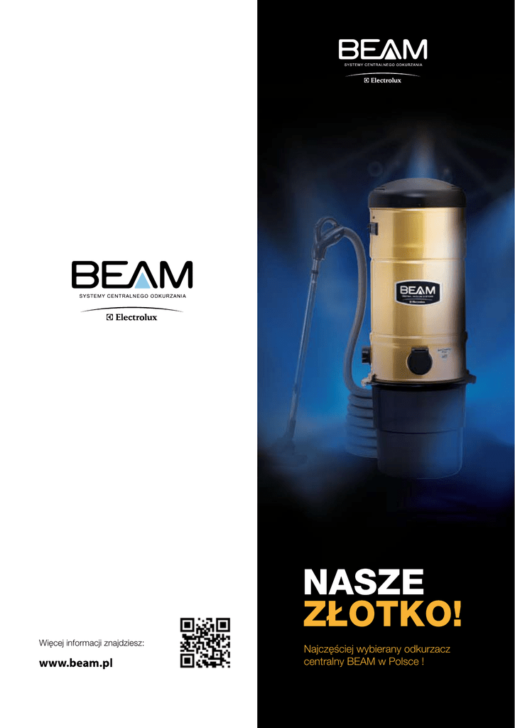 Więcej informacji znajdziesz: Najczęściej wybierany odkurzacz centralny BEAM w Polsce ! Najczęściej wybierany odkurzacz centralny BEAM w Polsce ! Niech nikogo nie zwiedzie jego elegancki wygląd. To nie jest tylko ładny odkurzacz. Wydajny silnik, duża moc ssąca oraz samooczyszczający się filtr sprawiają, że jest to nasz najlepiej sprzedający się odkurzacz centralny. Teraz jeszcze taniej! Kup odkurzacz centralny BEAM SC335 w edycji GOLD w trakcie trwania promocji*, a oszczędzisz aż 300 zł ! Szczegóły na www.beam.pl Nasze ZŁOTKO to same zalety: • najczęściej wybierany przez Klientów model na świecie • unikalny samooczyszczający się filtr, który nie wymaga żadnej obsługi • gniazdo w obudowie pozwala na sprzątanie np. garażu • duży pojemnik na zanieczyszczenia opróżnia się co 3-4 miesiące • wysoce skuteczna filtracja dzięki technologii separacji cyklonicznej wraz z filtrem materiałowym GORE-TEX • przyjazny dla alergików więcej zalet na www.beam.pl Dzięki zastosowaniu separacji cyklonicznej wraz z filtrem samooczyszczającym się GORE ® siła ssąca odkurzacza nie zmniejsza się po zapełnieniu zbiornika na kurz, jak ma to miejsce w tradycyjnych odkurzaczach przenośnych. Możesz korzystać z pełnej mocy przez cały czas odkurzania. ! Z RA TE ** ! j ie tan Teraz tylko 2 555 zł * Czas trwania promocji: od 20.02.2012 do wyczerpania zapasów przeznaczonych na promocję. ** w porównaniu do ceny regularnej