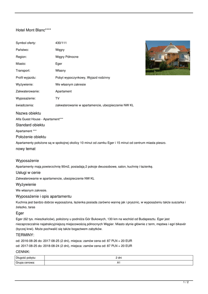 Hotel Mont Blanc**** Symbol oferty: 430/111 Państwo: Węgry Region: Węgry Północne Miasto: Eger Transport: Własny Profil wyjazdu: Pobyt wypoczynkowy, Wyjazd rodzinny Wyżywienie: We własnym zakresie Zakwaterowanie: Apartament Wyposażenie: TV świadczenia: zakwaterowanie w apartamencie, ubezpieczenie NW KL Nazwa obiektu Alfa Guest House - Apartament*** Standard obiektu Apartament *** Położenie obiektu Apartamenty położone są w spokojnej okolicy 10 minut od zamku Eger i 15 minut od centrum miasta pieszo. nowy temat Wyposażenie Apartamenty mają powierzchnię 90m2, posiadają 2 pokoje dwuosobowe, salon, kuchnię i łazienkę. Usługi w cenie Zakwaterowanie w apartamencie, ubezpieczenie NW KL Wyżywienie We własnym zakresie. Wyposażenie i opis apartamentu Kuchnia jest bardzo dobrze wyposażona, łazienka posiada zarówno wannę jak i prysznic, w wyposażeniu także suszarka i żelazko, taras Eger Eger (62 tys. mieszkańców), położony u podnóża Gór Bukowych, 130 km na wschód od Budapesztu. Eger jest niezaprzeczalnie najatrakcyjniejszą miejscowością północnych Węgier. Miasto słynie głównie z term, męstwa i egri bikavér (byczej krwi). Może pochwalić się także bogactwem zabytków. TERMINY: od: 2016-08-26 do: 2017-08-25 (2 dni), miejsca: zamów cena od: 87 PLN = 20 EUR od: 2017-08-25 do: 2018-08-24 (2 dni), miejsca: zamów cena od: 87 PLN = 20 EUR CENNIK: Długość pobytu: 2 dni Grupa cenowa: A1 1/2 Pobyt w obiekcie (do wyboru) (*) apartament 6-osobowy standardowo dla osób: 6 Ubezpieczenie (do wyboru) (*) ubezpieczenie NW, KL 78 7 Waluta: EUR Aktualne ceny z systemu S.A.R.T. (-) - cena usługi, podatku kalkulowana przy osobie lub gratis (*) - kwota wliczona w cenę standardową 2/2