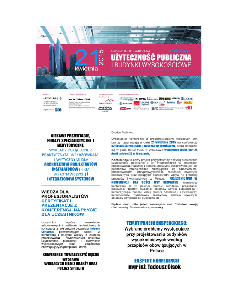 CIEKAWE PREZENTACJE, POKAZY, SPECJALISTYCZNE I MERYTORYCZNE WYKŁADY'POŁĄCZONE'Z' PRAKTYCZNYMI'WSKAZÓWKAMI 'I'WYTYCZNYMI'DLA' ARCHITEKTÓW, PROJEKTANTÓW INSTALATORÓW (FIRM' WYKONAWCZYCH) i INTEGRATORÓW SYSTEMÓW WIEDZA DLA PROFESJONALISTÓW CERTYFIKAT I PREZENTACJE Z KONFERENCJI NA PŁYCIE DLA UCZESTNIKÓW Uczestnicy oprócz materiałów szkoleniowych i możliwości indywidualnych konsultacji z ekspertami otrzymają imienny Certyfikat potwierdzający udział w konferencji i nabycie wiedzy z zakresu projektowania i wykonawstwa obiektów użyteczności publicznej i budynków wysokościowych oraz znajomości obowiązujących przepisów i norm. KONFERENCJI TOWARZYSZYĆ BĘDZIE WYSTAWA WIODĄCYCH FIRM Z BRANŻY ORAZ POKAZY SPRZĘTU Drodzy Państwo, Organizator konferencji z przedstawicielami wiodących firm branży \ zapraszają w dniu 21 kwietnia 2015 na konferencją UŻYTECZNOŚĆ PUBLICZNA I BUDYNKI WYSOKOŚCIOWE, która odbędzie się w godz. 09:00-16:30 w Warszawie w biurowcu FOCUS przy Al.' Armii Ludowej 26 w Warszawie. Konferencja to nowy projekt przygotowany z myślą o obiektach użyteczności publicznej i ich infrastrukturze w procesach projektowania, realizacji i oddania do użytku i skierowana jest do podmiotów profesjonalnie zajmujących się planowaniem, projektowaniem, przygotowywaniem, realizacją inwestycji budowlanych oraz mających bezpośredni wpływ na przebieg UCZESTNICTWO W procesów inwestycyjnych w Polsce. KONFERENCJI DLA GOŚCI JEST BEZPŁATNE.. Uczestnicy konferencji to w głównej mierze: architekci, projektanci, kierownicy działów inwestycji obiektów użytku publicznego i komercyjnego, handlu, usług (centra handlowe), deweloperzy, konstruktorzy, wykonawcy, kierownicy działów inwestycji obiektów użyteczności publicznej itp. Będzie nam miło jeżeli zaszczycie nas Państwo swoją obecnością. Serdecznie zapraszamy ' TEMAT PANELU EKSPERCKIEGO: Wybrane problemy występujące przy projektowaniu budynków wysokościowych według przepisów obowiązujących w Polsce EKSPERT KONFERENCJI mgr inż. Tadeusz Cisek Projektujesz? Kierujesz budową? Zarządzasz obiektami i ich bezpieczeństwem? Prowadzisz aktualnie inwestycje? Opiniujesz i nadzorujesz odbiory? Chcesz skonsultować projekt? Jesteś Integratorem Systemów? Jeśli tak to, ta konferencja jest dla Ciebie! Zapraszamy na pierwsze w tym roku, specjalistyczne i bezpłatne szkolenie organizowane z myślą o uczestnikach procesu budowlanego. Uczestnictwo w Konferencji JEST BEZPŁATNE DECYDUJE KOLEJNOŚĆ ZGŁOSZEŃ Zgłoś Udział i Odbierz Certyfikat! W programie konferencji najnowsze systemy, rozwiązania oraz wytyczne projektowe i montażowe dla projektantów i instalatorów Rzeczoznawca' ds.' zabezpieczeń' przeciwpożarowych,' VNce' Prezydent' Stowarzyszenia' Inżynierów' Bezpieczeństwa' Pożarowego.' Znawca& tematu& w& zakresie& projektowania& i& opiniowania& budynków& wysokościowych. & Miejsce konferencji Biurowiec FOCUS przy Al. Armii Ludowej 26 w Warszawie ' Konferencja' odbędzie' się' w' budynku' biurowym' Focus' w' Warszawie,' który' m.in.' uzyskał' certyfikat' zrównoważonego' budownictwa' BREEAM' InNUse' z' oceną'bardzo'dobrą'(Very'Good).'BREEAM'InNUse'jest'jednym'z'najczęściej' stosowanych' systemów' oceny' jakości' istniejących' budynków' w' Europie' i' wyznacza' standardy' najlepszych' praktyk' w' zrównoważonej' budowie' i' eksploatacji' nieruchomości.' Uzyskany' przez' budynek' Focus' zielony' certyfikat' jest' potwierdzeniem' wysokiego' standardu' nieruchomości,' zastosowanych' w' nim' nowoczesnych' technologii' oraz' jakości' zarządzania.' Energooszczędne' rozwiązania' i' proekologiczne' inicjatywy' podejmowane' przez' właściciela' budynku' mają' na' celu' zapewnienie' jak' najwyższego' komfortu' najemcom.' Focus' został' zaprojektowany' przez' architektów' z' warszawskiej' pracowni' APA' Kuryłowicz' &' Associates.' Otrzymał' wiele' presażowych' nagród' (m.in.' Nagrodę' Główną' SARP' 2001,' a' także' zdobył' pierwsze'miejsce'w'Warszawie'i'drugie'miejsce'w'Polsce'w'kategorii'Office' of'the'Year'w'konkursie'Eurobuild'Awards'2012).'Architektonicznie,'jest' to' jeden' z' ciekawszych' budynków' w' Polsce.' Świetnie' położony,' przy' Trasie' Łazienkowskiej,'5'minut'drogi'od'wszystkich'systemów'komunikacji'miejskiej' N' linii' autobusowych,' tramwajowych' i' metra.' Najbliższa' stacja' metra' N' Politechnika.' Lotnisko' znajduje' się' w' odległości' 15' minut' jazdy' samochodem,' a' dworzec' kolejowy' (Warszawa' Centralna)' w' odległości' 5' minut. ' ' ' Agenda Podczas 4 sesji konferencji zostaną omówione zagadnienia z wielu powiązanych ze sobą dziedzin . Konferencja ma charakter szkoleniowy porusza zatem zagadnienia nie tylko od strony merytorycznej ale i praktycznego zastosowania w procesie projektowania czy wykonawstwa realizowanej inwestycji. Wydarzenie' to' będzie' stanowiło' wyjątkowe' spotkanie' przedstawicieli' sektora' budowlanego.' Podczas' niego' będą' Państwo' mieli' okazję' do' poszerzenia' swojej' wiedzy' między' innymi'na'poniższe'tematy. Sesja III – 13.25-14.50 Tematy wykładów: 1. 2. 3. 4. 5. Nowoczesne rozwiązania do poprawy jakości energii elektrycznej Pomiary i kamery termowizyjne w utrzymaniu ruchu i budownictwie Wielopunktowy i wielogazowy system detekcji CO/LPG/NOZ w garażach i parkingach podziemnych Zaawansowane narzędzia do projektowania z wykorzystaniem bezpłatnych narzędzi dostarczonych przez producenta - ArchiCAD 18 BIM Components Zabezpieczenia budynków wysokościowych za pomocą instalacji gaśniczych mgłowych niskociśnieniowych typu Eacon Aqua 13.05 Dyskusja panelowa 14.50 Dyskusja panelowa 14.55-15.00 Przerwa kawowa, ekspozycja wystawców, porady techniczne i wytyczne projektowe Układ programu 09.00-09.40 Rejestracja Uczestników. Rozdanie materiałów szkoleniowych Sesja I – 09.40-11.15 - Tematy wykładów: 1. Aspekt techniczny i ekonomiczny Sesja III – 15.00-16.00 PANEL EKSPERCK