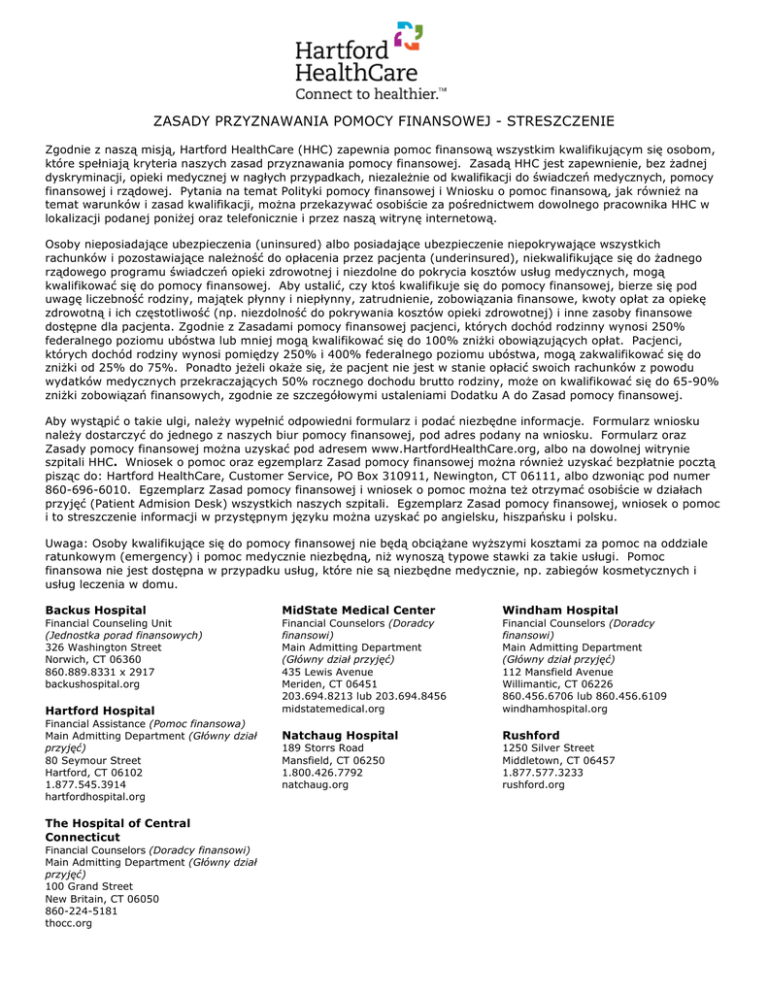 ZASADY PRZYZNAWANIA POMOCY FINANSOWEJ - STRESZCZENIE Zgodnie z naszą misją, Hartford HealthCare (HHC) zapewnia pomoc finansową wszystkim kwalifikującym się osobom, które spełniają kryteria naszych zasad przyznawania pomocy finansowej. Zasadą HHC jest zapewnienie, bez żadnej dyskryminacji, opieki medycznej w nagłych przypadkach, niezależnie od kwalifikacji do świadczeń medycznych, pomocy finansowej i rządowej. Pytania na temat Polityki pomocy finansowej i Wniosku o pomoc finansową, jak również na temat warunków i zasad kwalifikacji, można przekazywać osobiście za pośrednictwem dowolnego pracownika HHC w lokalizacji podanej poniżej oraz telefonicznie i przez naszą witrynę internetową. Osoby nieposiadające ubezpieczenia (uninsured) albo posiadające ubezpieczenie niepokrywające wszystkich rachunków i pozostawiające należność do opłacenia przez pacjenta (underinsured), niekwalifikujące się do żadnego rządowego programu świadczeń opieki zdrowotnej i niezdolne do pokrycia kosztów usług medycznych, mogą kwalifikować się do pomocy finansowej. Aby ustalić, czy ktoś kwalifikuje się do pomocy finansowej, bierze się pod uwagę liczebność rodziny, majątek płynny i niepłynny, zatrudnienie, zobowiązania finansowe, kwoty opłat za opiekę zdrowotną i ich częstotliwość (np. niezdolność do pokrywania kosztów opieki zdrowotnej) i inne zasoby finansowe dostępne dla pacjenta. Zgodnie z Zasadami pomocy finansowej pacjenci, których dochód rodzinny wynosi 250% federalnego poziomu ubóstwa lub mniej mogą kwalifikować się do 100% zniżki obowiązujących opłat. Pacjenci, których dochód rodziny wynosi pomiędzy 250% i 400% federalnego poziomu ubóstwa, mogą zakwalifikować się do zniżki od 25% do 75%. Ponadto jeżeli okaże się, że pacjent nie jest w stanie opłacić swoich rachunków z powodu wydatków medycznych przekraczających 50% rocznego dochodu brutto rodziny, może on kwalifikować się do 65-90% zniżki zobowiązań finansowych, zgodnie ze szczegółowymi ustaleniami Dodatku A do Zasad pomocy finansowej. Aby wystąpić o takie ulgi, należy wypełnić odpowiedni formularz i podać niezbędne informacje. Formularz wniosku należy dostarczyć do jednego z naszych biur pomocy finansowej, pod adres podany na wniosku. Formularz oraz Zasady pomocy finansowej można uzyskać pod adresem www.HartfordHealthCare.org, albo na dowolnej witrynie szpitali HHC. Wniosek o pomoc oraz egzemplarz Zasad pomocy finansowej można również uzyskać bezpłatnie pocztą pisząc do: Hartford HealthCare, Customer Service, PO Box 310911, Newington, CT 06111, albo dzwoniąc pod numer 860-696-6010. Egzemplarz Zasad pomocy finansowej i wniosek o pomoc można też otrzymać osobiście w działach przyjęć (Patient Admision Desk) wszystkich naszych szpitali. Egzemplarz Zasad pomocy finansowej, wniosek o pomoc i to streszczenie informacji w przystępnym języku można uzyskać po angielsku, hiszpańsku i polsku. Uwaga: Osoby kwalifikujące się do pomocy finansowej nie będą obciążane wyższymi kosztami za pomoc na oddziale ratunkowym (emergency) i pomoc medycznie niezbędną, niż wynoszą typowe stawki za takie usługi. Pomoc finansowa nie jest dostępna w przypadku usług, które nie są niezbędne medycznie, np. zabiegów kosmetycznych i usług leczenia w domu. Backus Hospital MidState Medical Center Windham Hospital Financial Counseling Unit (Jednostka porad finansowych) 326 Washington Street Norwich, CT 06360 860.889.8331 x 2917 backushospital.org Financial Counselors (Doradcy finansowi) Main Admitting Department (Główny dział przyjęć) 435 Lewis Avenue Meriden, CT 06451 203.694.8213 lub 203.694.8456 midstatemedical.org Financial Counselors (Doradcy finansowi) Main Admitting Department (Główny dział przyjęć) 112 Mansfield Avenue Willimantic, CT 06226 860.456.6706 lub 860.456.6109 windhamhospital.org Natchaug Hospital Rushford 189 Storrs Road Mansfield, CT 06250 1.800.426.7792 natchaug.org 1250 Silver Street Middletown, CT 06457 1.877.577.3233 rushford.org Hartford Hospital Financial Assistance (Pomoc finansowa) Main Admitting Department (Główny dział przyjęć) 80 Seymour Street Hartford, CT 06102 1.877.545.3914 hartfordhospital.org The Hospital of Central Connecticut Financial Counselors (Doradcy finansowi) Main Admitting Department (Główny dział przyjęć) 100 Grand Street New Britain, CT 06050 860-224-5181 thocc.org