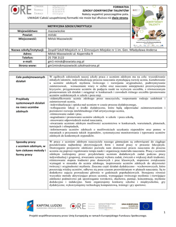 FORMATKA SZKOŁY ODKRYWCÓW TALENTÓW Należy wypełnić poszczególne pola. UWAGA! Całość uzupełnionej formatki nie może być dłuższa niż dwie strony. METRYCZKA SZKOŁY/INSTYTUCJI Województwo: Powiat: Miejscowość: Nazwa szkoły/instytucji: Adres: Telefon: e-mail: Strona www: Cele podejmowanych działań Przykłady systemowych działań na rzecz uczniów zdolnych Sposoby pracy z uczniem zdolnym, w tym ciekawe metody i formy pracy mazowieckie miński Mińsk Mazowiecki Zespół Szkół Miejskich nr 1 Gimnazjum Miejskie nr 1 im. Gen. Władysława Andersa Mińsk Mazowiecki ul. Kopernika 9 25 758 2122 [email protected] gm1minskmazowiecki.szkolnastrona.pl W ogólnych założeniach naszej szkoły praca z uczniem zdolnym ma na celu: wyszukiwanie młodych talentów, indywidualizację procesu nauczania stymulującą rozwój ucznia, kształtowanie u uczniów zdolnych myślenia twórczego i rozwijania oryginalności, podtrzymywanie zainteresowań, wzmacnianie wiary w siebie oraz nauczanie umiejętności przezwyciężania kryzysów, przygotowanie uczniów do podjęcia nauki na wyższym szczeblu, z równoczesnym promowaniem ich działań i osiągnięć w konkursach i zawodach różnego szczebla (promowanie uczniów uzdolnionych w szkole i poza nią). -zidentyfikowanie ucznia zdolnego przez nauczyciela, rozpoznanie rodzaju uzdolnień i zainteresowań ucznia, -indywidualizacja i opieka nad uczniem w czasie procesu dydaktycznego, -wzbogacenie lekcji o środki dydaktyczne, które będą odpowiadać zainteresowaniom i poziomowi rozwoju intelektualnego i/lub artystycznego ucznia, -różnicowanie zadań i prac, -nagradzanie i promowanie uczniów zdolnych w szkole i poza szkołą, -stosowanie odpowiednich metod nauczania, -stwarzanie uczniom zdolnym możliwości uczestnictwa w konkursach, warsztatach, plenerach, turniejach i olimpiadach, -informowanie uczniów zdolnych o możliwościach uzyskania stypendiów oraz pomoc w staraniach o przyznanie takich stypendiów, systematyczne monitorowanie i typowanie uczniów zdolnych do konkretnych stypendiów. W pracy z uczniem zdolnym nauczyciele naszego gimnazjum są zobowiązani do ciągłego poszukiwania najbardziej aktywizujących form i metod pracy w procesie lekcyjnym. Dostrzeganie przejawów zdolności pozwala nam dostosować proces nauczania do procesu uczenia się poprzez regulowanie tempa nauki i organizację materiału nauczania. Pracę z uczniem zdolnym realizujemy przez: przydzielanie uczniom dodatkowych zadań podczas pracy indywidualnej i grupowej, stwarzanie sytuacji wyboru zadań, ćwiczeń o większej skali trudności, różnicowanie stopnia trudności prac domowych i prac klasowych, stopniowe zwiększanie wymagań w stosunku do ucznia zdolnego, inspirowanie uczniów zdolnych do aktywności twórczej i oryginalności myślenia. Znaczna część działań dydaktyczno - wychowawczych, które poszerzają wiedzę uczniów, odbywa się poza czasem przewidzianym w planach nauczania. Są to dodatkowe zajęcia prowadzone głównie w godzinach popołudniowych. Stosujemy również wszystkie metody aktywizujące proces uczenia, wymagające twórczego myślenia i rozwijające zdolności podstawowe jak spostrzeganie wzrokowe, słuchowe, pamięć, koncentrację, myślenie dedukcyjne i indukcyjne. Sami organizujemy konkursy szkolne i międzyszkolne, gry dydaktyczne, wykorzystujemy technologię komputerową, treningi i gry sportowe. 1 Projekt współfinansowany przez Unię Europejską w ramach Europejskiego Funduszu Społecznego. Przykłady indywidualizacji i różnicowania treści, metod, form pracy z uczniem zdolnym Efekty pracy (m.in. osiągnięcia uczniów) Czy szkoła posiada Szkolny System Wspierania Zdolności i Talentów? (jeśli tak, proszę w kilku zdaniach przedstawić jego zalety) Współpraca z innymi osobami/ instytucjami działającymi na rzecz ucznia zdolnego Przykładem pracy nauczycieli naszego gimnazjum w roku szkolnym 2012/2013 z uczniami zdolnymi jest wdrażanie innowacji pedagogicznych: z języka angielskiego - „Living in a global village – komunikacja bez barier językowych” i wychowania fizycznego - „Uczeń wykształcony fizycznie”. Gimnazjum jest organizatorem Powiatowego Konkursu Języka Angielskiego dla Gimnazjalistów (odbyły się cztery edycje). Organizujemy również konkurs „Cichy Bohater” (sześć edycji) adresowany do uczniów szkół podstawowych i gimnazjalnych z terenu miasta. Kolejnym przykładem indywidualizacji i różnicowania treści, metod, form pracy z uczniem zdolnym jest utworzenie od 1 września 2012 roku klasy sportowej o specjalnościach: piłka siatkowa (dziewczęta) i piłka nożna (chłopcy). Ponadto nasi uczniowie pracują samodzielnie nad zagadnieniami wykraczającymi poza program nauczania. Opracowują zagadnienia, przygotowują proste doświadczenia i prezentują wyniki na forum. Korzystają ze wskazanych przez nauczyciela źródeł i literatury, poszukują i selekcjonują materiały. Tworzą prezentacje multimedialne, edytują zdjęcia. Indywidualizacja nauki na lekcjach odbywa się również poprzez powierzanie roli lidera grupy, rozwiązywanie trudniejszych zadań w ramach omawianego zagadnienia. Nauczyciele motywują uczniów do samodzielnego uczestnictwa w wydarzeniach pozaszkolnych, takich jak spotkania z ciekawymi ludźmi, wystawy, warsztaty, konkursy i turnieje sportowe. Nasi uczniowie wykazują postawy twórcze i samodzielność w korzystaniu z różnych źródeł informacji, zgłaszają własne pomysły działań, dokumentują, interpretują i prezentują wyniki doświadczeń i obserwacji, odnoszą sukcesy w konkursach, zawodach i warsztatach. Wymiernymi efektami pracy są m.in. plakaty i foldery promujące szkołę, miasto czy własne sukcesy, prezentacje multimedialne publikowane na stronie internetowej szkoły i miasta, jak również artykuły w prasie lokalnej. Wszystkie osiągnięcia gimnazjalistów są prezentowane na bieżąco na stronie internetowej szkoły. Nie, trwają
