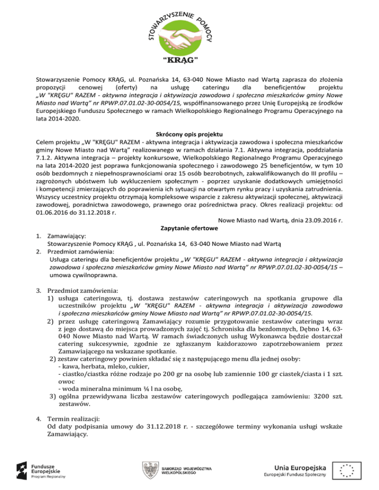Stowarzyszenie Pomocy KRĄG, ul. Poznańska 14, 63-040 Nowe Miasto nad Wartą zaprasza do złożenia propozycji cenowej (oferty) na usługę cateringu dla beneficjentów projektu „W "KRĘGU" RAZEM - aktywna integracja i aktywizacja zawodowa i społeczna mieszkańców gminy Nowe Miasto nad Wartą” nr RPWP.07.01.02-30-0054/15, współfinansowanego przez Unię Europejską ze środków Europejskiego Funduszu Społecznego w ramach Wielkopolskiego Regionalnego Programu Operacyjnego na lata 2014-2020. Skrócony opis projektu Celem projektu „W "KRĘGU" RAZEM - aktywna integracja i aktywizacja zawodowa i społeczna mieszkańców gminy Nowe Miasto nad Wartą” realizowanego w ramach działania 7.1. Aktywna integracja, poddziałania 7.1.2. Aktywna integracja – projekty konkursowe, Wielkopolskiego Regionalnego Programu Operacyjnego na lata 2014-2020 jest poprawa funkcjonowania społecznego i zawodowego 25 beneficjentów, w tym 10 osób bezdomnych z niepełnosprawnościami oraz 15 osób bezrobotnych, zakwalifikowanych do III profilu – zagrożonych ubóstwem lub wykluczeniem społecznym - poprzez uzyskanie dodatkowych umiejętności i kompetencji zmierzających do poprawienia ich sytuacji na otwartym rynku pracy i uzyskania zatrudnienia. Wszyscy uczestnicy projektu otrzymają kompleksowe wsparcie z zakresu aktywizacji społecznej, aktywizacji zawodowej, poradnictwa zawodowego, prawnego oraz pośrednictwa pracy. Okres realizacji projektu: od 01.06.2016 do 31.12.2018 r. Nowe Miasto nad Wartą, dnia 23.09.2016 r. Zapytanie ofertowe 1. Zamawiający: Stowarzyszenie Pomocy KRĄG , ul. Poznańska 14, 63-040 Nowe Miasto nad Wartą 2. Przedmiot zamówienia: Usługa cateringu dla beneficjentów projektu „W "KRĘGU" RAZEM - aktywna integracja i aktywizacja zawodowa i społeczna mieszkańców gminy Nowe Miasto nad Wartą” nr RPWP.07.01.02-30-0054/15 – umowa cywilnoprawna. 3. Przedmiot zamówienia: 1) usługa cateringowa, tj. dostawa zestawów cateringowych na spotkania grupowe dla uczestników projektu „W "KRĘGU" RAZEM - aktywna integracja i aktywizacja zawodowa i społeczna mieszkańców gminy Nowe Miasto nad Wartą” nr RPWP.07.01.02-30-0054/15. 2) przez usługę cateringową Zamawiający rozumie przygotowanie zestawów cateringu wraz z jego dostawą do miejsca prowadzonych zajęć tj. Schroniska dla bezdomnych, Dębno 14, 63040 Nowe Miasto nad Wartą. W ramach świadczonych usług Wykonawca będzie dostarczał catering sukcesywnie, zgodnie ze zgłaszanym każdorazowo zapotrzebowaniem przez Zamawiającego na wskazane spotkanie. 2) zestaw cateringowy powinien składać się z następującego menu dla jednej osoby: - kawa, herbata, mleko, cukier, - ciastko/ciastka różne rodzaje po 200 gr na osobę lub zamiennie 100 gr ciastek/ciasta i 1 szt. owoc - woda mineralna minimum ¼ l na osobę, 3) ogólna przewidywana liczba zestawów cateringowych podlegająca zamówieniu: 3200 szt. zestawów. 4. Termin realizacji: Od daty podpisania umowy do 31.12.2018 r. - szczegółowe terminy wykonania usługi wskaże Zamawiający. 5. Miejsce realizacji zamówienia: Schronisko dla bezdomnych w Dębnie. 6. Opis przygotowania oferty cenowej: a) ofertę należy dostarczyć do Stowarzyszenia Pomocy KRĄG, ul. Poznańska 14, 63-040 Nowe Miasto nad Wartą osobiście lub drogą elektroniczną na adres: [email protected] do dnia 30 września 2016 r. b) propozycję cenową należy złożyć na formularzu stanowiącym załącznik do zapytania. 6. Kryteria oceny oferty: a) Cena – 100%: Ocenie podlega cena (w złotych brutto) wynikająca z formularza cenowego, stanowiącego Załącznik do niniejszego zapytania. Cena powinna być podana w złotych wraz ze wszystkimi należnymi podatkami i obciążeniami. b) Sposób dokonania oceny oferty według kryterium „Cena”: Punkty przyznane za kryterium cena będą liczone wg. wzoru: C=(Cmin:C0) x 100, gdzie: C – liczba punktów, Cmin - najniższa cena spośród ważnych ofert, C0 – cena badanej oferty. Maksymalna liczba punktów do uzyskania przez Wykonawcę – 100. W przypadku złożenia kilku ofert o takiej samej liczbie punktów, o wyborze oferty decydować będzie Zamawiający po przeprowadzeniu rozmów z oferentami. c) Warunki udziału w postępowaniu: O udzielenie Zamówienia mogą ubiegać się Wykonawcy, którzy nie są powiązani osobowo lub kapitałowo z Zamawiającym. 7. Zamawiający dokona oceny spełniania przez wykonawcę warunku udziału w postępowaniu na zasadzie spełnia/nie spełnia, na podstawie oświadczenia złożonego przez wykonawcę wraz z ofertą. 8. Informacje dotyczące wyboru najkorzystniejszej oferty: O wyborze najkorzystniejszej oferty Zamawiający zawiadomi wybranego oferenta. Jeśli oferent, którego oferta została wybrana, uchyli się od zawarcia umowy, Zamawiający może wybrać ofertę najkorzystniejszą spośród pozostałych ofert. 9. Zapytania o przedmiot zamówienia: Wszelkich informacji dotyczących przedmiotu zamówienia udziela Iwona Rutkowska - Krause, tel. 660 323 138, e-mail: [email protected]. 10. Niniejsze zapytanie prowadzone jest w ramach procedury konkurencyjności i nie stanowi zobowiązania do zawarcia umowy.